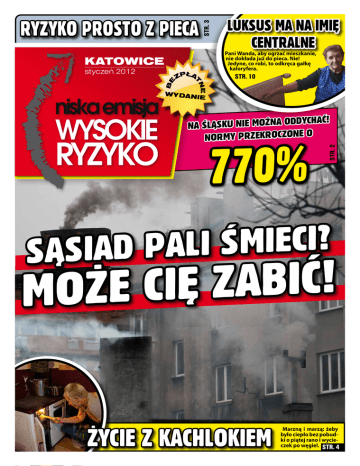 STR. 3 RYZYKO prosto z pieca Pani Wanda, aby ogrzać mieszkanie, nie dokłada już do pieca. Nie! Jedyne, co robi, to odkręca gałkę kaloryfera. KATOWICE Ł ZP A NE T BE styczeń 2012 Luksus ma na imię centralne STR. 10 WY DAN IE 770% STR. 2 ać! ch y d d o a n ż o m ie n u k s Na Ślą o Normy przekroczone ? i c e i m ś i l a p d a i s ą S ! ć i b a z ę i C e ż o M Życie z kaCHlokiem Marzną i marzą: żeby było ciepło bez pobudki o piątej rano i wycieczek po węgiel. STR. 4 www.niskaemisja-wysokieryzyko.pl 2 START KAMPANII K ampania „Niska emisja – Wysokie ryzyko” rozpoczęła się 9 listopada 2011 r. od konferencji prasowej. O niskiej emisji opowiadali: Joanna Schmid, Wiceprezes Zarządu ds. strategii i rozwoju TAURON Polska Energia, Gabriela Lenartowicz – Prezes Wojewódzkiego Funduszu Ochrony Środowiska i Gospodarki Wodnej w Katowicach oraz Prezes Zarządu Dyrektor Naczelny TAURON Ciepło – Henryk Borczyk. DM Najwyższy czas powiedzieć: dość! Spalamy Superjednostkę śmieci Z komentarze Gabriela Lenartowicz, Prezes Zarządu Wojewódzkiego Funduszu Ochrony Środowiska i Gospodarki Wodnej w Katowicach: Kampania „Niska emisja – Wysokie ryzyko”, którą dofinansowuje Wojewódzki Fundusz Ochrony Środowiska i Gospodarki Wodnej w Katowicach, to kolejna wspierana przez nas akcja informująca mieszkańców o zagrożeniach wynikających z braku troski o środowisko naturalne. Wierzymy, że dzięki szeroko zakrojonym działaniom przeprowadzanym w różnych środowiskach tym tematem zainteresują się mieszkańcy województwa śląskiego, zwłaszcza dużych miast, w których zagrożenie niską emisją jest dziś największe i najgroźniejsze. Bywają przecież dni, kiedy w naszych miastach z powodu zanieczyszczenia powietrza nie można swobodnie oddychać. Myślę, że efektem akcji będzie społeczny sprzeciw wobec spalania śmieci i węgla niskiej jakości w starych, nieekologicznych piecach. Chcemy, aby wszyscy wiedzieli, czym jest niska emisja. Dlaczego? Bo problem dotyczy nie jakichś dalekich sąsiadów, lecz bezpośrednio nas samych i naszych najbliższych. styczeń 2012 trudem łapiecie oddech? W gardle gryzie? I w końcu modlicie się o katar, byle tylko nie czuć wpadającego do domu smrodu? Znak, że sezon grzewczy w pełni. Potrwa jeszcze kilka miesięcy. To kilka miesięcy z czarnym dymem nad Śląskiem. Właśnie dlatego Grupa Tauron, przy wsparciu finansowym Wojewódzkiego Funduszu Ochrony Środowiska i Gospodarki Wodnej w Katowicach, rozpoczęła kampanię „Niska emisja – Wysokie ryzyko”. To pierwsza w Polsce kampania skierowana bezpośrednio do Was, drodzy Czytelnicy, mieszkańców domów wielorodzinnych. Po co? Bo niska emisja, czyli dym, który wydostaje się z domowych kominów, to ryzyko. Ryzykujemy to, co najcenniejsze: zdrowie swoje i bliskich, bo dym jest trujący. Jak bardzo? Tak, że od wdychania go boli głowa, mamy alergię, łzawią nam oczy – a to tylko początek. Długotrwałe wdychanie oparów uszkadza wątrobę, zwiększa ryzyko zachorowania na raka i zagrożenie bezpłodnością. Lista chorób, które wywołuje niska emisja, jest znacznie dłuższa. Co najmniej taka, jak kolejki do lekarzy. Nie straszymy Was. Fakty mówią same za siebie. Mieszkańcy Śląska i Zagłębia biją niechlubne rekordy w spalaniu śmieci. Jak wynika z badań, co trzeci mieszkaniec Górnego Śląska i Zagłębia ogrzewający mieszkanie piecem węglowym przyznaje wprost, że pali odpady. To oznacza, że w 200 tysiącach domów wielorodzinnych piec służy jako śmietnik. Blisko 70 procent ankietowanych uważa, że w taki sam sposób śmieci pozbywa się większość sąsiadów. Tym sposobem rocznie w domowych piecach Górnoślązaków i Zagłębiaków znika góra odpadków większa niż katowicka Superjednostka (największy blok mieszkalny na południu Polski!). Tymczasem jest alternatywa. Korzysta z niej 15 milionów Polaków! To sieć ciepłownicza: bezpieczna, ekologiczna, wygodna i oszczędna. Poprzez sieć do Waszych domów może być dostarczane ciepło z elektrociepłowni. Poczujecie je w kaloryferach. Nie macie ich? Ale możecie mieć! Jak? Czytajcie na kolejnych stronach. DM Rproystozyz pkieoca Superjednostka to największy blok mieszkalny na południu Polski. Na szczęście sam ma centralne ogrzewanie. Norma przekroczona siedem razy! Stężenia szkodliwych substancji przekroczone o 400, a w nocy nawet o 770%! – doniósł w listopadzie Wojewódzki Inspektorat Ochrony Środowiska w Katowicach. Specjaliści radzą: lepiej zostańcie w domu. Na Śląsku codziennie odnotowuje przekroczenia norm ustalonych dla szkodliwego stężenia pyłów zawieszonych. Jednak tak źle nie było już dawno. W nocy normy zoKATOWICE stają przekroczone nawet siedmiokrotnie. Lekarze nie mają wątpliwości – taka sytuacja zagraża zdrowiu człowieka, a szczególnie dzieciom, ludziom starszym oraz astmatykom. Specjaliści radzą również, aby ograniczyć przebywanie na świeżym powietrzu, które do tej pory przecież zawsze było receptą na lepsze zdrowie. DM Redakcja styczeń 2012 Projekt współfinansowany przez: Wydawca: Publikacja wyprodukowana w ramach kampanii „Niska emisja – wysokie ryzyko” e-mail: [email protected] Redaktorzy prowadzący: Ina Martela, Daniel Muc Skład i opracowanie graficzne: Bogusław Tomża Druk: Polskapresse Sp. z o.o., Oddział Poligrafia, Drukarnia w Sosnowcu 3 28 tys. Polaków zmarło z powodu nie za cz yszczenia powietrza w 2003 roku Wrzucasz codziennie do pieca śmieci? A może odór wydostający się z komina Twojego sąsiada nie pozwala Ci wywietrzyć mieszkania? Jeśli tak, koniecznie przeczytaj ten tekst! W idzicie za oknem czarny dym? To sezon grzewczy w pełni. Dym bywa czarny, zielony, a nawet żółty. Jest też trujący. – Ja mam astmę, syn wymiotował od wdychania tego brudu – żali się pani Hermina z katowickiego Załęża. – Rozumiem, że ludzie chcą mieć ciepło, ale czemu ja też mam wdycha