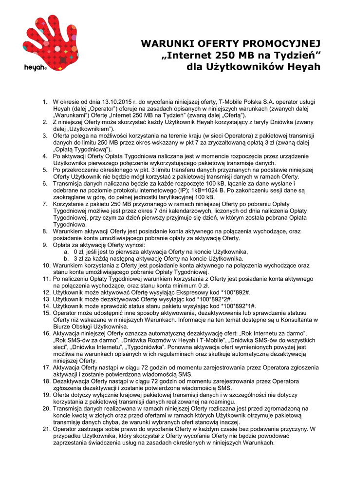 WARUNKI OFERTY PROMOCYJNEJ „Internet 250 MB na Tydzień” dla Użytkowników Heyah 1. W okresie od dnia 13.10.2015 r. do wycofania niniejszej oferty, T-Mobile Polska S.A. operator usługi Heyah (dalej „Operator”) oferuje na zasadach opisanych w niniejszych warunkach (zwanych dalej „Warunkami”) Ofertę „Internet 250 MB na Tydzień” (zwaną dalej „Ofertą”). 2. Z niniejszej Oferty może skorzystać każdy Użytkownik Heyah korzystający z taryfy Dniówka (zwany dalej „Użytkownikiem”). 3. Oferta polega na możliwości korzystania na terenie kraju (w sieci Operatora) z pakietowej transmisji danych do limitu 250 MB przez okres wskazany w pkt 7 za zryczałtowaną opłatą 3 zł (zwaną dalej „Opłatą Tygodniową”). 4. Po aktywacji Oferty Opłata Tygodniowa naliczana jest w momencie rozpoczęcia przez urządzenie Użytkownika pierwszego połączenia wykorzystującego pakietową transmisję danych. 5. Po przekroczeniu określonego w pkt. 3 limitu transferu danych przyznanych na podstawie niniejszej Oferty Użytkownik nie będzie mógł korzystać z pakietowej transmisji danych w ramach Oferty. 6. Transmisja danych naliczana będzie za każde rozpoczęte 100 kB, łącznie za dane wysłane i odebrane na poziomie protokołu internetowego (IP); 1kB=1024 B. Po zakończeniu sesji dane są zaokrąglane w górę, do pełnej jednostki taryfikacyjnej 100 kB. 7. Korzystanie z pakietu 250 MB przyznanego w ramach niniejszej Oferty po pobraniu Opłaty Tygodniowej możliwe jest przez okres 7 dni kalendarzowych, liczonych od dnia naliczenia Opłaty Tygodniowej, przy czym za dzień pierwszy przyjmuje się dzień, w którym została pobrana Opłata Tygodniowa. 8. Warunkiem aktywacji Oferty jest posiadanie konta aktywnego na połączenia wychodzące, oraz posiadanie konta umożliwiającego pobranie opłaty za aktywację Oferty. 9. Opłata za aktywację Oferty wynosi: a. 0 zł, jeśli jest to pierwsza aktywacja Oferty na koncie Użytkownika, b. 3 zł za każdą następną aktywację Oferty na koncie Użytkownika. 10. Warunkiem korzystania z Oferty jest posiadanie konta aktywnego na połączenia wychodzące oraz stanu konta umożliwiającego pobranie Opłaty Tygodniowej. 11. Po naliczeniu Opłaty Tygodniowej warunkiem korzystania z Oferty jest posiadanie konta aktywnego na połączenia wychodzące, oraz stanu konta minimum 0 zł. 12. Użytkownik może aktywować Ofertę wysyłając Ekspresowy kod *100*892#. 13. Użytkownik może dezaktywować Ofertę wysyłając kod *100*892*2#. 14. Użytkownik może sprawdzić status stanu pakietu wysyłając kod *100*892*1#. 15. Operator może udostępnić inne sposoby aktywowania, dezaktywowania lub sprawdzenia statusu Oferty niż wskazane w niniejszych Warunkach. Informacje na ten temat dostępne są u Konsultanta w Biurze Obsługi Użytkownika. 16. Aktywacja niniejszej Oferty oznacza automatyczną dezaktywację ofert: „Rok Internetu za darmo”, „Rok SMS-ów za darmo”, „Dniówka Rozmów w Heyah i T-Mobile”, „Dniówka SMS-ów do wszystkich sieci”, „Dniówka Internetu”, „Tygodniówka”. Ponowna aktywacja ofert wymienionych powyżej jest możliwa na warunkach opisanych w ich regulaminach oraz skutkuje automatyczną dezaktywacją niniejszej Oferty. 17. Aktywacja Oferty nastąpi w ciągu 72 godzin od momentu zarejestrowania przez Operatora zgłoszenia aktywacji i zostanie potwierdzona wiadomością SMS. 18. Dezaktywacja Oferty nastąpi w ciągu 72 godzin od momentu zarejestrowania przez Operatora zgłoszenia dezaktywacji i zostanie potwierdzona wiadomością SMS. 19. Oferta dotyczy wyłącznie krajowej pakietowej transmisji danych i w szczególności nie dotyczy korzystania z pakietowej transmisji danych realizowanej na roamingu. 20. Transmisja danych realizowana w ramach niniejszej Oferty rozliczana jest przed zgromadzoną na koncie kwotą w złotych oraz przed ofertami w ramach których Użytkownik otrzymuje pakietową transmisję danych chyba, że warunki wybranych ofert stanowią inaczej. 21. Operator zastrzega sobie prawo do wycofania Oferty w każdym czasie bez podawania przyczyny. W przypadku Użytkownika, który skorzystał z Oferty wycofanie Oferty nie będzie powodować zaprzestania świadczenia usług na zasadach określonych w niniejszych Warunkach. 22. Podane ceny jednostkowe zawierają podatek VAT wyliczony według stawki 23 %. Stan konta oraz wartość poszczególnych połączeń, SMS-ów i usług są wyliczane w oparciu o ceny netto. Przy informowaniu klienta o stanie konta podawana jest kwota obejmująca podatek VAT, zaokrąglona do pełnego grosza. 23. W kwestiach nieuregulowanych niniejszymi Warunkami, zastosowanie mają postanowienia wiążącego Użytkownika regulaminu świadczenia usług telekomunikacyjnych przez Operatora oraz cennika. 24. Użytkownik zobowiązuje się nie używać wydanych mu przez Operatora Kart SIM: a. do generowania automatycznego ruchu, w szczególności ruchu pomiędzy urządzeniami lub automatycznych połączeń pomiędzy urządzeniami a abonentem, b. do wspomagania lub budowania rozwiązań typu „call center”, w tym do wykonywania połączeń telefonicznych w takich rozwiązaniach (nie oznacza to zakazu wykonywania połączeń do call center), ani c. do masowego rozsyłania informacji (SMS lub MMS) przeznaczonych bezpośrednio lub pośrednio do promowania towarów, usług lub wizerunku Użytkownika lub innego podmiotu, jak również przeznaczonych do osiągnięcia jakiegokolwiek innego efektu handlowego (zakaz ten dotyczy Użytkownika działającego jako przedsiębiorca) oraz d. w inny sposób stanowiący rażące naruszenie przepisów prawa lub postanowień Umowy wskazany w wiążącym Użytkownika regulaminie świadczenia usług telekomunikacyjnych.