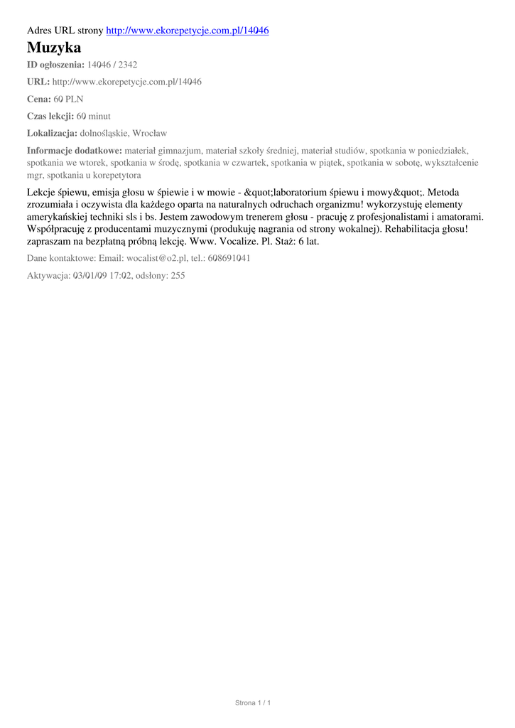 Adres URL strony http://www.ekorepetycje.com.pl/14046 Muzyka ID ogłoszenia: 14046 / 2342 URL: http://www.ekorepetycje.com.pl/14046 Cena: 60 PLN Czas lekcji: 60 minut Lokalizacja: dolnośląskie, Wrocław Informacje dodatkowe: materiał gimnazjum, materiał szkoły średniej, materiał studiów, spotkania w poniedziałek, spotkania we wtorek, spotkania w środę, spotkania w czwartek, spotkania w piątek, spotkania w sobotę, wykształcenie mgr, spotkania u korepetytora Lekcje śpiewu, emisja głosu w śpiewie i w mowie - "laboratorium śpiewu i mowy". Metoda zrozumiała i oczywista dla każdego oparta na naturalnych odruchach organizmu! wykorzystuję elementy amerykańskiej techniki sls i bs. Jestem zawodowym trenerem głosu - pracuję z profesjonalistami i amatorami. Współpracuję z producentami muzycznymi (produkuję nagrania od strony wokalnej). Rehabilitacja głosu! zapraszam na bezpłatną próbną lekcję. Www. Vocalize. Pl. Staż: 6 lat. Dane kontaktowe: Email: [email protected], tel.: 608691041 Aktywacja: 03/01/09 17:02, odsłony: 255 Strona 1 / 1