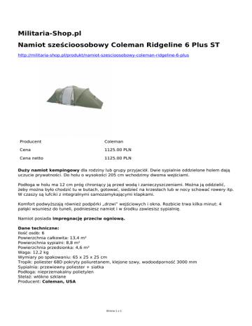 Militaria-Shop.pl Namiot sześcioosobowy Coleman Ridgeline 6 Plus ST http://militaria-shop.pl/produkt/namiot-szescioosobowy-coleman-ridgeline-6-plus Producent Coleman Cena 1125.00 PLN Cena netto 1125.00 PLN Duży namiot kempingowy dla rodziny lub grupy przyjaciół. Dwie sypialnie oddzielone holem dają uczucie prywatności. Do holu o wysokości 205 cm wchodzimy dwoma wejściami. Podłoga w holu ma 12 cm próg chroniący ją przed wodą i zanieczyszczeniami. Można ją oddzielić, żeby można było chodzić tu w butach, gotować, siedzieć na krzesłach lub w nocy schować rowery itp. W czaszy są lufciki z integralnymi samozamykającymi klapkami. Komfort podwyższają również podpórki „drzwi” wejściowych i okna. Rozbicie trwa kilka minut: 4 pałąki wsuniesz do tuneli, podniesiesz namiot i w środku zawiesisz sypialnię. Namiot posiada impregnację przeciw ogniową. Dane techniczne: Ilość osób: 6 Powierzchnia całkowita: 13,4 m² Powierzchnia sypialni: 8,8 m² Powierzchnia przedsionka: 4,6 m² Waga: 12,2 kg Wymiary po spakowaniu: 65 x 25 x 25 cm Tropik: poliester 68D pokryty poliuretanem, klejone szwy, wodoodporność 3000 mm Sypialnia: przewiewny poliester + siatka Podłoga: nieprzemakalny polietylen Stelaż: włókno szklane Producent: Coleman, USA Strona 1 z 1