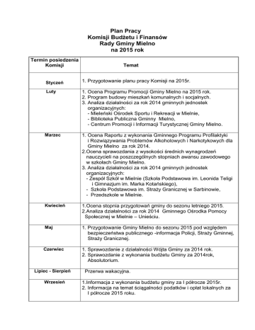 Plan Pracy Komisji Budżetu i Finansów Rady Gminy Mielno na 2015 rok Termin posiedzenia Komisji Temat Styczeń 1. Przygotowanie planu pracy Komisji na 2015r. Luty 1. Ocena Programu Promocji Gminy Mielno na 2015 rok. 2. Program budowy mieszkań komunalnych i socjalnych. 3. Analiza działalności za rok 2014 gminnych jednostek organizacyjnych: - Mieleński Ośrodek Sportu i Rekreacji w Mielnie, - Biblioteka Publiczna Gminny Mielno, - Centrum Promocji i Informacji Turystycznej Gminy Mielno. Marzec 1. Ocena Raportu z wykonania Gminnego Programu Profilaktyki i Rozwiązywania Problemów Alkoholowych i Narkotykowych dla Gminy Mielno za rok 2014. 2.Ocena sprawozdania z wysokości średnich wynagrodzeń nauczycieli na poszczególnych stopniach awansu zawodowego w szkołach Gminy Mielno. 3. Analiza działalności za rok 2014 gminnych jednostek organizacyjnych: - Zespół Szkół w Mielnie (Szkoła Podstawowa im. Leonida Teligi i Gimnazjum im. Marka Kotańskiego), - Szkoła Podstawowa im. Straży Granicznej w Sarbinowie, - Przedszkole w Mielnie. Kwiecień 1.Ocena stopnia przygotowań gminy do sezonu letniego 2015. 2.Analiza działalności za rok 2014 Gminnego Ośrodka Pomocy Społecznej w Mielnie – Unieściu. Maj 1. Przygotowanie Gminy Mielno do sezonu 2015 pod względem bezpieczeństwa publicznego -informacja Policji, Straży Gminnej, Straży Granicznej. Czerwiec 1. Sprawozdanie z działalności Wójta Gminy za 2014 rok. 2. Sprawozdanie z wykonania budżetu Gminy za 2014rok, Absolutorium. Lipiec - Sierpień Wrzesień Przerwa wakacyjna. 1.Informacja z wykonania budżetu gminy za I półrocze 2015r. 2. Informacja na temat ściągalności podatków i opłat lokalnych za I półrocze 2015 roku. Październik 1. Ocena przebiegu sezonu letniego oraz informacja o stanie bezpieczeństwa na terenie gminy w 2015r. 2. Uzyskanie informacji na temat zaciągniętych kredytów i pożyczek oraz udzielonych poręczeniach. Listopad 1. Prace nad projektem budżetu Gminy Mielno na 2016r. 2. Ocena gospodarki zasobem nieruchomości gruntowychdzierżawy, użytkowania, trwały zarząd, sprzedaż na lata 2015 2017. 1. Uchwalenie budżetu Gminy Mielno na 2016 rok. Grudzień Tematy stałe: 1. Uzyskiwanie informacji o funkcjonowaniu bieżącym gminnych jednostek organizacyjnych. 2. Rozpatrywanie i opiniowane projektów uchwał przekazanych do Rady Gminy . 3. Opiniowanie zmian dotyczących budżetu oraz wieloletniego planu finansowego. 4. Opiniowanie wniosków i pism skierowanych do Komisji. 5. Analiza stanu realizacji prowadzonych w gminie inwestycji. 6. Analiza możliwości pozyskiwania zewnętrznych środków pomocowych. Ponadto Komisja zastrzega możliwość dokonywania zmian w planie pracy w trakcie trwania roku. Przewodnicząca Komisji Budżetu i Finansów Ewa Włodyka - 2 - Plan Pracy Komisji Komunalnej i Bezpieczeństwa Publicznego Rady Gminy Mielno na 2015 rok Termin posiedzenia Komisji Temat Styczeń 1. Przygotowanie planu pracy Komisji na 2015r. Luty 1. Ocena Programu Promocji Gminy Mielno na 2015 rok. 2. Program budowy mieszkań komunalnych i socjalnych. Marzec 1. Ocena Raportu z wykonania Gminnego Programu Profilaktyki i Rozwiązywania Problemów Alkoholowych i Narkotykowych dla Gminy Mielno za rok 2014. 2.Sprawdzenie stanu technicznego zejść na plażę – komisja wyjazdowa. Kwiecień 1.Ocena stopnia przygotowań gminy do sezonu letniego 2015. 2. Sprawdzenie stanu technicznego dróg gminnych- komisja Wyjazdowa. 1. Przygotowanie Gminy Mielno do sezonu 2015 pod względem bezpieczeństwa publicznego -informacja Policji, Straży Gminnej, Straży Granicznej. Maj Czerwiec Lipiec - Sierpień 1. Sprawozdanie z działalności Wójta Gminy za 2014 rok. 2. Sprawozdanie z wykonania budżetu Gminy za 2014rok, Absolutorium. Przerwa wakacyjna. Wrzesień 1.Informacja z wykonania budżetu gminy za I półrocze 2015r. 2. Analiza stanu bazy sprzętowo- transportowej Mieleńskiego Ośrodka Sportu i Rekreacji w Mielnie. Październik 1. Ocena przebiegu sezonu letniego oraz informacja o stanie bezpieczeństwa na terenie gminy w 2015r. Listopad 1. Ocena gospodarki zasobem nieruchomości gruntowychdzierżawy, użytkowania, trwały zarząd, sprzedaż na lata 2015 2017. 1. Uchwalenie budżetu Gminy Mielno na 2016 rok. Grudzień Przewodniczący Komisji Leon Rybka Plan Pracy Komisji Spraw Społecznych Rady Gminy Mielno na 2015 rok Termin posiedzenia Komisji Temat Styczeń 1. Przygotowanie planu pracy Komisji na 2015r. Luty 1. Ocena Programu Promocji Gminy Mielno na 2015 rok. 2. Program budowy mieszkań komunalnych i socjalnych. Marzec 1. Ocena Raportu z wykonania Gminnego Programu Profilaktyki i Rozwiązywania Problemów Alkoholowych i Narkotykowych dla Gminy Mielno za rok 2014. Kwiecień 1.Ocena stopnia przygotowań gminy do sezonu letniego 2015. 2. Analiza działalności za rok 2014 Gminnego Ośrodka Pomocy Społecznej w Mielnie – Unieściu. Maj 1. Przygotowanie Gminy Mielno do sezonu 2015 pod względem bezpieczeństwa publicznego -informacja Policji, Straży Gminnej, Straży Granicznej. Czerwiec 1. Sprawozdanie z działalności Wójta Gminy za 2014 rok. 2. Sprawozdanie z wykonania budżetu Gminy za 2014rok, Absolutorium. Lipiec - Sierpień Wrzesień Październik Przerwa wakacyjna. 1. Informacja z wykonania budżetu gminy za I półrocze 2015r. 2. Przygotowanie koncepcji działalności Centrum Promocji i Informacji Turystycznej Gminy Mielno oraz kalendarza imprez i promocji gminy na 2016r. 1. Ocena przebiegu sezonu letniego oraz informacja o stanie bezpieczeństwa na terenie gminy w 2015r. Listopad 1. Ocena gospodarki zasobem nieruchomości gruntowychdzierżawy, użytkowania, trwały zarząd, sprzedaż na lata 2015 2017. Grudzień 1. Uchwalenie budżetu Gminy Mielno na 2016 rok. Przewodniczący Komisji Andrzej Lipka Plan Pracy Doraźnej Komisji Do Spraw Przeciwdziałania Lokalizacji Elektrowni Atomowej w Gminie Mielno na 2015 rok Termin posiedzenia Komisji Temat styczeń – grudzień - Rozpatrywanie bieżących spraw związanych z 