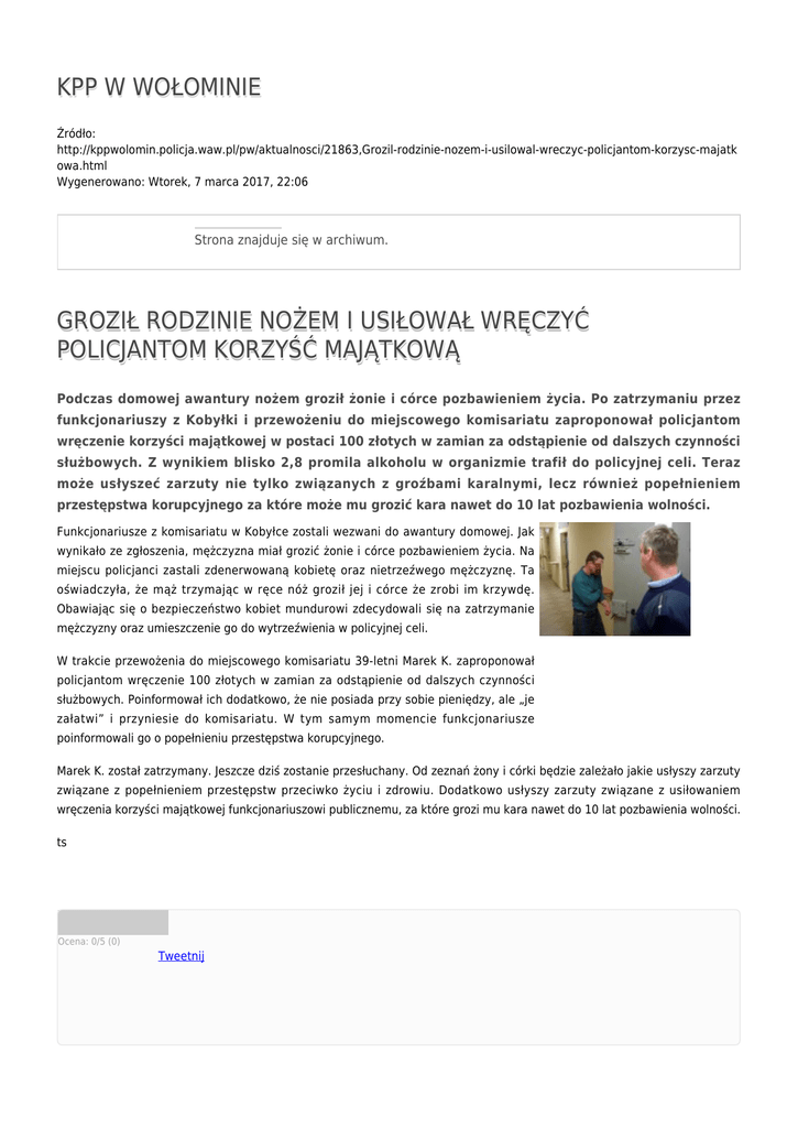 KPP W WOŁOMINIE Źródło: http://kppwolomin.policja.waw.pl/pw/aktualnosci/21863,Grozil-rodzinie-nozem-i-usilowal-wreczyc-policjantom-korzysc-majatk owa.html Wygenerowano: Wtorek, 7 marca 2017, 22:06 Strona znajduje się w archiwum. GROZIŁ RODZINIE NOŻEM I USIŁOWAŁ WRĘCZYĆ POLICJANTOM KORZYŚĆ MAJĄTKOWĄ Podczas domowej awantury nożem groził żonie i córce pozbawieniem życia. Po zatrzymaniu przez funkcjonariuszy z Kobyłki i przewożeniu do miejscowego komisariatu zaproponował policjantom wręczenie korzyści majątkowej w postaci 100 złotych w zamian za odstąpienie od dalszych czynności służbowych. Z wynikiem blisko 2,8 promila alkoholu w organizmie trafił do policyjnej celi. Teraz może usłyszeć zarzuty nie tylko związanych z groźbami karalnymi, lecz również popełnieniem przestępstwa korupcyjnego za które może mu grozić kara nawet do 10 lat pozbawienia wolności. Funkcjonariusze z komisariatu w Kobyłce zostali wezwani do awantury domowej. Jak wynikało ze zgłoszenia, mężczyzna miał grozić żonie i córce pozbawieniem życia. Na miejscu policjanci zastali zdenerwowaną kobietę oraz nietrzeźwego mężczyznę. Ta oświadczyła, że mąż trzymając w ręce nóż groził jej i córce że zrobi im krzywdę. Obawiając się o bezpieczeństwo kobiet mundurowi zdecydowali się na zatrzymanie mężczyzny oraz umieszczenie go do wytrzeźwienia w policyjnej celi. W trakcie przewożenia do miejscowego komisariatu 39-letni Marek K. zaproponował policjantom wręczenie 100 złotych w zamian za odstąpienie od dalszych czynności służbowych. Poinformował ich dodatkowo, że nie posiada przy sobie pieniędzy, ale „je załatwi” i przyniesie do komisariatu. W tym samym momencie funkcjonariusze poinformowali go o popełnieniu przestępstwa korupcyjnego. Marek K. został zatrzymany. Jeszcze dziś zostanie przesłuchany. Od zeznań żony i córki będzie zależało jakie usłyszy zarzuty związane z popełnieniem przestępstw przeciwko życiu i zdrowiu. Dodatkowo usłyszy zarzuty związane z usiłowaniem wręczenia korzyści majątkowej funkcjonariuszowi publicznemu, za które grozi mu kara nawet do 10 lat pozbawienia wolności. ts Ocena: 0/5 (0) Tweetnij