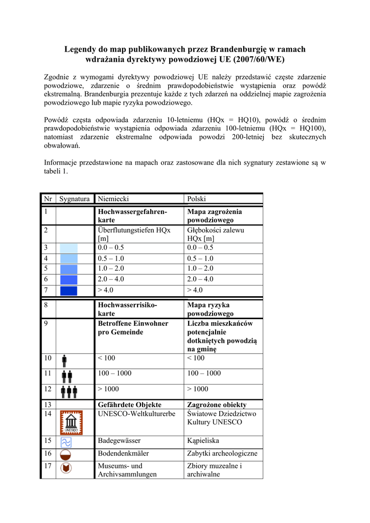 Legendy do map publikowanych przez Brandenburgię w ramach wdrażania dyrektywy powodziowej UE (2007/60/WE) Zgodnie z wymogami dyrektywy powodziowej UE należy przedstawić częste zdarzenie powodziowe, zdarzenie o średnim prawdopodobieństwie wystąpienia oraz powódź ekstremalną. Brandenburgia prezentuje każde z tych zdarzeń na oddzielnej mapie zagrożenia powodziowego lub mapie ryzyka powodziowego. Powódź częsta odpowiada zdarzeniu 10-letniemu (HQx = HQ10), powódź o średnim prawdopodobieństwie wystąpienia odpowiada zdarzeniu 100-letniemu (HQx = HQ100), natomiast zdarzenie ekstremalne odpowiada powodzi 200-letniej bez skutecznych obwałowań. Informacje przedstawione na mapach oraz zastosowane dla nich sygnatury zestawione są w tabeli 1. Nr 1 2 3 4 5 6 7 8 Sygnatura Niemiecki Polski Hochwassergefahrenkarte Überflutungstiefen HQx [m] 0.0 – 0.5 0.5 – 1.0 1.0 – 2.0 2.0 – 4.0 > 4.0 Mapa zagrożenia powodziowego Głębokości zalewu HQx [m] 0.0 – 0.5 0.5 – 1.0 1.0 – 2.0 2.0 – 4.0 > 4.0 Hochwasserrisikokarte Betroffene Einwohner pro Gemeinde 10 < 100 Mapa ryzyka powodziowego Liczba mieszkańców potencjalnie dotkniętych powodzią na gminę < 100 11 100 – 1000 100 – 1000 12 > 1000 > 1000 13 14 Gefährdete Objekte UNESCO-Weltkulturerbe Zagrożone obiekty Światowe Dziedzictwo Kultury UNESCO 15 Badegewässer Kąpieliska 16 Bodendenkmäler Zabytki archeologiczne 17 Museums- und Archivsammlungen Zbiory muzealne i archiwalne 9 18 Bau- oder Gartendenkmäler mit Anzahl 19 Gefahrenquellen 20 IED-Anlagen 21 Flächennutzung im Überflutungsgebiet 22 Wohnbauflächen; Flächen gemischter Nutzung 23 Industrie u. Gewerbeflächen; Flächen mit funktionaler Prägung 24 Verkehrsflächen 25 Landwirtschaftlich genutzte Flächen; Wald, Forst Gewässer Sonstige Vegetations- und Freiflächen 26 27 28 29 30 31 32 33 34 35 36 37 Zabytki architektury i sztuki ogrodowej z podaniem liczby Źródła niebezpieczeństwa Instalacje IED (wg dyrektywy 2010/75/UE w sprawie emisji przemysłowych) Użytkowanie terenu na obszarze zalewowym Tereny zamieszkałe; powierzchnie o użytkowaniu mieszanym Tereny przemysłowe i handlowe; powierzchnie o charakterze funkcjonalnym Tereny komunikacyjne Powierzchnie użytkowane rolniczo; lasy Wody Pozostałe tereny z pokryciem roślinnym oraz tereny otwarte Schutzgebiete Obszary chronione FFH-Gebiet Obszar ochrony siedlisk przyrodniczych oraz dzikiej fauny i flory Vogelschutzgebiet (SPA) Obszar specjalnej ochrony ptaków (SPA) Trinkwasserschutzgebiet Obszary przeznaczone (TWSG) do poboru wody pitnej Wasserschutzgebiet (WSG) Obszar ochrony wód Auf allen Karten dargestellt: Hochwasserschutzeinrichtungen Deiche, Wände Flutpolder / Hochwasserrückhaltebecken Sonstiges Fließgewässer Na obu mapach przedstawione są: Urządzenia ochrony przeciwpowodziowej Wały, ściany/mury Polder zalewowy / przeciwpowodziowy zbiornik retencyjny Inne Ciek 38 Landesgrenze 39 40 41 42 Landkreisgrenze Gemeindegrenze Gewässerstationierung Pegel 43 Blattschnitt 1:10.000 (gültiger Kartenbereich) Granica kraju związkowego Granica okręgu Granica gminy Kilometraż cieku Wodowskaz Krój arkuszowy 1:10.000 (obowiązujący zakres map) Tabela 1: Informacje przedstawione na mapach zagrożenia powodziowego oraz mapach ryzyka powodziowego publikowanych zgodnie z dyrektywą powodziową Szczególne wyjaśnienia: Instalacje IED (punkt 20): Instalacje podlegające dyrektywie 2010/75/UE w sprawie emisji przemysłowych. Z reguły stanowią one podczas powodzi szczególne źródło zagrożenia. Zabytki architektury i sztuki ogrodowej z podaniem ich liczby (punkt 18): W przypadku zbyt dużego zagęszczenia obiektów do celów prezentacji wybiera się tylko jeden symbol oraz podaje się zbiorczą liczbę zabytków. Użytkowanie terenu (punkty 21 – 27): Aktualne użytkowanie terenu na obszarach zagrożonych powodzią. Obszary chronione (punkty 29 - 32): Obszary, dla których obowiązują szczególne przepisy dotyczące ochrony zgodnie z prawem międzynarodowym (dyrektywa 92/43/EWG w sprawie ochrony siedlisk przyrodniczych oraz dzikiej fauny i flory, dyrektywa 79/409/EWG w sprawie ochrony dzikiego ptactwa) lub krajowym (WSG oraz TWSG [Ustawa o gospodarce wodnej (WHG) oraz Ustawa Prawo wodne Brandenburgii (BbgWG)]). Wały, ściany/mury (punkt 34): Wały oraz sztuczne podwyższenia terenu w pobliżu brzegów umożliwiające zatrzymanie wód powodziowych. Zarówno wały, jak i wspomniane podwyższenia terenu mogą wykazywać różny poziom ochrony przeciwpowodziowej. Poldery zalewowe (punkt 35): Obszary regularnie zalewane lub przeznaczone do zalania w sytuacjach ekstremalnych, aby odciążyć dany odcinek rzeki od wód powodziowych. Wodowskaz (punkt 42): Przedstawienie najważniejszych wodowskazów, w szczególności stacji zgłaszania powodzi oraz stacji alarmowych. Krój arkuszowy (punkt 43): Pokazuje położenie obszaru przedstawionego na mapie szczegółowej w obrębie dorzecza.