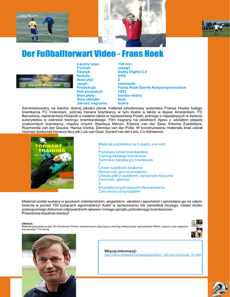 Der Fußballtorwart Video - Frans Hoek £¹czny czas: 138 min. Format: mpeg2 DŸwiêk: Dolby Digital 2.0 Noœnik: DVD Iloœæ p³yt: 2 Jêzyk: niemiecki Produkcja: Frans Hoek Sports Keeperspromotion Rok produkcji: 1993 Stan p³yty: bardzo dobry Stan ok³adki: brak Jakoœæ nagrania: dobra Zarchiwizowany na bardzo dobrej jakoœci p³ycie materia³ szkoleniowy autorstwa Fransa Hoeka by³ego bramkarza FC Volendam, póŸniej trenera bramkarzy w tym klubie a tak¿e w Ajaxie Amsterdam, FC Barcelona, reprezentacji Holandii a ostatnio tak¿e w reprezentacji Polski, jednego z najwiêkszych w œwiecie autorytetów w zakresie treningu bramkarskiego. Film nagrany na obiektach Ajaxu z udzia³em plejady znakomitych bramkarzy, miêdzy innymi: Stanleya Menzo, Edwina van der Sara, Edwina Zoetebiera, Raymonda van der Gouwa, Hansa Vonka, Dennisa van der Polla. W konstruowaniu materia³u brali udzia³ równie¿ doskonali trenerzy tacy jak Luis van Gaal, Gerard van der Lem, Co Adriaanse. Materia³ podzielony na 3 czêœci, a w nich: 1 Podstawy sztuki bramkarskiej Trening m³odego bramkarza Technika i taktyka gry bramkarza 2 Chwyt, szybkoœæ dzia³ania Skocznoœæ, gra na przedpolu Chwyty pi³ki z upadkiem, sprawnoœæ fizyczna Zwinnoœæ, gibkoœæ 3 50 praktycznych æwiczeñ dla bramkarza Æwiczenia z przyrz¹dami Materia³ zosta³ wydany w jêzykach niderlandzkim, angielskim, w³oskim i japoñskim i sprzedano go na ca³ym œwiecie w ponad 150 tysi¹cach egzemplarzy! Autor w opracowaniu nie zaniedba³ niczego, nawet dzia³u poœwiêconego doborowi odpowiednich rêkawic i innego sprzêtu potrzebnego bramkarzowi. Prawdziwa kopalnia wiedzy! UWAGA: Materia³ poprzedzony jest 36 minutowym filmem szkoleniowym dotycz¹cym treningu taktycznego reprezentacji W³och. £¹czny czas nagrania wynosi wiêc 174 minuty. Wiêcej informacji: http://www.philippka.de/catalog/product_info.php?products_id=340