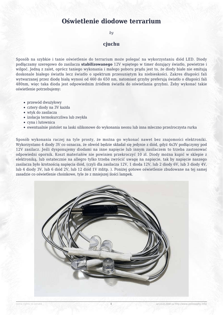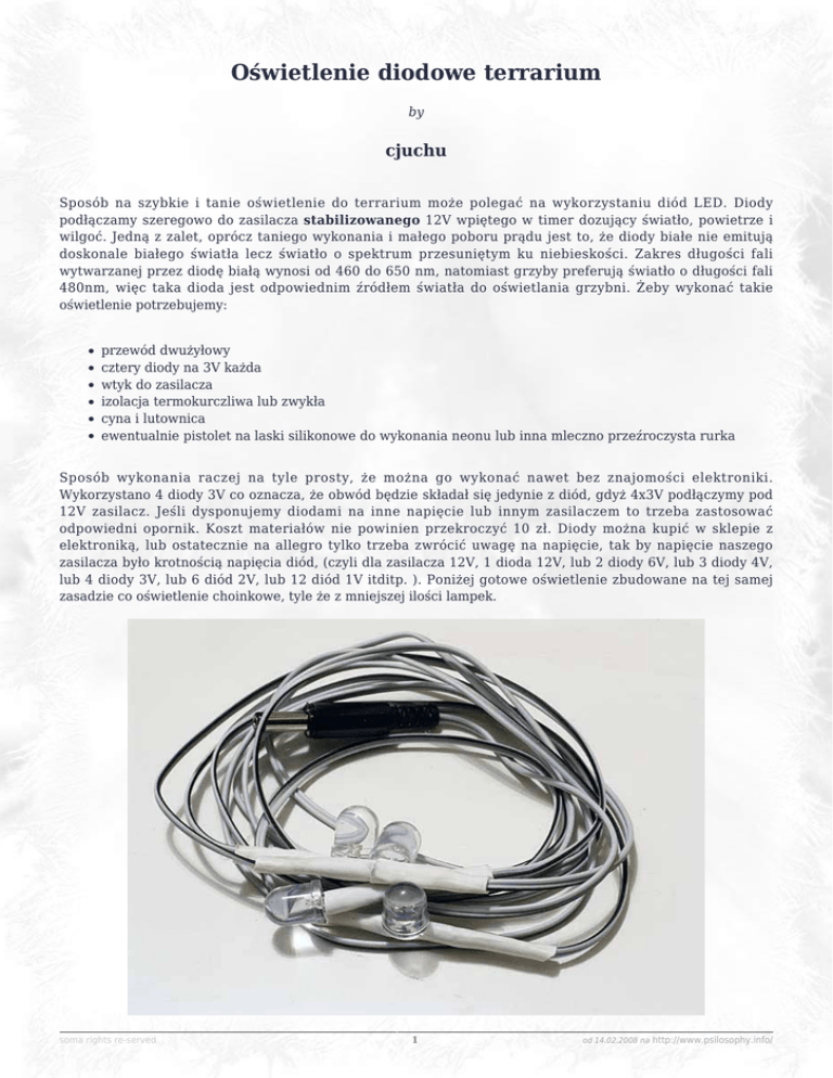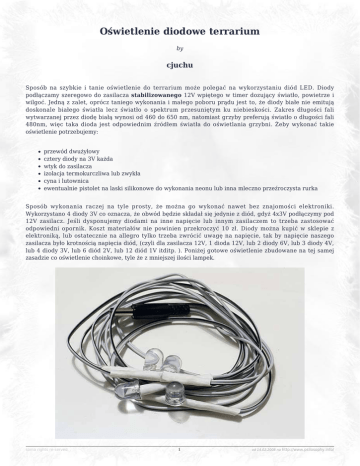 Oświetlenie diodowe terrarium by cjuchu Sposób na szybkie i tanie oświetlenie do terrarium może polegać na wykorzystaniu diód LED. Diody podłączamy szeregowo do zasilacza stabilizowanego 12V wpiętego w timer dozujący światło, powietrze i wilgoć. Jedną z zalet, oprócz taniego wykonania i małego poboru prądu jest to, że diody białe nie emitują doskonale białego światła lecz światło o spektrum przesuniętym ku niebieskości. Zakres długości fali wytwarzanej przez diodę białą wynosi od 460 do 650 nm, natomiast grzyby preferują światło o długości fali 480nm, więc taka dioda jest odpowiednim źródłem światła do oświetlania grzybni. Żeby wykonać takie oświetlenie potrzebujemy: przewód dwużyłowy cztery diody na 3V każda wtyk do zasilacza izolacja termokurczliwa lub zwykła cyna i lutownica ewentualnie pistolet na laski silikonowe do wykonania neonu lub inna mleczno przeźroczysta rurka Sposób wykonania raczej na tyle prosty, że można go wykonać nawet bez znajomości elektroniki. Wykorzystano 4 diody 3V co oznacza, że obwód będzie składał się jedynie z diód, gdyż 4x3V podłączymy pod 12V zasilacz. Jeśli dysponujemy diodami na inne napięcie lub innym zasilaczem to trzeba zastosować odpowiedni opornik. Koszt materiałów nie powinien przekroczyć 10 zł. Diody można kupić w sklepie z elektroniką, lub ostatecznie na allegro tylko trzeba zwrócić uwagę na napięcie, tak by napięcie naszego zasilacza było krotnością napięcia diód, (czyli dla zasilacza 12V, 1 dioda 12V, lub 2 diody 6V, lub 3 diody 4V, lub 4 diody 3V, lub 6 diód 2V, lub 12 diód 1V itditp. ). Poniżej gotowe oświetlenie zbudowane na tej samej zasadzie co oświetlenie choinkowe, tyle że z mniejszej ilości lampek. soma rights re-served 1 od 14.02.2008 na http://www.psilosophy.info/ oświetlenie diodowe terrarium www.psilosophy.info/wvxhtwvzbrjlbqcrcpazbege Tak mniej więcej to wygląda. Wlutowane w jedną żyłę diody zgodnie ze swoją polaryzacją, zostają zabezpieczone izolacją termokurczliwą. W takim układzie, bez żadnej obudowy można je po prostu położyć na przeźroczystej pokrywie terrarium i oświetlać. Choć większą skuteczność oświetleniową uzyskają jeśli usztywnimy je w obudowie i skupimy ich światło. Zalutowany sznur diód można również przerobić na neon(y) diodowe. Na przewody nawlekamy najpierw potrzebną ilość izolacji termokurczliwej po czym przylutowujemy na jednym z końców przewodu diodę zgodnie z jej polaryzacją, przedstawioną na poniższym zdjęciu. Polaryzacja diody LED, jak widać minusem jest szersza elektroda. soma rights re-served 2 od 14.02.2008 na http://www.psilosophy.info/ oświetlenie diodowe terrarium www.psilosophy.info/wvxhtwvzbrjlbqcrcpazbege Dolutowana dioda. Można nasunąć izolację lecz jeszcze jej nie ogrzewać. Termokurcz wykonujemy dopiero po przetestowaniu obwodu. Odcinamy potrzebną ilość izolacji z rurki termokurczliwej. Ponieważ mamy jeszcze trzy diody z dwoma nóżkami to na przewód potrzebujemy nawlec 6 kawałków izolacji. soma rights re-served 3 od 14.02.2008 na http://www.psilosophy.info/ oświetlenie diodowe terrarium www.psilosophy.info/wvxhtwvzbrjlbqcrcpazbege Wkładamy w rurki diody z rozgiętymi nóżkami i na podstawie ich długości szacujemy rozmieszczenie diód na przewodzie, można je rozmieścić jedna za drugą, lub w pewnych odległościach, jak w przypadku lampek choinkowych. Jeśli będziemy robić neon, trzeba wziąć pod uwagę długość rurki, tak by później nie bawić się z jej przycinaniem. Zaginamy przewód w odpowiednich miejscach by zaznaczyć miejsca cięcia. Diodę z rurkami przesuwamy, lub w ogóle je wyjmujemy. Między zagięciami wykonanymi na przewodzie odnajdujemy środek i rozdzielamy w nim oba przewody wbijając między nie na przykład nożyczki, po czym lekko rozrywamy palcami. Przecinamy przewód plusa i odcinamy po milimetrze z każdego końca przecięcia, tak by przewody były krótsze i nie zetknęły się między sobą przez przypadek, gdy będą przylutowane do diody, lub innymi słowy wycinamy po prostu z powstałej pętli dwumilimetrowy kawałek przewodu plusa. soma rights re-served 4 od 14.02.2008 na http://www.psilosophy.info/ oświetlenie diodowe terrarium www.psilosophy.info/wvxhtwvzbrjlbqcrcpazbege Teraz, w tak powstałym wycięciu, umieszczamy diodę zgodnie z polaryzacją i okręcamy odizolowany przewód na jej nóżkach. Elektroda ujemna tej i każdej następnej diody powinna łączyć się z elektrodą dodatnią poprzedniej diody, a w tym wypadku pierwszej diody. Czyli jeśli minus pierwszej diody (tej na końcu przewodu) przylutowano do żyły z czarnym paskiem, a rozcięcia kabla zrobione zostały, na żyle dodatniej bez paska, to minus każdej nowej diody powinien być skierowany w kierunku diody poprzedniej (czyli obwód szeregowy). Przylutowujemy przewody do nóżek po czym możemy lekko skrócić nóżki nożyczkami. W tym momencie nie korzystamy z termokurczliwej izolacji na pojedynczą żyłę (patrz czarna izolacja na diodzie na końcu kabla na zdjęciu drugim od góry) ponieważ druga żyła jest w zasadzie nie otwarta, a z drugiej strony od zwarcia dzieli nas dioda więc zaizolujemy całość jedną termokurczliwką na każdą nóżkę. soma rights re-served 5 od 14.02.2008 na http://www.psilosophy.info/ oświetlenie diodowe terrarium www.psilosophy.info/wvxhtwvzbrjlbqcrcpazbege Nasuwamy izolację termokurczliwą wykonując najpierw w krawędzi skierowanej w kierunku diody małe nacięcie, w które wejdzie nóżka pod spodem diody. Dzięki temu obie izolacje będzie można na siebie nasunąć odcinając tym samym metalowe części obwodu od środowiska zewnętrznego. soma rights re-served 6 od 14.02.2008 na http://www.psilosophy.info/ oświetlenie diodowe terrarium www.psilosophy.info/wvxhtwvzbrjlbqcrcpazbege Przylutowujemy wtyczkę zasilacza do przewodu zgodnie z polaryzacją swojego urządzenia. Przeważnie dzi