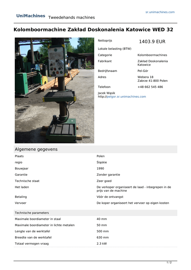 sr.unimachines.com Tweedehands machines Kolomboormachine Zakład Doskonalenia Katowice WED 32 Nettoprijs 1403.9 EUR Lokale belasting (BTW) Categorie Kolomboormachines Fabrikant Zakład Doskonalenia Katowice Bedrijfsnaam Pel-Gór Adres Webera 18 Zabrze 41-800 Polen Telefoon +48 662 545 486 Jacek Wąsik http://pelgor.sr.unimachines.com Algemene gegevens Plaats Polen regio Śląskie Bouwjaar 1990 Garantie Zonder garantie Technische staat Zeer goed Het laden De verkoper organiseert de laad - inbegrepen in de prijs van de machine Betaling Vóór de ontvangst Vervoer De koper organiseert het vervoer op eigen kosten Technische parameters Maximale boordiameter in staal 40 mm Maximale boordiameter in lichte metalen 50 mm Lengte van de werktafel 500 mm Breedte van de werktafel 630 mm Totaal vermogen vraag 2.3 kW 1/2 Afmeting Gewicht van de machine 0.85 t Uitrusting Centrale smering + Vloeistofkoelsysteem + Verlichting + 2/2 Powered by TCPDF (www.tcpdf.org)