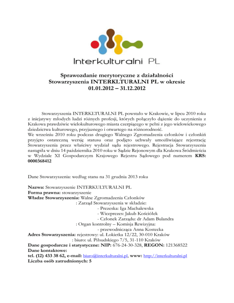 Sprawozdanie merytoryczne z działalności Stowarzyszenia INTERKLTURALNI PL w okresie 01.01.2012 – 31.12.2012 Stowarzyszenia INTERKLTURALNI PL powstało w Krakowie, w lipcu 2010 roku z inicjatywy młodych ludzi różnych profesji, których połączyło dążenie do uczynienia z Krakowa prawdziwie wielokulturowego miasta czerpiącego w pełni z jego wielowiekowego dziedzictwa kulturowego, przyjaznego i otwartego na różnorodność. We wrześniu 2010 roku podczas drugiego Walnego Zgromadzenia członków i członkiń przyjęto ostateczną wersję statusu oraz podjęto uchwały umożliwiające rejestrację Stowarzyszenia przez właściwy wydział sądu rejestrowego. Rejestracja Stowarzyszenia nastąpiła w dniu 14 października 2010 roku w Sądzie Rejonowym dla Krakowa Śródmieścia w Wydziale XI Gospodarczym Krajowego Rejestru Sądowego pod numerem KRS: 0000368412 Dane Stowarzyszenia: według stanu na 31 grudnia 2013 roku Nazwa: Stowarzyszenie INTERKULTURALNI PL Forma prawna: stowarzyszenie Władze Stowarzyszenia: Walne Zgromadzenia Członków : Zarząd Stowarzyszenia w składzie: - Prezeska: Iga Machalewska - Wiceprezes: Jakub Kościółek - Członek Zarządu: dr Adam Bulandra : Organ kontrolny – Komisja Rewizyjna: - przewodnicząca Anna Kostecka Adres Stowarzyszenia: rejestrowy: ul. Łokietka 12/22, 30-010 Kraków : biuro: ul. Piłsudskiego 7/5, 31-110 Kraków Dane gospodarcze i statystyczne: NIP: 676-24-30-328, REGON: 121368522 Dane kontaktowe: tel. (12) 433 38 62, e-mail: [email protected], www: http://interkulturalni.pl Liczba osób zatrudnionych: 5 Cele statutowe Stowarzyszenia: 1. Działalność w zakresie transferu kulturowego, dialogu międzykulturowego, propagowania różnorodności kulturowej i otwartości społeczeństw przyjmujących, prezentacji innych kultur w Polsce i za granicą, afirmacja kultur różnorodnych grup narodowościowych, etnicznych i społecznych. 2. Wspieranie badań międzykulturowych, etnicznych i etnograficznych. Edukacja międzykulturowa. 3. Wspieranie i podejmowanie działań na rzecz prezerwacji kultur i obyczajów różnorodnych grup etnicznych i narodowych. 4. Rozwijanie i umacnianie postaw nastawionych na aktywne współdziałanie w rozwoju otwartego społeczeństwa obywatelskiego opartego na akceptacji różnorodności i współistnienia różnych kultur i narodów. 5. Działalność na rzecz przygotowania Polaków do sprostania wymogom społeczeństwa przyjmującego cudzoziemców. 6. Działalność w zakresie nauki, kursów i warsztatów międzykulturowych i etnicznych. 7. Wspieranie działań i inicjatyw służących ochronie praw człowieka; przeciwdziałaniu dyskryminacji, wspieraniu grup marginalizowanych społecznie; przeciwdziałaniu wykluczeniu społecznemu; wspieraniu grup, bądź osób upośledzonych społecznie, w tym cudzoziemców i uchodźców. 8. Działalność na rzecz wspólnot lokalnych, samorządności lokalnej oraz organizacji społecznych. 9. Wspieranie pomocy społecznej dla uchodźców, ofiar konfliktów etnicznych i narodowościowych, osób dyskryminowanych. 10. Pomoc cudzoziemcom w integracji i aktywnym uczestnictwie w życiu społecznym 11. Pomoc Polakom wyjeżdżającym i wracającym do kraju. Wspieranie mobilności i inicjatyw współpracy międzykulturowej. 12. Wspieranie inicjatyw i działalności służącej powiększaniu kapitału społecznego państw rozwijających się, w szczególności w zakresie celów milenijnych Organizacji Narodów Zjednoczonych. 13. Działalność na rzecz ochrony praw i swobód obywatelskich, równości kobiet i mężczyzn, praw dzieci, mniejszości etnicznych, narodowych, równości ras i swobód religijnych, przeciwdziałania ksenofobii, rasizmowi i uprzedzeniom wszelkiego rodzaju. 14. Wspieranie idei transparentności i służebnej roli instytucji publicznych w Polsce. 15. Inicjowanie działań zmierzających do podnoszenia standardu ochrony praw człowieka i obywatela oraz podejmowanie interwencji w przypadkach ich naruszeń. 16. Inicjowanie działań zmierzających do podnoszenia standardów administracji publicznej oraz sprawowania wymiaru sprawiedliwości w Polsce. 17. Inicjowanie działań zmierzających do podnoszenia standardów sprawowania opieki psychologicznej oraz upowszechniania zasad prawidłowej komunikacji międzykulturowej i międzyludzkiej. 18. Udzielanie bezpłatnej pomocy i informacji prawnej, obejmującej reprezentację przed instytucjami władzy wykonawczej i wymiaru sprawiedliwości na zasadach określonych dla organizacji społecznych. 19. Współpraca z krajowymi i międzynarodowymi organizacjami zajmującymi się problematyką ochrony praw człowieka, dialogu i transferu międzykulturowego. Sprawozdanie merytoryczne z działalności: Projekt: Przeciwko rasizmowi i ksenofobii: wypracowanie miejskiej strategii zapobiegania i reakcji. sierpień 2011- maj 2012 Działania finansowane były przez Trust for Civil Society for Central and Eastern Europe. Projekt był realizowany przez Stowarzyszenie INTERKULTURALNI PL we współpracy z Miejskim Ośrodkiem Wspierania Inicjatyw Społecznych. Celem projektu było ograniczenie zachowań rasistowskich i ksenofobicznych oraz ich wizualnych przejawów w przestrzeni publicznej w Krakowie. Projekt zakładał wypracowanie rozwiązań prewencyjnych oraz schematów skutecznej reakcji na zdarzenia już występujące. Aby skutecznie osiągać realizowane cele Stowarzyszenie postanowiło wypracować dla miasta strategię zapobiegania i reakcji na akty o podłożu rasistowskim i ksenofobicznym. Projekt realizuje cele: 4, 5, 7, 13, 15. Projekt: Warszaty Grundtviga "Multicultural Europe - are we really united in diversity? Anti-discrimination training" sierpień 2011- kwiecień 2012 Projekt realizowany przy wsparciu finansowym uzyskanym z Komisji Europejskiej w ramach Programu „Uczenie się przez całe życie”. Głównym celem projektu jest podwyższenie wrażliwości kulturowej uczestników warsztatu. Uczestnikami będą dorośli 