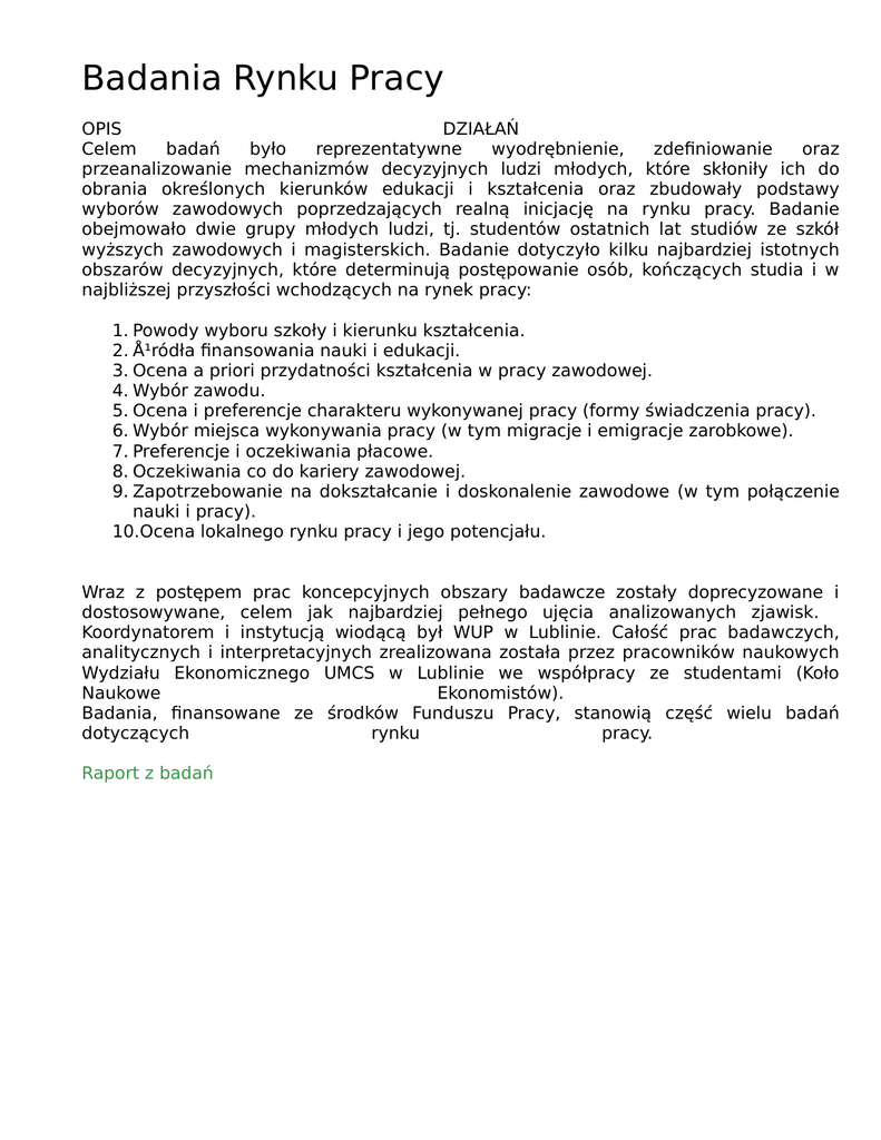 Badania Rynku Pracy OPIS DZIAŁAŃ Celem badań było reprezentatywne wyodrębnienie, zdefiniowanie oraz przeanalizowanie mechanizmów decyzyjnych ludzi młodych, które skłoniły ich do obrania określonych kierunków edukacji i kształcenia oraz zbudowały podstawy wyborów zawodowych poprzedzających realną inicjację na rynku pracy. Badanie obejmowało dwie grupy młodych ludzi, tj. studentów ostatnich lat studiów ze szkół wyższych zawodowych i magisterskich. Badanie dotyczyło kilku najbardziej istotnych obszarów decyzyjnych, które determinują postępowanie osób, kończących studia i w najbliższej przyszłości wchodzących na rynek pracy: 1. Powody wyboru szkoły i kierunku kształcenia. 2. Źródła finansowania nauki i edukacji. 3. Ocena a priori przydatności kształcenia w pracy zawodowej. 4. Wybór zawodu. 5. Ocena i preferencje charakteru wykonywanej pracy (formy świadczenia pracy). 6. Wybór miejsca wykonywania pracy (w tym migracje i emigracje zarobkowe). 7. Preferencje i oczekiwania płacowe. 8. Oczekiwania co do kariery zawodowej. 9. Zapotrzebowanie na dokształcanie i doskonalenie zawodowe (w tym połączenie nauki i pracy). 10.Ocena lokalnego rynku pracy i jego potencjału. Wraz z postępem prac koncepcyjnych obszary badawcze zostały doprecyzowane i dostosowywane, celem jak najbardziej pełnego ujęcia analizowanych zjawisk. Koordynatorem i instytucją wiodącą był WUP w Lublinie. Całość prac badawczych, analitycznych i interpretacyjnych zrealizowana została przez pracowników naukowych Wydziału Ekonomicznego UMCS w Lublinie we współpracy ze studentami (Koło Naukowe Ekonomistów). Badania, finansowane ze środków Funduszu Pracy, stanowią część wielu badań dotyczących rynku pracy. Raport z badań