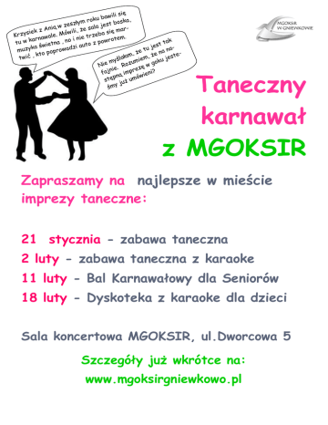 i się bawil u k , o r boska złym t s s e e z j sala nią w rkzA ili, że ię ma e i w s s ó a y M b z Kr rze ale. em. i nie t arnaw o k n w , owrot ak p u a t n z t o e st t ut a świ e i a j z k d y tu na muz rowa o pop , że , że na tet k m , a ć s ł twi yśla umiem oku je m Nie e. Roz zę w g ni re faj imp wieni? ą n ó p stę uż um j y śm Taneczny karnawał z MGOKSIR Zapraszamy na najlepsze w mieście imprezy taneczne: 21 stycznia - zabawa taneczna 2 luty - zabawa taneczna z karaoke 11 luty - Bal Karnawałowy dla Seniorów 18 luty - Dyskoteka z karaoke dla dzieci Sala koncertowa MGOKSIR, ul.Dworcowa 5 Szczegóły już wkrótce na: www.mgoksirgniewkowo.pl