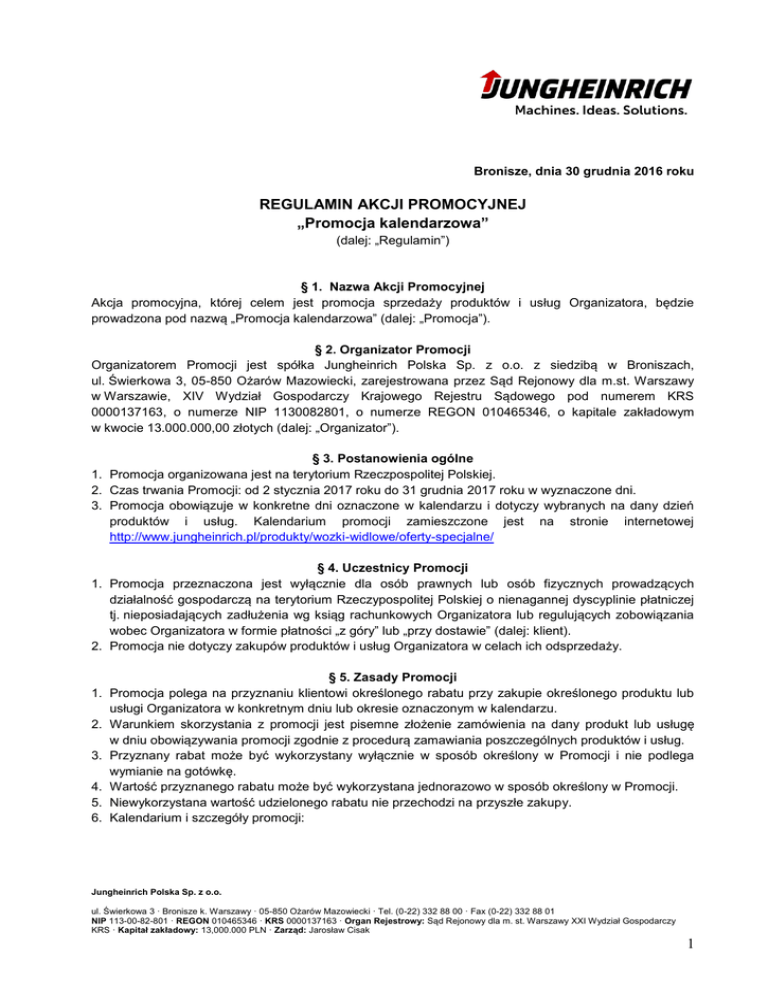 Bronisze, dnia 30 grudnia 2016 roku REGULAMIN AKCJI PROMOCYJNEJ „Promocja kalendarzowa” (dalej: „Regulamin”) § 1. Nazwa Akcji Promocyjnej Akcja promocyjna, której celem jest promocja sprzedaży produktów i usług Organizatora, będzie prowadzona pod nazwą „Promocja kalendarzowa” (dalej: „Promocja”). § 2. Organizator Promocji Organizatorem Promocji jest spółka Jungheinrich Polska Sp. z o.o. z siedzibą w Broniszach, ul. Świerkowa 3, 05-850 Ożarów Mazowiecki, zarejestrowana przez Sąd Rejonowy dla m.st. Warszawy w Warszawie, XIV Wydział Gospodarczy Krajowego Rejestru Sądowego pod numerem KRS 0000137163, o numerze NIP 1130082801, o numerze REGON 010465346, o kapitale zakładowym w kwocie 13.000.000,00 złotych (dalej: „Organizator”). § 3. Postanowienia ogólne 1. Promocja organizowana jest na terytorium Rzeczpospolitej Polskiej. 2. Czas trwania Promocji: od 2 stycznia 2017 roku do 31 grudnia 2017 roku w wyznaczone dni. 3. Promocja obowiązuje w konkretne dni oznaczone w kalendarzu i dotyczy wybranych na dany dzień produktów i usług. Kalendarium promocji zamieszczone jest na stronie internetowej http://www.jungheinrich.pl/produkty/wozki-widlowe/oferty-specjalne/ § 4. Uczestnicy Promocji 1. Promocja przeznaczona jest wyłącznie dla osób prawnych lub osób fizycznych prowadzących działalność gospodarczą na terytorium Rzeczypospolitej Polskiej o nienagannej dyscyplinie płatniczej tj. nieposiadających zadłużenia wg ksiąg rachunkowych Organizatora lub regulujących zobowiązania wobec Organizatora w formie płatności „z góry” lub „przy dostawie” (dalej: klient). 2. Promocja nie dotyczy zakupów produktów i usług Organizatora w celach ich odsprzedaży. § 5. Zasady Promocji 1. Promocja polega na przyznaniu klientowi określonego rabatu przy zakupie określonego produktu lub usługi Organizatora w konkretnym dniu lub okresie oznaczonym w kalendarzu. 2. Warunkiem skorzystania z promocji jest pisemne złożenie zamówienia na dany produkt lub usługę w dniu obowiązywania promocji zgodnie z procedurą zamawiania poszczególnych produktów i usług. 3. Przyznany rabat może być wykorzystany wyłącznie w sposób określony w Promocji i nie podlega wymianie na gotówkę. 4. Wartość przyznanego rabatu może być wykorzystana jednorazowo w sposób określony w Promocji. 5. Niewykorzystana wartość udzielonego rabatu nie przechodzi na przyszłe zakupy. 6. Kalendarium i szczegóły promocji: Jungheinrich Polska Sp. z o.o. ul. Świerkowa 3 · Bronisze k. Warszawy · 05-850 Ożarów Mazowiecki · Tel. (0-22) 332 88 00 · Fax (0-22) 332 88 01 NIP 113-00-82-801 · REGON 010465346 · KRS 0000137163 · Organ Rejestrowy: Sąd Rejonowy dla m. st. Warszawy XXI Wydział Gospodarczy KRS · Kapitał zakładowy: 13,000.000 PLN · Zarząd: Jarosław Cisak 1 1) 2 – 31 stycznia 2017r. Wyprzedaż wózków używanych z rocznika 2016 (oznaczenie w kalendarzu: start miesięcznej wyprzedaży wózków używanych rocznika 2016) Oferta obejmuje wybrane używane wózki widłowe z rocznika 2016 i jest ważna do 31 stycznia 2017r. lub do wyczerpania zapasów. Aktualna oferta wyprzedaży dostępna będzie we wskazanym okresie na stronie www.jungheinrich.com.pl oraz pod nr telefonu +48 22 355 89 91 lub w odpowiedzi na zapytania ofertowe skierowane na adres e-mail: [email protected]. 2) 23 stycznia 2017r. 5% rabatu na zakup części zamiennych do naprawy regałów magazynowych po przeglądzie eksperckim (oznaczenie w kalendarzu: 5% rabatu na zakup części regałowych do naprawy po przeglądzie) Oferta obejmuje przyznanie rabatu w wysokości 5% od ceny netto z cennika Organizatora na zakup wszystkich części zamiennych niezbędnych do naprawy regałów magazynowych po uprzednio wykonanym przez Organizatora przeglądzie eksperckim regałów magazynowych klienta. Warunkiem przyznania rabatu jest otrzymanie przez Organizatora w dniu obowiązywania Promocji skutecznego zamówienia na zakup w/w części. 3) 8 lutego 2017r. i 5 września 2017r. Rabat w wysokości 500 zł netto na usługę wynajmu krótkoterminowego przy zawarciu nowej umowy wynajmu długoterminowego (oznaczenie w kalendarzu: do każdego kontraktu na wynajem długoterminowy voucher 500 zł na wynajem krótkoterminowy) Oferta obejmuje przyznanie rabatu w wysokości 500 zł. (pięćset złotych 00/100) netto od ceny z cennika wynajmu wózków widłowych Organizatora na usługę wynajmu krótkoterminowego wózka widłowego, z wyłączeniem transportu urządzenia. Przyznany rabat dotyczy jednorazowej, nowej usługi wynajmu krótkoterminowego zamówionej i wykonanej w okresie od dnia zawarcia umowy wynajmu długoterminowego do dnia 31 grudnia 2017r. 4) 3 marca 2017r. Przegląd akumulatora trakcyjnego w cenie 99 zł netto (usługa wraz z dojazdem) (oznaczenie w kalendarzu: przegląd akumulatora trakcyjnego w cenie 99 zł (usługa wraz z dojazdem) dla pierwszych 100 zleceń przesłanych tego dnia) Oferta obejmuje jeden przegląd konserwacyjny jednego akumulatora trakcyjnego wraz z dojazdem do klienta w cenie ryczałtowej 99 zł. (dziewięćdziesiąt dziewięć złotych 00/100) netto zamówiony w dniu obowiązywania Promocji i wykonany do dnia 31 grudnia 2017r. Oferta dotyczy 100 pierwszych otrzymanych przez Organizatora w dniu obowiązywania Promocji, zamówień na wykonanie w/w usługi. Zamówienie winno zostać skutecznie wysłane na aktywny adres mailowy Organizatora o strukturze: [email protected] lub [email protected] – decyduje kolejność wpływu zamówień identyfikowana wg daty i godziny otrzymania zamówienia, określonej w poczcie elektronicznej Organizatora. Jungheinrich Polska Sp. z o.o. ul. Świerkowa 3 · Bronisze k. Warszawy · 05-850 Ożarów Mazowiecki · Tel. (0-22) 332 88 00 · Fax (0-22) 332 88 01 NIP 113-00-82-801 · REGON 010465346 · KRS 0000137163 · Organ Rejestrowy: Sąd Rejonowy dla m. st. Warszawy XXI Wydział Gospodarczy KRS · Kapitał zakładowy: 13,000.000 PLN · Zarząd: Jarosła