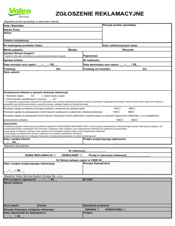 ZGŁOSZENIE REKLAMACYJNE Wypełnia punkt sprzedaŜy w obecności klienta Pieczęć punktu sprzedaŜy: Imię i Nazwisko: Nazwa firmy: Adres: Telefon kontaktowy: Nr katalogowy produktu Valeo: Ilość reklamowanych sztuk: Marka pojazdu: Symbol Skrzyni biegów*: Model: Rocznik: * wypełnić tylko gdy reklamowane są elementy przeniesienia napędu Pojemność: Symbol silnika: Nr nadwozia: Data montaŜu w/w części: _ _ / _ _ / 20_ _ Data demontaŜu w/w części: _ _ / _ _ / 20_ _ km Przebieg: Opis usterki: Przebieg od montaŜu: km Oczekiwania klienta w sprawie złoŜonej reklamacji: □ Wymiana części lub □ Zwrot kosztu części □ Zwrot kosztów dodatkowych w kwocie………zł** ** w przypadku pozytywnego rozpatrzenia reklamacji zwrot kosztów dodatkowych będzie moŜliwy na podstawie oryginałów rachunków. Finalna kwota zwrotu moŜe ulec zmianie w przypadku, gdy deklarowana kwota w sposób znaczący odbiegać będzie od średniej rynkowej. □ TAK□ WyraŜam zgodę na badanie niszczące produktu, konieczne do wydania opinii □ NIE□ TAK WyraŜam zgodę na przetwarzanie moich danych osobowych w celach dot. złoŜonej reklamacji NIE WyraŜam zgodę na przekazanie moich danych osobowych innym podmiotom uczestniczącym w procesie rozpoznania reklamacji, a w szczególności producentowi produktu TAK □ NIE □ WSKAZÓWKI: i Podstawą przyjęcia reklamacji jest prawidłowo wypełnione ZGŁOSZENIE REKLAMACYJNE z równoczesnym przekazaniem reklamowanego wyrobu. Brak danych pojazdu, dat montaŜu/demontaŜu, przebiegów oraz informacji o objawach moŜe wydłuŜyć czas rozpatrywania reklamacji lub całkowicie ja uniemoŜliwić. ii brak zgody na badanie niszczące moŜe opóźnić lub uniemoŜliwić wydanie opinii na temat zgłaszanej reklamacji iii brak zgody na przetwarzanie danych osobowych uniemoŜliwi rozpatrzenie reklamacji iiii dane osobowe podane w niniejszym formularzu nie będą wykorzystywane do celów marketingowych Data i podpis klienta: _ _/_ _/20_ _ Podpis przyjmującego zgłoszenie: Wypełnia Dystrybutor Nr reklamacji…………………… NOWA REKLAMACJA □ Data i podpis przyjmującego reklamację: ODWOŁANIE* □ *Podaj nr pierwszej reklamacji_ _ _ _ _ _ _ _ _ _ Nr faktury zakupu części w VSEE 94 _ _ _ _ _ _ Pieczęć Dystrybutora _ _ / _ _ / 20_ _ Wypełnia Valeo Service Eastern Europe Sp. z o.o. Data przyjęcia zgłoszenia: _ _ / _ _ / 20_ _ Wynik badania: Nr SAP: Kod usterki: Data/Seria produkcji: Kwota: Decyzja dotycząca niniejszej reklamacji Data odpowiedzi do dystrybutora: _ _ /_ _ / 20_ _ UZNANA □ Podpis: ODRZUCONA □