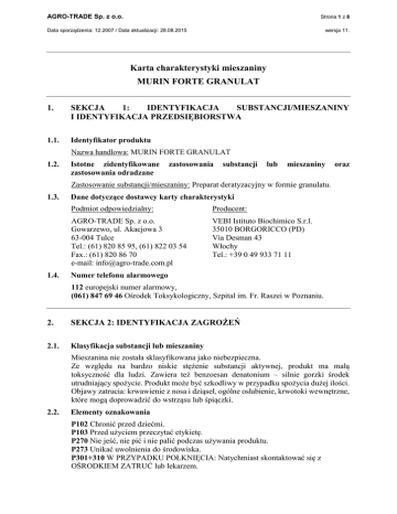 AGRO-TRADE Sp. z o.o. Strona 1 z 8 Data sporządzenia: 12.2007 / Data aktualizacji: 28.08.2015 wersja 11. Karta charakterystyki mieszaniny MURIN FORTE GRANULAT 1. SEKCJA 1: IDENTYFIKACJA SUBSTANCJI/MIESZANINY I IDENTYFIKACJA PRZEDSIĘBIORSTWA 1.1. Identyfikator produktu Nazwa handlowa: MURIN FORTE GRANULAT 1.2. Istotne zidentyfikowane zastosowania odradzane zastosowania substancji lub mieszaniny oraz Zastosowanie substancji/mieszaniny: Preparat deratyzacyjny w formie granulatu. 1.3. 1.4. Dane dotyczące dostawcy karty charakterystyki Podmiot odpowiedzialny: Producent: AGRO-TRADE Sp. z o.o. Gowarzewo, ul. Akacjowa 3 63-004 Tulce Tel.: (61) 820 85 95, (61) 822 03 54 Fax.: (61) 820 86 70 e-mail: [email protected] VEBI Istituto Biochimico S.r.l. 35010 BORGORICCO (PD) Via Desman 43 Włochy Tel.: +39 0 49 933 71 11 Numer telefonu alarmowego 112 europejski numer alarmowy, (061) 847 69 46 Ośrodek Toksykologiczny, Szpital im. Fr. Raszei w Poznaniu. 2. SEKCJA 2: IDENTYFIKACJA ZAGROŻEŃ 2.1. Klasyfikacja substancji lub mieszaniny Mieszanina nie została sklasyfikowana jako niebezpieczna. Ze względu na bardzo niskie stężenie substancji aktywnej, produkt ma małą toksyczność dla ludzi. Zawiera też benzoesan denatonium – silnie gorzki środek utrudniający spożycie. Produkt może być szkodliwy w przypadku spożycia dużej ilości. Objawy zatrucia: krwawienie z nosa i dziąseł, ogólne osłabienie, krwotoki wewnętrzne, które mogą doprowadzić do wstrząsu lub śpiączki. 2.2. Elementy oznakowania P102 Chronić przed dziećmi. P103 Przed użyciem przeczytać etykietę. P270 Nie jeść, nie pić i nie palić podczas używania produktu. P273 Unikać uwolnienia do środowiska. P301+310 W PRZYPADKU POŁKNIĘCIA: Natychmiast skontaktować się z OŚRODKIEM ZATRUĆ lub lekarzem. AGRO-TRADE Sp. z o.o. Strona 2 z 8 Data sporządzenia: 12.2007 / Data aktualizacji: 28.08.2015 wersja 11. P501 Zawartość/pojemnik usuwać zgodnie z obowiązującymi przepisami krajowymi. 2.3. Inne zagrożenia Brak danych. 3. SEKCJA 3: SKŁAD / INFORMACJA O SKŁADNIKACH 3.1. Substancje Nie dotyczy. 3.2. Mieszaniny Nr CAS Nr WE Stęż % Bromadiolon 28772-56-7 249-205-9 0,005 Benzoesan benzylodietyloamoniowy 3734-33-6 223-095-2 0,001 Nazwa substancji Klasyfikacja zgodnie z Rozporządzeniem (WE) 1272/2008 Acute Tox. 2, Aquatic Acute 1, H300, H310, H400 Acute Tox. 4, Aquatic Chronic 3, H302, H332, H412 Dodatkowe informacje: Pełne brzmienie klasyfikacji zagrożenia, zwrotów R i zwrotów H podano w sekcji 16. Zawartość benzoesanu benzylodietyloamoniowego o silnie gorzkim smaku utrudnia przypadkowe spożycie przez ludzi i zwierzęta domowe. Surowce spożywcze – do 100%. 4. SEKCJA 4: ŚRODKI PIERWSZEJ POMOCY 4.1. Opis środków pierwszej pomocy Wskazówki ogólne: Antidotum – witamina K1. Pod nadzorem lekarza. Kontakt ze skórą: Natychmiast zmyć wodą z mydłem. Kontakt z oczami: Natychmiast przemyć oczy dużą ilością wody przynajmniej przez 15-20 minut. Jeżeli podrażnienie nie ustępuje – skonsultować się z lekarzem. Połknięcie: Przepłukać usta wodą. Wezwać lekarza i okazać niniejszy dokument. 4.2. Najważniejsze ostre i opóźnione objawy oraz skutki narażenia Dodatkowe informacje: Bromadiolon jest antykoagulantem z grupy pochodnych hydroksykumaryny. Zaleca się kontrolować aktywność protrombiny wiele razy, nawet po kilku dniach, szczególnie jeśli ilość połkniętego produktu była duża. U zwierząt, witamina K1 powinna być podawana nawet przy braku zmian w krzepnięciu. 4.3. Wskazania dotyczące wszelkiej natychmiastowej pomocy lekarskiej i szczególnego postępowania z poszkodowanym Antidotum – witamina K. AGRO-TRADE Sp. z o.o. Data sporządzenia: 12.2007 / Data aktualizacji: 28.08.2015 5. SEKCJA 5: POSTĘPOWANIE W PRZYPADKU POŻARU 5.1. Środki gaśnicze Strona 3 z 8 wersja 11. Optymalne środki gaśnicze: piana gaśnicza, suche środki gaśnicze i dwutlenek węgla. 5.2. Szczególne zagrożenia związane z substancją chemiczną Mogą tworzyć się toksyczne gazy (COx, Br2) 5.3. Informacje dla straży pożarnej Strażacy powinni posiadać samodzielne aparaty oddechowe oraz ubranie ochronne. 6. SEKCJA 6: POSTĘPOWANIE W PRZYPADKU NIEZAMIERZONEGO UWOLNIENIA DO ŚRODOWISKA 6.1. Indywidualne środki ostrożności, wyposażenie ochronne i procedury w sytuacjach awaryjnych W czasie wykonywania wszelkich czynności należy nosić rękawice i ubranie ochronne. 6.2. Środki ostrożności w zakresie ochrony środowiska Nie wolno dopuścić, aby substancja przedostała się do kanalizacji lub zbiorników wodnych. Jeśli źródła wody zostaną zanieczyszczone, należy poinformować odpowiednie władze. 6.3. Metody i materiały zapobiegające rozprzestrzenianiu się skażenia i służące do usuwania skażenia Dokładnie pozbierać produkt; zmyć wodą. 6.4. Odniesienia do innych sekcji Sekcje: 7, 8, 13. 7. SEKCJA 7: POSTĘPOWANIE Z SUBSTANCJAMI I MIESZANINAMI ORAZ ICH MAGAZYNOWANIE 7.1. Środki ostrożności dotyczące bezpiecznego postępowania Podczas pracy z produktem przestrzegać środków ochrony osobistej. Nie jeść, nie pic i nie palić podczas pracy. 7.2. Warunki bezpiecznego magazynowania, łącznie z informacjami dotyczącymi wszelkich wzajemnych niezgodności Szczelnie zamknięte pojemniki należy przechowywać w miejscu suchym, z dostępem powietrza, z dala od żywności, poza zasięgiem osób postronnych, dzieci i zwierząt domowych. AGRO-TRADE Sp. z o.o. Strona 4 z 8 Data sporządzenia: 12.2007 / Data aktualizacji: 28.08.2015 7.3. wersja 11. Szczególne zastosowanie(-a) końcowe Trutka. 8. SEKCJA 8: KONTROLA INDYWIDUALNEJ 8.1. Parametry dotyczące kontroli NARAŻENIA / ŚRODKI OCHRONY Brak 8.2. Kontrola narażenia Ochrona dróg oddechowych: nie jest konieczna Ochrona rąk: ochronne rękawice odpowiednie do środków chemicznych, regularnie zmieniane. Ochrona oczu: nie jest konieczna Ochrona skóry: ubranie ochronne, regularnie zmieniane. Ogólne środki bezpieczeństwa i higie