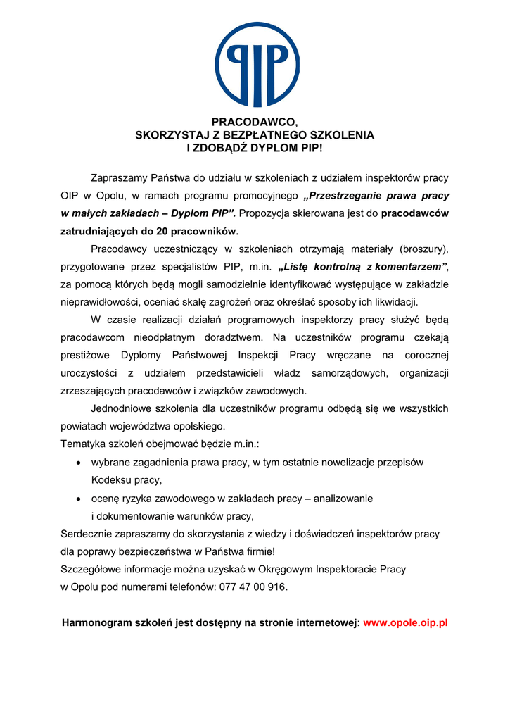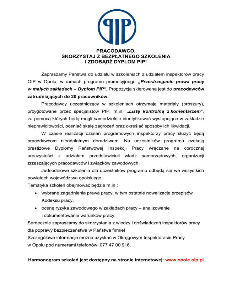 PRACODAWCO, SKORZYSTAJ Z BEZPŁATNEGO SZKOLENIA I ZDOBĄDŹ DYPLOM PIP! Zapraszamy Państwa do udziału w szkoleniach z udziałem inspektorów pracy OIP w Opolu, w ramach programu promocyjnego „Przestrzeganie prawa pracy w małych zakładach – Dyplom PIP”. Propozycja skierowana jest do pracodawców zatrudniających do 20 pracowników. Pracodawcy uczestniczący w szkoleniach otrzymają materiały (broszury), przygotowane przez specjalistów PIP, m.in. „Listę kontrolną z komentarzem”, za pomocą których będą mogli samodzielnie identyfikować występujące w zakładzie nieprawidłowości, oceniać skalę zagrożeń oraz określać sposoby ich likwidacji. W czasie realizacji działań programowych inspektorzy pracy służyć będą pracodawcom nieodpłatnym doradztwem. Na uczestników programu czekają prestiżowe uroczystości Dyplomy z Państwowej udziałem Inspekcji przedstawicieli Pracy władz wręczane na samorządowych, corocznej organizacji zrzeszających pracodawców i związków zawodowych. Jednodniowe szkolenia dla uczestników programu odbędą się we wszystkich powiatach województwa opolskiego. Tematyka szkoleń obejmować będzie m.in.: wybrane zagadnienia prawa pracy, w tym ostatnie nowelizacje przepisów Kodeksu pracy, ocenę ryzyka zawodowego w zakładach pracy – analizowanie i dokumentowanie warunków pracy, Serdecznie zapraszamy do skorzystania z wiedzy i doświadczeń inspektorów pracy dla poprawy bezpieczeństwa w Państwa firmie! Szczegółowe informacje można uzyskać w Okręgowym Inspektoracie Pracy w Opolu pod numerami telefonów: 077 47 00 916. Harmonogram szkoleń jest dostępny na stronie internetowej: www.opole.oip.pl