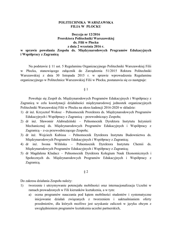 POLITECHNIKA WARSZAWSKA FILIA W PŁOCKU Decyzja nr 12/2016 Prorektora Politechniki Warszawskiej ds. Filii w Płocku z dnia 2 września 2016 r. w sprawie powołania Zespołu ds. Międzynarodowych Programów Edukacyjnych i Współpracy z Zagranicą Na podstawie § 11 ust. 5 Regulaminu Organizacyjnego Politechniki Warszawskiej Filii w Płocku, stanowiącego załącznik do Zarządzenia 51/2015 Rektora Politechniki Warszawskiej z dnia 30 listopada 2015 r. w sprawie wprowadzenia Regulaminu organizacyjnego w Politechnice Warszawskiej Filii w Płocku, postanawia się co następuje: §1 Powołuje się Zespół ds. Międzynarodowych Programów Edukacyjnych i Współpracy z Zagranicą w celu koordynacji działalności międzynarodowej jednostek organizacyjnych Politechniki Warszawskiej Filii w Płocku na okres kadencji 2016-2020 w składzie: 1) dr inż. Krzysztof Wołosz – Pełnomocnik Prorektora ds. Międzynarodowych Programów Edukacyjnych i Współpracy z Zagranicą – przewodniczący Zespołu; 2) dr inż. Sławomir Alabrudziński – Pełnomocnik Dyrektora Instytutu Inżynierii Mechanicznej ds. Międzynarodowych Programów Edukacyjnych i Współpracy z Zagranicą – z-ca przewodniczącego Zespołu; 3) dr inż. Wojciech Kubissa – Pełnomocnik Dyrektora Instytutu Budownictwa ds. Międzynarodowych Programów Edukacyjnych i Współpracy z Zagranicą; 4) dr inż. Iwona Wilińska – Pełnomocnik Dyrektora Instytutu Chemii ds. Międzynarodowych Programów Edukacyjnych i Współpracy z Zagranicą; 5) dr Magdalena Kludacz – Pełnomocnik Dyrektora Kolegium Nauk Ekonomicznych i Społecznych ds. Międzynarodowych Programów Edukacyjnych i Współpracy z Zagranicą. §2 Do zakresu działania Zespołu należy: 1) tworzenie i utrzymywanie potencjału mobilności oraz internacjonalizacja Uczelni w ramach prowadzonych w Fili kierunków kształcenia, a w tym: a) ocena programów nauczania pod kątem mobilności studentów i systematyczne inicjowanie działań związanych z tworzeniem i uaktualnianiem oferty przedmiotów, dla których możliwe jest uzyskanie zaliczeń w języku obcym z uwzględnieniem programów kształcenia uczelni partnerskich, 2) 3) 4) 5) 6) 7) b) promowanie wymiany międzynarodowej i staży zagranicznych wśród studentów (uczestniczenie m.in. w tworzeniu treści strony internetowej, organizowaniu spotkań informacyjnych, konsultacje ze studentami), c) promowanie mobilności edukacyjnej pracowników w ramach istniejących umów, inicjowanie aktualizacji lub zawierania kolejnych umów, d) wspieranie promocji Uczelni w kontaktach zagranicznych w zakresie oferty dla studentów i nauczycieli zagranicznych, współtworzenie biuletynów i przewodników dla studentów zagranicznych, e) systematyczna współpraca przy tworzeniu rozwiązań organizacyjnych i zapewnienia jakości mobilności oraz internacjonalizacji na poszczególnych kierunkach kształcenia, f) obsługa wizyt monitoringowych, prowadzenie korespondencji związanej z mobilnością i internacjonalizacją, g) uczestniczenie w opracowywaniu wniosków i porozumień o mobilności studentów i pracowników, h) nadzorowanie i wspieranie działań studentów będących "Mentorami" w ramach Erasmus Student Network Politechniki Warszawskiej; organizacja wymiany osobowej, a w szczególności: a) obsługa indywidualnej wymiany międzynarodowej (redagowanie wymaganych dokumentów i porozumień dotyczących mobilności indywidualnej studentów i pracowników, zgłaszanie potrzeby rezerwacji miejsc w Domu Studenckim, informowanie o niezbędnych ubezpieczeniach, odsyłanie do biuletynów informacyjnych), b) wsparcie merytoryczne przy zawieraniu umów indywidualnych w ramach umów Uczelnianych i Wydziałowych (Leaming Agreement for Studies, Learning Agreement for Traineeship, Teaching Agreement), c) wsparcie przy weryfikacji, uzgadnianiu i aneksowaniu porozumień o programie kształcenia studentów wyjeżdżających i wykładowców zagranicznych przyjeżdżających do Filii PW w Płocku, d) rekrutowanie studentów zagranicznych spośród nadesłanych zgłoszeń; raportowanie wymiany międzynarodowej, w szczególności: a) gromadzenie dokumentacji i przekazywanie danych o wymianie międzynarodowej na poszczególnych kierunkach kształcenia w celu tworzenia statystyk, uczestniczenie w opracowaniu sprawozdań, b) uczestniczenie w pozyskiwaniu środków finansowych i opracowywaniu wniosków (np. o dofinansowanie Organizacji Mobilności); udział w przygotowaniu umów, porozumień i zobowiązań z podmiotami zagranicznymi, prowadzenie ich ewidencji oraz monitorowanie realizacji; koordynowanie przygotowywania wniosków i kontraktów na realizację projektów międzynarodowych przez zespoły naukowo-badawcze Filii; przygotowywanie informacji i sprawozdań o działalności międzynarodowej dla Rady Wydziału BMiP oraz Rady Kolegium NEiS; koordynacja współpracy z Centrum Współpracy Międzynarodowej, promowanie programów międzynarodowych w środowisku PW Filii w Płocku. §3 Zespół współpracuje z prodziekanami Wydziału Budownictwa, Mechaniki i Petrochemii, dyrektorem Kolegium Nauk Ekonomicznych i Społecznych, kierownikiem Stacjonarnych Studiów Doktoranckich oraz kierownikami projektów międzynarodowych. §4 Decyzja wchodzi w życie z dniem podpisania. Prorektor Politechniki Warszawskiej prof. dr hab. inż. Janusz Zieliński