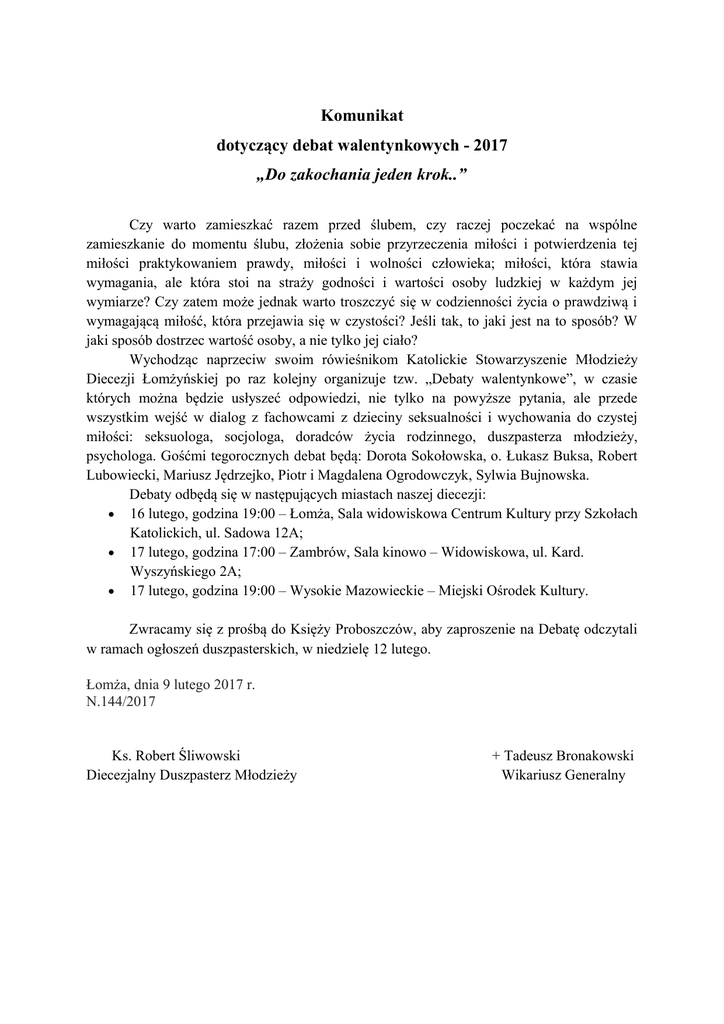 Komunikat dotyczący debat walentynkowych - 2017 „Do zakochania jeden krok..” Czy warto zamieszkać razem przed ślubem, czy raczej poczekać na wspólne zamieszkanie do momentu ślubu, złożenia sobie przyrzeczenia miłości i potwierdzenia tej miłości praktykowaniem prawdy, miłości i wolności człowieka; miłości, która stawia wymagania, ale która stoi na straży godności i wartości osoby ludzkiej w każdym jej wymiarze? Czy zatem może jednak warto troszczyć się w codzienności życia o prawdziwą i wymagającą miłość, która przejawia się w czystości? Jeśli tak, to jaki jest na to sposób? W jaki sposób dostrzec wartość osoby, a nie tylko jej ciało? Wychodząc naprzeciw swoim rówieśnikom Katolickie Stowarzyszenie Młodzieży Diecezji Łomżyńskiej po raz kolejny organizuje tzw. „Debaty walentynkowe”, w czasie których można będzie usłyszeć odpowiedzi, nie tylko na powyższe pytania, ale przede wszystkim wejść w dialog z fachowcami z dzieciny seksualności i wychowania do czystej miłości: seksuologa, socjologa, doradców życia rodzinnego, duszpasterza młodzieży, psychologa. Gośćmi tegorocznych debat będą: Dorota Sokołowska, o. Łukasz Buksa, Robert Lubowiecki, Mariusz Jędrzejko, Piotr i Magdalena Ogrodowczyk, Sylwia Bujnowska. Debaty odbędą się w następujących miastach naszej diecezji: 16 lutego, godzina 19:00 – Łomża, Sala widowiskowa Centrum Kultury przy Szkołach Katolickich, ul. Sadowa 12A; 17 lutego, godzina 17:00 – Zambrów, Sala kinowo – Widowiskowa, ul. Kard. Wyszyńskiego 2A; 17 lutego, godzina 19:00 – Wysokie Mazowieckie – Miejski Ośrodek Kultury. Zwracamy się z prośbą do Księży Proboszczów, aby zaproszenie na Debatę odczytali w ramach ogłoszeń duszpasterskich, w niedzielę 12 lutego. Łomża, dnia 9 lutego 2017 r. N.144/2017 Ks. Robert Śliwowski Diecezjalny Duszpasterz Młodzieży + Tadeusz Bronakowski Wikariusz Generalny