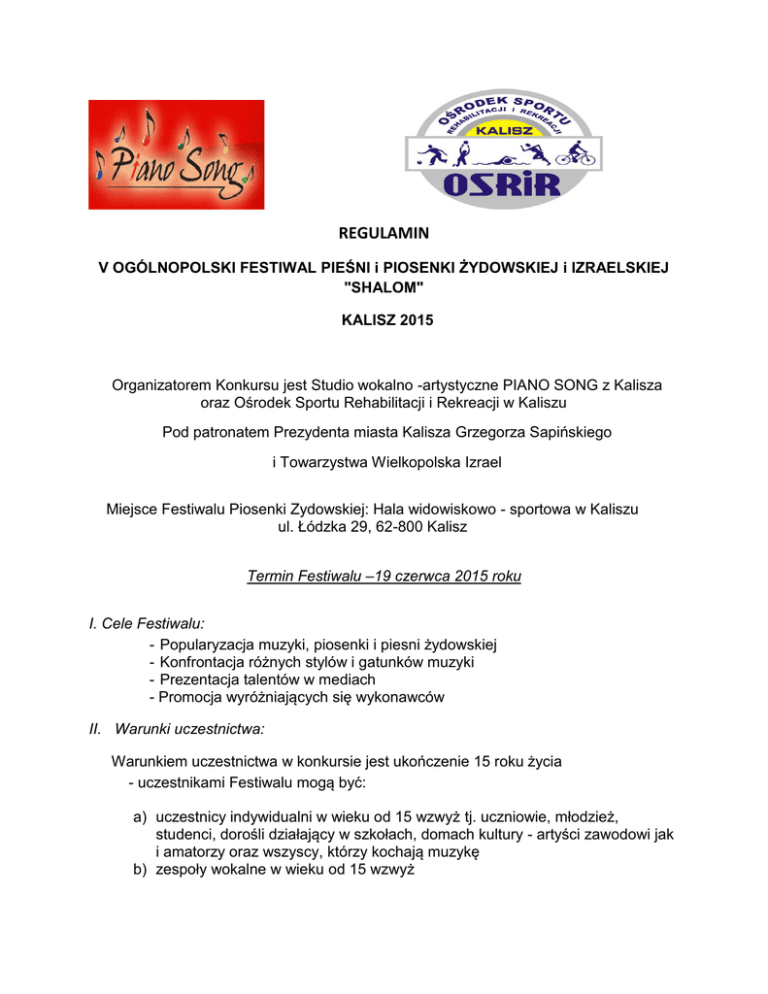 REGULAMIN V OGÓLNOPOLSKI FESTIWAL PIEŚNI i PIOSENKI ŻYDOWSKIEJ i IZRAELSKIEJ "SHALOM" KALISZ 2015 Organizatorem Konkursu jest Studio wokalno -artystyczne PIANO SONG z Kalisza oraz Ośrodek Sportu Rehabilitacji i Rekreacji w Kaliszu Pod patronatem Prezydenta miasta Kalisza Grzegorza Sapińskiego i Towarzystwa Wielkopolska Izrael Miejsce Festiwalu Piosenki Zydowskiej: Hala widowiskowo - sportowa w Kaliszu ul. Łódzka 29, 62-800 Kalisz Termin Festiwalu –19 czerwca 2015 roku I. Cele Festiwalu: - Popularyzacja muzyki, piosenki i piesni żydowskiej - Konfrontacja różnych stylów i gatunków muzyki - Prezentacja talentów w mediach - Promocja wyróżniających się wykonawców II. Warunki uczestnictwa: Warunkiem uczestnictwa w konkursie jest ukończenie 15 roku życia - uczestnikami Festiwalu mogą być: a) uczestnicy indywidualni w wieku od 15 wzwyż tj. uczniowie, młodzież, studenci, dorośli działający w szkołach, domach kultury - artyści zawodowi jak i amatorzy oraz wszyscy, którzy kochają muzykę b) zespoły wokalne w wieku od 15 wzwyż III. Wykonawcy zobowiązani są zgłosić 2 piosenki w języku polskim, jidisz lub hebrajskim związane z tematyką żydowską. Rozpatrywane będą zgłoszenia solistów i zespołów wokalnych. IV. Konkurs zostanie przeprowadzony w dwóch etapach: 1. Kwalifikacja na podstawie nadesłanych kart zgloszeń na adres lub drogą e-mailową: [email protected] lub Studio Piano Song , ul.Wiatraki 13a, 62-800 Kalisz Termin nadsyłania zgłoszeń upływa z dniem 31 maja 2015r. liczy sie data stępla pocztowego 2. Przesłuchania konkursowe z udziałem publiczności w dniu 19.06.2015 r. o godz.10.00 V. Zakwalifikowane zespoły i soliści w dniu imprezy wpłacają po 50 złotych od osoby i 70 zł od zespołu wokalnego, jako koszty akredytacji, która obejmuje napoje, materiały informacyjne, gadżety reklamowe, i inne, - Uczestnicy przyjeżdżają na konkurs na własny koszt. - Uczestnicy wystepują przy własnym poł playbacu lub z towarzyszeniem własnego instrumentu - Uczestnicy zobowiązani są do nadesłania na adres Organizatora wypełnionego formularza zgłoszeniowego - Organizatorzy zapewniają uczestnikom wysokiej klasy nagłośnienie, oświetlenie estradowe - Laureaci konkursu zobowiązani są do nieodpłatnego udziału w wieczornym koncercie laureatów przed wystepem gwiazdy, którą bedzie zespół Shalom - Organizatorzy zapewniają sobie prawo do nieodpłatnej rejestracji telewizyjnej, radiowej w ramach konkursu. - Organizator może zarezerwować miejsca noclegowe po wcześniejszym zgłoszeniu takiej potrzeby VI. Jury Oceny poszczególnych wokalistow i zespołów wokalnych oceniac bedzie profesjonalne jury. Jury powołane przez Organizatora przyznaje nagrody finansowe i rzeczowe. Jury przysługuje prawo wyłącznego dysponowania pulą nagród. Przewidywane wysokie nagrody pieniężne za I II III miejsca oraz nagrody rzeczowe lub pienieżne za wyróżnienia. VII.Postanowienia końcowe: - Wykonawcy występują zgodnie z harmonogramem ustalonym przez organizatorów, - Organizatorzy nie zwracają kosztów przejazdu, - Organizatorzy zapewniają: profesjonalne nagłośnienie, odtwarzacz CD, odtwarzacz do mini dysku, możliwość podłaczenia własnego instrumentu, posiłek - Zespoły i soliści wykonują dwie piosenki w języku polskim, jidisz lub hebrajskim i przyjeżdżają z własnym podkładem muzycznym - Jury zastrzega sobie prawo do ostatecznej interpretacji regulaminu i jego werdykt jest ostateczny. Biuro organizacyjne Konkursu: Studio wokalno-artystyczne Piano Song ul.Wiatraki 13 a 62-800 Kalisz dyrektor festiwalu: mgr Anna Kowalkiewicz-Oligny wszelkie informacje pod numerem: tel. 604 826 900 e-mail: [email protected] strona internetowa: www.pianosong.pl