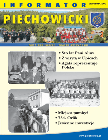 LISTOPAD 2009 • Sto lat Pani Aliny • Z wizytą w Upicach • Agata reprezentuje Polskę • Miejsca pamięci • 734. Orlik • Jesienne inwestycje www.piechowice.pl 2 INFORMATOR PIECHOWICKI • listopad 2009 Z prac burmistrza 30 października b.r. oddano do użytku kompleks sportowy Orlik 2012 (na zdjęciu). Tego samego dnia pracę na nim rozpoczęła instruktorka sportu i do końca listopada, jeżeli pozwoli na to aura, boiska będą nadal czynne. Śnieżna i mroźna zima to czas, gdy kompleks sportowy będzie niedostępny, natomiast od wiosny ruszy „całą parą”. Zamontowano na nim kilka kamer rejestrujących obraz, aby w razie jakichkolwiek zniszczeń, można było ustalić sprawców. Cieszę się, że niektórzy z Państwa żywo interesują się tym, co dzieje się na Orliku, bo jest to nasza wspólna sprawa i zapewniam, że zgłaszane uwagi będę analizowała, jak choćby tę, czy Orlik powinien być czynny w niedzielę. Listopad jest dla nas łaskawy. Ładna pogoda sprzyja ostatnim w tym roku pracom remontowym, które z pewnością poprawią bezpieczeństwo na drogach i ulicach naszego miasta. Warto wspomnieć tu o chodnikach przy przedszkolu i progach zwalniających przy szkole podstawowej wykonanych z własnych środków, a także o realizacji zadań ze środków pozyskanych z MSWiA tj.: remoncie 460 m nawierzchni ulicy Kolejowej , remoncie odcinka 132 m ul. Kolonijnej, ul. Słonecznej, regulacji cieku wodnego między ul. Zawadzkiego a ul. Słoneczną. Rozpoczęto także budowę chodników (dług. 117 mb) w ciągu ul. Cieplickiej. Jest to zadanie rozłożone na dwa etapy i zakończone zostanie w roku 2010. Zlecono Przedsiębiorstwu Melioracji i Inżynierii Środowiska EKO-MEL wykonanie mostku na potoku Piastówka w ciągu ul. Polnej. Odblokowano ulicę Chałubińskiego z powalonych drzew przy współpracy z Nadleśnictwem Szklarska Poręba i Strażą Pożarną W listopadzie finalizowane są prace zmierzające do złożenia przez spółkę KSWiK wniosku o dofinansowanie II etapu budowy kanalizacji w naszej gminie. My – jako miasto do tego zadania przygotowywaliśmy się przez 3 lata! Począwszy od podjęcia przez Radę Miasta stosownych uchwał uprawniających do wstąpienie do KSWIK, po dokończenie prac projektowych oraz uzyskanie pozwolenia na budowę. Jeżeli starania o pieniądze unijne powiodą się, a przekonamy się o tym wiosną przyszłego roku, nasze miasto stanie przed poważnym zadaniem: jak sprawnie i bez większych zakłóceń w życiu mieszkańców skanalizować część miasta za niebagatelną kwotę ponad 40 milionów zł! W listopadzie wystąpiłam do MSWiA o przyznanie dotacji celowej na realizację w roku 2010 zadań w ramach usuwania skutków klęsk żywiołowych, m.in. wykonanie nowej kładki przy dawnej Karelmie. Uczestniczyłam z liczną grupą mieszkańców Piechowic w wieczornicy z okazji Święta Niepodległości. Świetnie przygotowana uroczystość, wspólne patriotyczne za sprawą Szklarek śpiewanie sprawiły, że wieczór ten miał szczególny charakter. Trzeba przyznać, że POK corocznie staje na wysokości zadania, organizując tę uroczystość. Dwukrotnie odwiedziłam nasze partnerskie miasto Upice, raz z Radnymi Piechowic uczestnicząc w sesji i ponownie, aby podpisać dokumenty niezbędne do aplikowania o środki unijne. W najbliższą sobotę – 21 listopada będę miała wielką przyjemność brać udział w obchodach setnej rocznicy urodzin p. Aliny Jachimczyk i będzie to niewątpliwie jedno z bardziej wzruszających wydarzeń w mojej pracy. Pozwolę sobie w imieniu Państwa złożyć Dostojnej Jubilatce serdeczne życzenia, oby jeszcze długo i zdrowo żyła. Z wyrazami szacunku burmistrz Piechowic Zofia Grabias-Baranowska Nowe drzwi w POK Mercedes zamiast jelcza Po uregulowaniu formalności pomiędzy Piechowickim Ośrodkiem Kultury i Zarządem Nieruchomości „Wspólny Dom” rozpoczęto konstruktywną współpracę na rzecz modernizacji budynku ośrodka kultury. Jako priorytet potraktowano wymianę drzwi wejściowych i stolarki okiennej na sali widowiskowej. Pierwsza część zadania została już wykonana. Nowe drzwi chronią nas przed zimnem i poprawiają estetykę budynku. Kolejna cześć zadania zostanie wykonana do końca listopada br. (POK) Latem tego roku dwudziestoletni jelcz wywrotka użytkowany przez Zakład Usług Komunalnych zakończył swoją służbę. Został sprzedany w cenie złomu. Konieczne naprawy samochodu wielokrotnie przewyższały jego wartość. Nowy nabytek to używany mercedes przysto sowany do odśnieżania ulic. Stan techniczny samochodu oceniany jest jako bardzo dobry. Pojazd posiada napęd na cztery koła, skrzynię ładunkową mogącą pomieścić 9 ton. Zakup pojazdu w całości sfinansował ZUK z własnych wypracowanych środków. (ZUK) 3 INFORMATOR PIECHOWICKI • listopad 2009 LICZBA NUMERU 734 z kolei Orlik został otwarty 30 października w Piechowicach. Więcej na str. 10. Szansa na rozwój Piechowic Grupa Polcolorit planuje utworzenie w Piechowicach Karkonoskiego Parku Rozwoju Regionalnego. Park powstałby na terenach o powierzchni ponad 14 hektarów w pobliżu fabryki Marconi na terenach specjalnej strefy ekonomicznej. W pierwszym etapie wybudowano by halę produkcyjno-warsztatową z zapleczem technicznym. Część pomieszczeń byłaby przeznaczona na Inkubator Przedsiębiorczości, który powstałby na działce przy zjeździe do Piechowic z drogi krajowej. – Ideą utworzenia Parku jest podniesienie konkurencyjności naszego regionu – informuje Konrad Lewandowski z Grupy Polcolorit. Inkubator będzie ułatwiał rozpoczęcie działalności nowym firmom związanym z produkcją i rozwojem technologii. Cały obiekt będzie dostosowany do potrzeb osób niepełnosprawnych, a także będzie można w nim organizować konferencje naukowe. Przedsięwzięcie może być współfinansowane przez Unię Europejską w ramach Regionalnego Programu Operacyjnego. W Polsce działa 40 parków prz