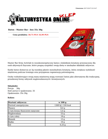 Utworzono: 2017-03-07 22:15:47 Baton - Master Bar - box 35x 30g Cena produktu: 50,75 PLN 34,99 PLN Master Bar firmy Activlab to wysokoenergetyczny baton z dodatkiem kreatyny przeznaczony dla osob aktywnych fizycznie, które pragną uzupełnić swoją dietę w niezbędne składniki odżywcze. Każdy baton dostarcza aż 3g wysokiej jakości monohydratu kreatyny, która zwiększa wydolność mięśniową podczas treningu oraz przyspiesza regenerację potreningową. Osoby rozbudowujące swoją masę mięśniową mogą rozważyć baton jako alternatywę dla tradycyjnej, proszkowej formy odżywek węglowodanowych i kreatynowych. Składniki: Porcja: 30g Ilość porcji w opakowaniu: 35 Opakowanie: 35x 30g Kokos: Wartość odżywcza Wartość energetyczna w 100 g 1369 kJ / 326 kcal Tłuszcz 8,0 g w tym kwasy tłuszczowe nasycone 5,4 g Węglowodany 53 g w tym cukry 18 g Błonnik 13 g Białko 19 g Sól 0,33 g Żurawina: Wartość odżywcza Wartość energetyczna w 100 g 1252 kJ / 299 kcal Tłuszcz 2,6 g w tym kwasy tłuszczowe nasycone 0,6 g Węglowodany 60 g w tym cukry 25 g Błonnik 11 g Białko 19 g Sól 0,32 g oligofruktoza, płatki owsiane, ekstrudat zbożowy [mąki 52% (kukurydziana, pszenna, ryżowa), kasza kukurydziana, otręby pszenne, cukier, kakao 4,6%, sól], płatki kukurydziane [kukurydza 93%, cukier, sól, ekstrakt słodowy jęczmienny, syrop glukozowy, emulgator: mono- i diglicerydy kwasów tłuszczowych), monohydrat kreatyny 10%, żurawina, substancja słodząca: maltodekstryna, tłuszcz palmowy, substancje utrzymujące wilgotność: sorbitol, glicerol, emulgator: lecytyna rzepakowa, aromat, substancja słodząca: sukraloza. Produkt może zawierać śladowe ilości orzechów i mleka. Sposób użycia: W zależności od diety i indywidualnego zapotrzebowania 1-3 batoników dziennie. Należy pamiętać o piciu większej ilości wody w czasie suplementacji. Nie przekraczać dziennej ilości porcji zalecanych przez producenta. Nie może być stosowany jako zamiennik bądź substytut zróżnicowanej diety. Produktu nie należy podawać matkom karmiącym oraz kobietom w ciąży. Adres: http://www.ko.sklep.pl/ Telefon: kom. 782 010 880 Email: [email protected]