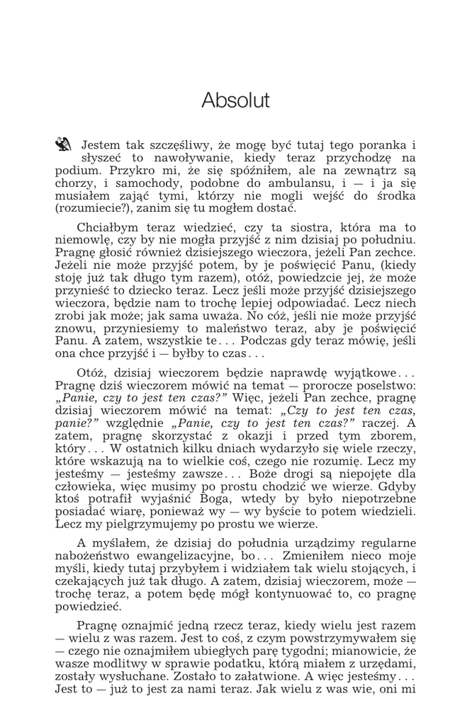 1 ABSOLUT Absolut ` Jestem tak szczliwy, e mog byø tutaj tego poranka i syszeø to nawoywanie, kiedy teraz przychodz na podium. Przykro mi, e si spóniem, ale na zewntrz s chorzy, i samochody, podobne do ambulansu, i _ i ja si musiaem zajø tymi, którzy nie mogli wejø do rodka (rozumiecie?), zanim si tu mogem dostaø. Chciabym teraz wiedzieø, czy ta siostra, która ma to niemowl, czy by nie moga przyjø z nim dzisiaj po poudniu. Pragn gosiø równie dzisiejszego wieczora, jeeli Pan zechce. Jeeli nie moe przyjø potem, by je powiciø Panu, (kiedy stoj ju tak dugo tym razem), otó, powiedzcie jej, e moe przynieø to dziecko teraz. Lecz jeli moe przyjø dzisiejszego wieczora, bdzie nam to troch lepiej odpowiadaø. Lecz niech zrobi jak moe; jak sama uwaa. No có, jeli nie moe przyjø znowu, przyniesiemy to male§stwo teraz, aby je powiciø Panu. A zatem, wszystkie te^ Podczas gdy teraz mówi, jeli ona chce przyjø i _ byby to czas^ Otó, dzisiaj wieczorem bdzie naprawd wyjtkowe^ Pragn dzi wieczorem mówiø na temat _ prorocze poselstwo: Panie, czy to jest ten czas? Wic, jeeli Pan zechce, pragn dzisiaj wieczorem mówiø na temat: Czy to jest ten czas, panie? wzgldnie Panie, czy to jest ten czas? raczej. A zatem, pragn skorzystaø z okazji i przed tym zborem, który^ W ostatnich kilku dniach wydarzyo si wiele rzeczy, które wskazuj na to wielkie co, czego nie rozumi. Lecz my jestemy _ jestemy zawsze^ Boe drogi s niepojte dla czowieka, wic musimy po prostu chodziø we wierze. Gdyby kto potrafi wyjaniø Boga, wtedy by byo niepotrzebne posiadaø wiar, poniewa wy _ wy bycie to potem wiedzieli. Lecz my pielgrzymujemy po prostu we wierze. A mylaem, e dzisiaj do poudnia urzdzimy regularne naboe§stwo ewangelizacyjne, bo^ Zmieniem nieco moje myli, kiedy tutaj przybyem i widziaem tak wielu stojcych, i czekajcych ju tak dugo. A zatem, dzisiaj wieczorem, moe _ troch teraz, a potem bd móg kontynuowaø to, co pragn powiedzieø. Pragn oznajmiø jedn rzecz teraz, kiedy wielu jest razem _ wielu z was razem. Jest to co, z czym powstrzymywaem si _ czego nie oznajmiem ubiegych par tygodni; mianowicie, e wasze modlitwy w sprawie podatku, któr miaem z urzdami, zostay wysuchane. Zostao to zaatwione. A wic jestemy^ Jest to _ ju to jest za nami teraz. Jak wielu z was wie, oni mi 2 MÓWIONE S~OWO zarzucali spraw czeków, które byy wypisane na t kampani; jednakowo oni twierdzili, e one s moje i chcieli pobraø ode mnie pewn kwot z trzystu piødziesiciu i kilku tysicy dolarów, uwaajc, e one s moj osobist wasnoci. A tak nie byo; byo to na t kampani. I zbór o tym wie; wszyscy o tym wiecie. I ostatecznie oni doszli do wniosku, e^ (Przedstawi wam tylko w ogólnym zarysie, co si wydarzyo.) Interesowali si t spraw okoo trzech do piciu lat niemal, (uwaam, e niespena piø lat), szperali tam i z powrotem; wiadectwo o moralnoci i tym podobnie. Lecz ja jestem tak wdziczny, e nie mogli znaleø niczego przeciwko mnie, nie mogli mnie wic z powodu tego zaskaryø. Nie znaleli wic niczego, z powodu czego by mnie mogli zaskaryø, myl, e powiedzieli tylko, e tutaj chodzi o nieznajomoø przepisów z mojej strony. Lecz ja si nie znam wiele na przepisach i przyniesiono mi te czeki, a ja je podpisaem _ zoyem na nich mój podpis i realizowalimy je w tej kampanii. Lecz potem, skoro tylko zoyem na nich mój podpis, one byy moje. Rozumiecie? Bez wzgldu na^ Oni rzekli: To jest bardzo mie od ciebie uczyniø co takiego, lecz one byy twoje, a potem dae je na rzecz zboru. Lecz skoro na nich zoye swój podpis, one byy twoje; niezalenie od tego, na co byy przeznaczone _ one byy napisane na ciebie. Tak, a gdyby na nich byo napisane _ gdyby kto na nich napisa dar osobisty, byo by to w porzdku. Lecz tam byo po prostu napisane William Branham (rozumiecie?); a kiedy ja zoyem na nich mój podpis, o to wanie chodzio; to byo powodem caego kopotu. Wic oni byli^ A zatem, w ko§cu dziki modlitwie^ A potem, niedawno, jak wiecie, oni _ ja miaem wizj, e duy, ciemny, zadymiony, czarny od sadzy, pokryty uskami (jak aligator) czowiek zblia si do mnie z wycignitymi elaznymi palcami. Ja miaem tylko may kozik, ot taki, a on mia po swojej stronie Wadz Stanów Zjednoczonych. I ja nie mogem nic uczyniø, byem bezsilny; a potem Pan wystpi na scen i on zosta pokonany. Przypominacie sobie, e wam o tym ju doø dawno opowiadaem. I pewnego dnia przedoyli mi kompromis. Mój adwokat, pan Orbison z New Albany, oraz Ice & Miller w Indianapolis zatelefonowa mi w sprawie tego podatku i rzek: Przyjed tutaj. I ja tam pojechaem, brat Roberson i ja, i moja ona, oraz powiernicy tego zboru tutaj; pojechalimy tam wszyscy, a oni nam powiedzieli, e maj zamiar _ e urzdy s ochotne przystpiø na kompromis. A ja powiedziaem: Ja _ jeeli jestem komu co duny, ja mu zapac. Lecz ja _ ja czyni wszystko, co w mych siach, lecz _ powiedziaem _ ja nie jestem tego duny. I dalej powiedziaem: Ja _ ja _ to jest^ Mówi szczerze, Bóg wie. ABSOLUT 3 A dlaczego mnie nie zaskaryli, jeeli jestem duny? Rzekem: Piø lat usiowali si o to, lecz nie mogli znaleø niczego, na podstawie czego by to mogli uczyniø. Powiedziaem wic: Nie, ja _ ja tego po prostu nie zapac, dopóki nie zostanie udowodnione, e jestem tego duny. A potem adwokat wzi mnie do siebie i rozmawia ze mn, i powiedzia: Nue, moemy si podjø tej sprawy. Wadze to bd próbowaø uczyniø. I powiedzia: Jeeli to uczyni, to jedyna rzecz, któr ci mog zarzuciø, jest to, e ty^ Co ja _ co^ Sposób, w jaki to czyniem; nie wiedziaem po prostu^ Nie znam si na ksigowoci, czyniem to wic w ten sposób, który uwaaem za uczciwy. A byo to _ nie byo to skadane w banku na moje nazwisko; zawsze byo to skadane na nazwisko zboru, kampanii, i tak dalej. Rozumiecie? Zatem, ja nie mogem nic uczyniø w tej sprawie. I ja^ On powiedzia: Otó, oni s ochotni przystpiø na kompromis na pitnastu tysicach dolarów, plus dziesiø tysicy dolarów kary; a honorarium dla adwokata wynosio pitnacie tysicy. To przedstawiao czterdzieci tysicy dla mnie. A wic, potem oni chc jeszcze dalszych 