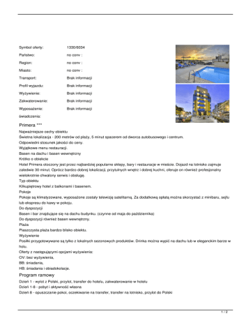 Symbol oferty: 1330/6034 Państwo: no conv : Region: no conv : Miasto: no conv : Transport: Brak informacji Profil wyjazdu: Brak informacji Wyżywienie: Brak informacji Zakwaterowanie: Brak informacji Wyposażenie: Brak informacji świadczenia: Primera *** Najważniejsze cechy obiektu Świetna lokalizacja - 200 metrów od plaży, 5 minut spacerem od dworca autobusowego i centrum. Odpowiedni stosunek jakości do ceny. Wyjątkowe menu restauracji. Basen na dachu i basen wewnętrzny Krótko o obiekcie Hotel Primera otoczony jest przez najbardziej popularne sklepy, bary i restauracje w mieście. Dojazd na lotnisko zajmuje zaledwie 30 minut. Oprócz bardzo dobrej lokalizacji, przytulnych wnętrz i dobrej kuchni, oferuje on również profesjonalny wielokrotnie chwalony serwis i obsługę. Typ obiektu Kilkupiętrowy hotel z balkonami i basenem. Pokoje Pokoje są klimatyzowane, wyposażone zostały telewizję satelitarną. Za dodatkową opłatą można skorzystać z minibaru, sejfu lub ekspresu do kawy w pokoju. Do dyspozycji Basen i bar znajdujące się na dachu budynku. (czynne od maja do października) Do dyspozycji również basen wewnętrzny. Plaża Piaszczysta plaża bardzo blisko obiektu. Wyżywienie Posiłki przygotowywane są tylko z lokalnych sezonowych produktów. Drinka można wypić na dachu lub w eleganckim barze w holu. Oferty z następującymi opcjami wyżywienia: OV: bez wyżywienia, BB: śniadania, HB: śniadania i obiadokolacje. Program ramowy Dzień 1 - wylot z Polski, przylot, transfer do hotelu, zakwaterowanie w hotelu Dzień 1-8 - pobyt i aktywność własna Dzień 8 - opuszczanie pokoi, oczekiwanie na transfer, transfer na lotnisko, przylot do Polski 1/2 Godziny odlotu i przylotu Poznań › Malta do 25.03.2016 11.10 - 14.10 (PON, PT) od 28.03.2016 10.10 - 13.10 (PON, PT) Malta › Poznań do 25.03.2016 7.45 - 10.45 (PON, PT) / od 28.03.2016 6.45 - 9.45 (PON, PT) Cena zawiera *7 noclegów *wyżywienie wg wybranej opcji *przelot samolotem Poznań - Malta - Poznań *ubezpieczenie KL, NNW i bagażu *transfer lotnisko-hotel-lotnisko *2 bagaże podręczne (1 bagaż do 10 kg o wymiarach 55cm x 40cm x 20cm, 2 mały bagaż podręczny o wymiarach 35cm x 20cm x 20 cm) Cena nie zawiera *bagaż rejestrowy do 15 kg w obie strony (sezon niski) - dopłata 150 zł/szt. Cena obowiązuje w dniu rezerwacji. Sezon niski obejmuje daty w okresie: 01/10/15 - 20/12/15 05/01/16 - 31/05/16 01/10/16 - 20/12/16 *bagaż rejestrowy do 15 kg w obie strony (sezon wysoki) - dopłata 240 zł/szt. Cena obowiązuje w dniu rezerwacji. Sezon wysoki obejmuje daty w okresie: 21/12/15 - 04/01/16 01/06/16 - 30/09/16 Dzieci/ulgi: *1 i 2 dziecko do 11,99 lat na łóżku pomocniczym - zniżka 20% *dzieci do lat 1,99 przy 2 osobach dorosłych - stała cena 380 zł Suplementy/pozostałe *pokój 1-osobowy - dopłata 40% *ubezpieczenie KR 5% wartości rezerwacji Uwagi *zaliczka 30% wartości rezerwacji dla ofert opartych na transporcie lotniczym rejsowym *przed zakupem prosimy o sprawdzenie dostępności terminów i obiektów TERMINY: CENNIK: Długość pobytu: dni Grupa cenowa: Waluta: Aktualne ceny z systemu S.A.R.T. (-) - cena usługi, podatku kalkulowana przy osobie lub gratis (*) - kwota wliczona w cenę standardową 2/2