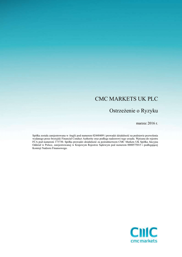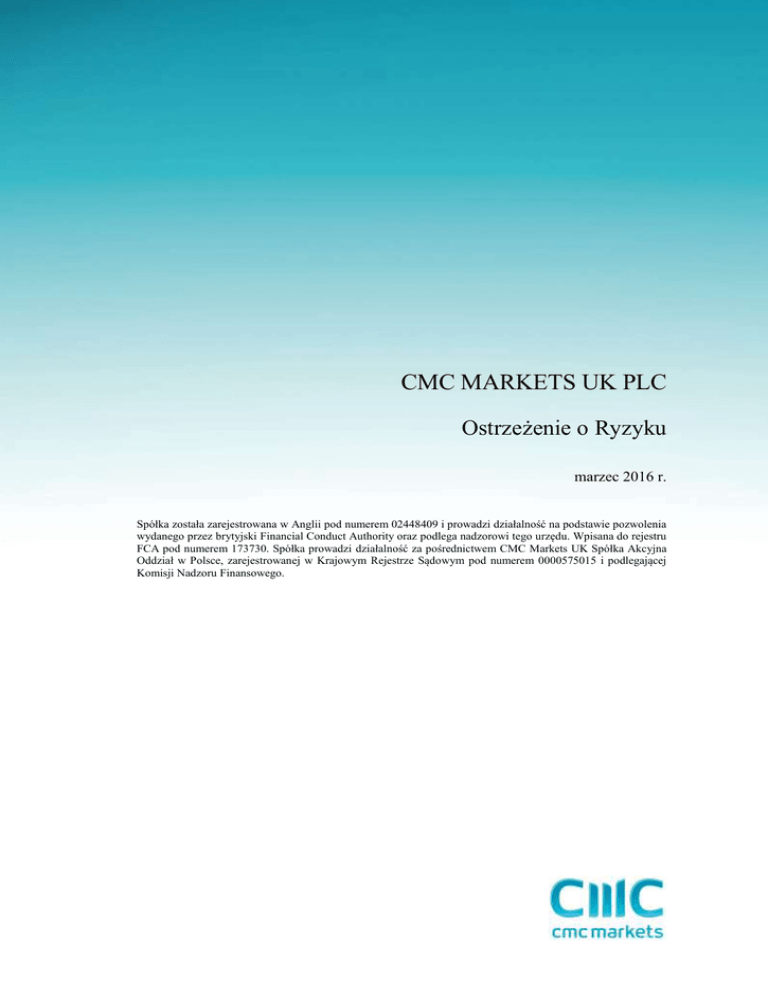CMC MARKETS UK PLC Ostrzeżenie o Ryzyku marzec 2016 r. Spółka została zarejestrowana w Anglii pod numerem 02448409 i prowadzi działalność na podstawie pozwolenia wydanego przez brytyjski Financial Conduct Authority oraz podlega nadzorowi tego urzędu. Wpisana do rejestru FCA pod numerem 173730. Spółka prowadzi działalność za pośrednictwem CMC Markets UK Spółka Akcyjna Oddział w Polsce, zarejestrowanej w Krajowym Rejestrze Sądowym pod numerem 0000575015 i podlegającej Komisji Nadzoru Finansowego. CMC Markets UK Plc – marzec 2016 r. 1 CMC Markets UK Plc – Ostrzeżenie o Ryzyku (marzec 2016 r.) SPIS TREŚCI 1. Ryzyko wynikające z faktu że lewarowane transakcje CFD, instrumenty binarne oraz kontrakty ekspresowe mogą nie być odpowiednimi instrumentami inwestycyjnymi dla Klienta ............................................................................................................................................4 2. Brak porad inwestycyjnych, podatkowych, prawnych, finansowych oraz porad w zakresie zgodności z przepisami ze strony CMC Markets ...........................................................................5 3. Ryzyko wynikające z faktu że oferowane przez CMC Markets lewarowane transakcje CFD, instrumenty binarne i kontrakty ekspresowe są instrumentami pochodnymi będącymi przedmiotem obrotu na rynku pozagiełdowym .............................................................5 4. Pełnienie przez CMC Markets funkcji animatora rynku ................................................................5 5. Możliwość poniesienia strat z lewarowanych transakcji CFD przekraczających kwotę depozytu .........................................................................................................................................5 6. W ramach każdej inwestycji w instrumenty binarne Klient może ponieść stratę równą wartości tych instrumentów. ..........................................................................................................7 7. Możliwość straty stawki w ramach kontraktu ekspresowego ........................................................7 8. Ryzyko związane z automatycznym zamykaniem lewarowanych transakcji CFD i pozycji Klienta ............................................................................................................................................7 9. Możliwość wpływu warunków rynkowych na lewarowane transakcje CFD, instrumenty binarne i/lub kontrakty ekspresowe Klienta ...................................................................................7 10. Ryzyko że lewarowana transakcja CFD zostanie zrealizowana po cenie innej niż wyświetlona na platformie w chwili składania przez Klienta zlecenia ..........................................8 11. Wpływ ryzyka technicznego i innych okoliczności na lewarowane transakcje CFD, instrumenty binarne i/lub kontrakty ekspresowe ...........................................................................8 12. Różne czynniki ryzyka wiążące się z różnymi instrumentami.......................................................9 13. Rynki zagraniczne jako źródło dodatkowego ryzyka ....................................................................9 14. Ryzyko związane z finansowaniem lewarowanych transakcji CFD, instrumentów binarnych i/lub kontraktów ekspresowych Klienta środkami pochodzącymi z kredytu ................9 15. Brak gwarancji przyszłych wyników na podstawie wyników odnotowanych w przeszłości ........9 16. Brak gwarancji ochrony środków pieniężnych Klienta ze strony Spółki ....................................10 17. Brak nadzoru brytyjskiego Urzędu ds. Regulacji Działalności Finansowej (FCA) w odniesieniu do kontraktów ekspresowych ...................................................................................10 CMC Markets UK Plc – marzec 2016 r. 2 18. Możliwe różnice w zasadach opodatkowania ..............................................................................10 19. Dostęp do platformy za pośrednictwem aplikacji mobilnych ......................................................10 20. Ograniczenie dotyczące materiałów i treści osób trzecich...........................................................10 CMC Markets UK Plc – marzec 2016 r. 3 CMC Markets UK plc – Ostrzeżenie o Ryzyku (marzec 2016 r.) Przed zaakceptowaniem niniejszego Ostrzeżenia o Ryzyku Klient powinien się z nim zapoznać i upewnić się, że rozumie jego treść. CMC Markets UK Plc prowadząca działalność za pośrednictwem CMC Markets UK Spółka Akcyjna Oddział w Polsce (zwana dalej „CMC Markets” lub „Spółką”) zobowiązuje się do postępowania wobec Klienta w sposób uczciwy. Informacje przekazane przez CMC Markets w niniejszym dokumencie mają na celu ułatwienie Klientowi zrozumienia charakteru lewarowanych transakcji CFD, instrumentów binarnych, kontraktów ekspresowych i usług świadczonych przez CMC Markets oraz wiążącego się z nimi ryzyka. Dokument ten nie zawiera jednak wyjaśnienia wszystkich czynników ryzyka i wszystkich innych istotnych aspektów związanych z inwestycjami w lewarowane transakcje CFD, instrumenty binarne i/lub kontrakty ekspresowe oferowane przez CMC Markets. Zaleca się szczegółowe zapoznanie się z wszystkimi stosownymi informacjami przekazanymi przez CMC Markets, w tym z niniejszym Ostrzeżeniem o Ryzyku, Warunkami Prowadzenia Działalności i Podsumowaniem Polityki Realizacji Zleceń, jak również z informacjami zamieszczonymi na stronie internetowej oraz platformie transakcyjnej Spółki. Oferowane przez CMC Markets instrumenty mogą nieść ze sobą wysokie ryzyko strat w wypadku gwałtownych wahań kursów. W wypadku inwestycji w lewarowane transakcje CFD ewentualne straty mogą przewyższać początkową wartość inwestycji i wiązać się z koniecznością wniesienia dodatkowych wpłat. Należy pamiętać, że im wyższy poziom dźwigni finansowej (o i
