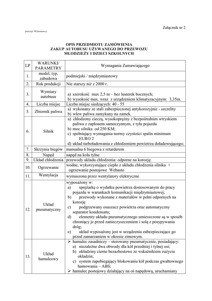 Załącznik nr 2 pieczęć Wykonawcy OPIS PRZEDMIOTU ZAMÓWIENIA ZAKUP AUTOBUSU UŻYWANEGO DO PRZEWOZU MŁODZIEŻY I DZIECI SZKOLNYCH LP 1. 2. 3. WARUNKI/ PARAMETRY model, typ, zabudowa Rok produkcji Wymiary autobusu Wymagania Zamawiającego podmiejski / międzymiastowy Nie starszy niż z 2000 r. a) szerokość max 2,5 m – bez lusterek bocznych; b) wysokość max. wraz z urządzeniem klimatyzacyjnym: 3,35m. 4. Liczba miejsc Liczba miejsc siedzących: 40 - 55 a) wykonany ze stali zabezpieczonej antykorozyjnie - szczelny 5. Zbiornik paliwa b) wlew paliwa zamykany na zamek. a) chłodzony cieczą, wysokoprężny z bezpośrednim wtryskiem paliwa z zapłonem samoczynnym, z tyłu pojazdu b) moc silnika od 250 KM; 6. Silnik c) spełniający wymagania normy czystości spalin minimum EURO 2 d) układ turboładowania z chłodzeniem powietrza doładowującego; 7. Skrzynia biegów manualna 6 biegowa z retarderem 8. Napęd napęd na koła tylne 9. Układ chłodzenia przewody układu chłodzenia: odporne na korozję. wodne, wykorzystujące ciepło z układu chłodzenia silnika + 10. Ogrzewanie ogrzewanie postojowe Webasto Wentylacja 11. wymuszona przez wentylatory elektryczne wyposażony w: a) sprężarkę o wydatku powietrza dostosowanym do pracy pojazdu w warunkach komunikacji międzymiastowej; b) przewody wykonane z materiałów w pełni odpornych na korozję Układ c) podgrzewany osuszacz powietrza oraz automatyczny 12. pneumatyczny separator kondensatu; d) elementy układu pneumatycznego umieszczone są w sposób chroniący je przed zanieczyszczeniem i solą z posypywania dróg; e) układ wyposażony jest w urządzenia zabezpieczające go przed zamarzaniem w okresie zimowym. hamulec zasadniczy – sterowany pneumatycznie, posiadający: a) niezależne dwa obwody dla kół przedniej i tylnej osi; b) okładziny cierne bezazbestowe ze wskaźnikiem zużycia Układ okładzin; 13. hamulcowy c) system zapobiegający blokowaniu kół podczas gwałtownego hamowania – ABS; hamulec postojowy działający na oś napędową, uruchamiany bezcięgłowo dźwignią na desce rozdzielczej kierowcy; 14. 15. Układ kierowniczy Zawieszenie ze wspomaganiem hydraulicznym pneumatyczne na miechach gumowych, z układem poziomującym, z możliwością zmiany poziomu z pulpitu kierowcy, oś tylna pojedyncza; a) 16 Nadwozie 17. Wykończenie wnętrza 18. 19. Przedział pasażerski Siedzenia pasażerskie 20. Drzwi 21. Miejsce pracy kierowcy 22. Instalacja elektryczna szkielet wraz z ramą – konstrukcja spawana z profili wykonanych ze stali zabezpieczonej antykorozyjnie; b) wszystkie wewnętrzne powierzchnie profili zabezpieczone przed korozją preparatem ochronnym o wysokiej jakości. Profile wyposażone w otwory ściekowe do usuwania wody; c) wszystkie zewnętrzne powierzchnie profili zabezpieczone dodatkowo preparatem asfaltowo-woskowym, odpornym na wodę, agresywne chemicznie środki utrzymania dróg, uderzenia kamieni itp.; podłoga – płyta wodoodporna, pokryta wykładziną antypoślizgową, twardą ( o dużej trwałości ) zgrzewaną na łączeniach i wykończona listwami ozdobnymi, łatwa do utrzymania czystości na całej długości autobusu, przystosowana do zmywania bieżącą wodą. klimatyzacja całej przestrzeni pasażerskiej realizowana przez agregat klimatyzacyjny; Wysokie, tapicerowane, wszystkie skierowane do przodu, wyposażone w pasy bezpieczeństwa a) dwoje drzwi w układzie 1 – 2, dwuskrzydłowych wyposażonych w mechanizm powrotnego otwierania w przypadku natrafienia na przeszkodę; b) każde ze skrzydeł drzwi wyposażone w poręcze dla wsiadających; c) sterowanie drzwi: z miejsca pracy kierowcy; d) wszystkie drzwi wyposażone w zamki umożliwiające ich ryglowanie, a pierwsze drzwi wyposażone w zamek patentowy; a) klimatyzacja miejsca pracy kierowcy realizowana przez agregat klimatyzacyjny całej przestrzeni pasażerskiej; b) lusterka zewnętrzne podgrzewane i regulowane elektrycznie, lusterka wewnętrzne zapewniające dostateczną widoczność przedziału pasażerskiego; c) osłony przeciwsłoneczne: dla lewej strony szyby czołowej i lewej szyby bocznej kabiny kierowcy; d) zamykany na klucz schowek na drobne, osobiste przedmioty kierowcy; e) fotel kierowcy z podgłówkiem i z wielopołożeniową możliwością regulacji siedziska i oparcia, zawieszony pneumatycznie; a) napięcie 24 V; b) wiązki przewodów ułożone w szczelnie zamkniętych kanałach lub przewodach zabezpieczających je przed zabrudzeniami i wilgocią w czasie eksploatacji , szczególnie w warunkach zimowych. c) a) 23. 24. 25. 26. rozsuwana lewa szyba boczna w oknie bocznym kabiny kierowcy, ogrzewana elektrycznie i nadmuchem ciepłego Okna powietrza; b) szyba przednia ze szkła wielowarstwowego klejonego; c) wszystkie szyby gładkie wykonane ze szkła hartowanego; a) obręcze stalowe; b) opony radialne, całostalowe, bezdętkowe z maksymalnym zużyciem nie przekraczającym 30%; Koła i ogumienie c) wszystkie opony jednej marki, typu i o jednakowym bieżniku; d) wszystkie koła wyważone; e) jedno kompletne koło zapasowe a) separator wody w układzie zasilania; b) zaczepy holownicze przednie i tylne; c) dwie sześciokilogramowe gaśnice – jedna umieszczona w łatwo Inne urządzenia dostępnym miejscu przestrzeni pasażerskiej, zabezpieczona i wyposażenie przed kradzieżą; d) wyposażony w tachograf z ważną legalizacją; e) wyprowadzenie przewodów do podłączenia radioodbiornika; Poszycie zewnętrzne: powłoki zewnętrzne wykonane lakierami Powłoki i poliuretanowymi lub akrylowymi. kolorystyka …………………………….. miejscowość, data ............................................................................. podpis i pieczątka imienna uprawnionego(ych) przedstawiciela (eli) firmy