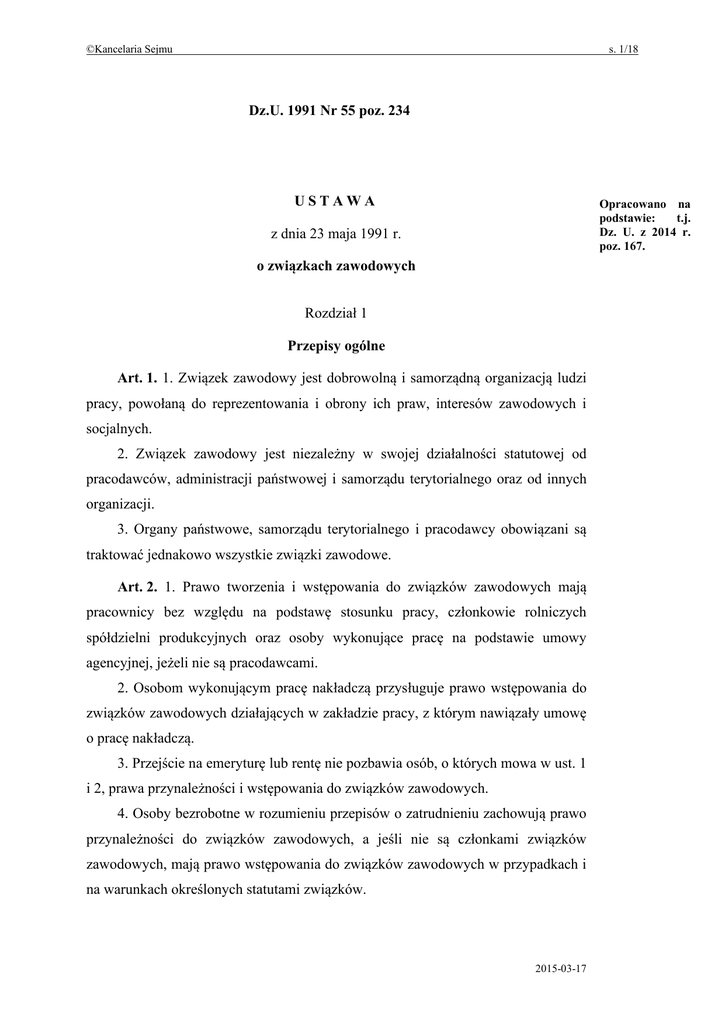 ©Kancelaria Sejmu s. 1/18 Dz.U. 1991 Nr 55 poz. 234 USTAWA Opracowano na podstawie: t.j. Dz. U. z 2014 r. poz. 167. z dnia 23 maja 1991 r. o związkach zawodowych Rozdział 1 Przepisy ogólne Art. 1. 1. Związek zawodowy jest dobrowolną i samorządną organizacją ludzi pracy, powołaną do reprezentowania i obrony ich praw, interesów zawodowych i socjalnych. 2. Związek zawodowy jest niezależny w swojej działalności statutowej od pracodawców, administracji państwowej i samorządu terytorialnego oraz od innych organizacji. 3. Organy państwowe, samorządu terytorialnego i pracodawcy obowiązani są traktować jednakowo wszystkie związki zawodowe. Art. 2. 1. Prawo tworzenia i wstępowania do związków zawodowych mają pracownicy bez względu na podstawę stosunku pracy, członkowie rolniczych spółdzielni produkcyjnych oraz osoby wykonujące pracę na podstawie umowy agencyjnej, jeżeli nie są pracodawcami. 2. Osobom wykonującym pracę nakładczą przysługuje prawo wstępowania do związków zawodowych działających w zakładzie pracy, z którym nawiązały umowę o pracę nakładczą. 3. Przejście na emeryturę lub rentę nie pozbawia osób, o których mowa w ust. 1 i 2, prawa przynależności i wstępowania do związków zawodowych. 4. Osoby bezrobotne w rozumieniu przepisów o zatrudnieniu zachowują prawo przynależności do związków zawodowych, a jeśli nie są członkami związków zawodowych, mają prawo wstępowania do związków zawodowych w przypadkach i na warunkach określonych statutami związków. 2015-03-17 ©Kancelaria Sejmu s. 2/18 5. Prawo tworzenia i wstępowania do związków zawodowych w zakładach pracy przysługuje również osobom skierowanym do tych zakładów w celu odbycia służby zastępczej. 6. Do praw związkowych funkcjonariuszy Policji, Straży Granicznej i Służby Więziennej oraz strażaków Państwowej Straży Pożarnej, a także pracowników Najwyższej Izby Kontroli stosuje się odpowiednio przepisy niniejszej ustawy, z uwzględnieniem ograniczeń wynikających z odrębnych ustaw. 7. Przepisy ustawy dotyczące pracowników stosuje się odpowiednio również do innych osób, o których mowa w ust. 1–6. Art. 3. Nikt nie może ponosić ujemnych następstw z powodu przynależności do związku zawodowego lub pozostawania poza nim albo wykonywania funkcji związkowej. W szczególności nie może to być warunkiem nawiązania stosunku pracy i pozostawania w zatrudnieniu oraz awansowania pracownika. Art. 4. Związki zawodowe reprezentują pracowników i inne osoby, o których mowa w art. 2, a także bronią ich godności, praw oraz interesów materialnych i moralnych, zarówno zbiorowych, jak i indywidualnych. Art. 5. Związki zawodowe mają prawo reprezentowania interesów pracowniczych na forum międzynarodowym. Art. 6. Związki zawodowe współuczestniczą w tworzeniu korzystnych warunków pracy, bytu i wypoczynku. Art. 7. 1. W zakresie praw i interesów zbiorowych związki zawodowe reprezentują wszystkich pracowników, niezależnie od ich przynależności związkowej. 2. W sprawach indywidualnych stosunków pracy związki zawodowe reprezentują prawa i interesy swoich członków. Na wniosek pracownika niezrzeszonego związek zawodowy może podjąć się obrony jego praw i interesów wobec pracodawcy. Art. 8. Na zasadach przewidzianych w niniejszej ustawie oraz w ustawach odrębnych związki zawodowe kontrolują przestrzeganie przepisów dotyczących interesów pracowników, emerytów, rencistów, bezrobotnych i ich rodzin. 2015-03-17 ©Kancelaria Sejmu s. 3/18 Art. 9. Statuty oraz uchwały związkowe określają swobodnie struktury organizacyjne związków zawodowych. Zobowiązania majątkowe mogą podejmować wyłącznie statutowe organy struktur związkowych posiadających osobowość prawną. Art. 10. Zasady członkostwa w związku zawodowym oraz sprawowania funkcji związkowych ustalają statuty i uchwały statutowych organów związkowych. Art. 11. 1. Związki zawodowe mają prawo tworzyć ogólnokrajowe zrzeszenia (federacje) związków zawodowych. 2. Ogólnokrajowe związki zawodowe i zrzeszenia związków zawodowych mogą tworzyć ogólnokrajowe organizacje międzyzwiązkowe (konfederacje). 3. Organizacje związkowe, w tym federacje i konfederacje, mają prawo tworzenia i wstępowania do międzynarodowych organizacji pracowników. Rozdział 2 Tworzenie związków zawodowych Art. 12. 1. Związek zawodowy powstaje z mocy uchwały o jego utworzeniu, podjętej przez co najmniej 10 osób uprawnionych do tworzenia związków zawodowych. 2. Osoby, które podjęły uchwałę o utworzeniu związku zawodowego, uchwalają statut i wybierają komitet założycielski w liczbie od 3 do 7 osób. Art. 13. Statut związku zawodowego określa w szczególności: 1) nazwę związku; 2) siedzibę związku; 3) terytorialny i podmiotowy zakres działania; 4) cele i zadania związku oraz sposoby i formy ich realizacji; 5) zasady nabywania i utraty członkostwa; 6) prawa i obowiązki członków; 7) strukturę organizacyjną związku ze wskazaniem, które z jednostek organizacyjnych związku mają osobowość prawną; 8) sposób reprezentowania związku oraz osoby upoważnione do zaciągania zobowiązań majątkowych w imieniu związku; 2015-03-17 ©Kancelaria Sejmu 9) s. 4/18 organy związku, tryb ich wyboru i odwołania, zakres ich kompetencji oraz okres kadencji; 10) źródła finansowania działalności związku oraz sposób ustanawiania składek członkowskich; 11) zasady uchwalania i zmian statutu; 12) sposób rozwiązania związku i likwidacji jego majątku. Art. 14. 1. Związek zawodowy podlega obowiązkowi rejestracji w Krajowym Rejestrze Sądowym, zwanym dalej „rejestrem”. 2. Jeżeli komitet założycielski nie złoży w terminie 30 dni od dnia założenia związku wniosku o rejestrację, uchwała o utworzeniu związku traci moc. 3. Postępowanie w sprawach rejestracji jest wolne od opłat sądowych. Art. 15. 1. Związek zawodowy oraz j