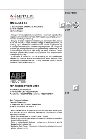 Stoisko / Stand 4metal Sp. z o.o. ul. Zamenhofa 20 lok. 4, 90-510 Łódź, Polska/Poland tel. +48 42 256 90 00 http://www.4metal.pl e-61a W ciągu 9 lat naszej działalności, platforma 4metal stała się najbardziej rozpoznawalnym źródłem informacji dla firm poszukujących podwykonawców oraz branżowych informacji. Liczymy, że dzięki magazynowi dotrzemy do grona osób, które jeszcze o nas nie słyszały, a także zwrócimy uwagę na naszą działalność, co przełoży się na zwiększone zainteresowanie firmami znajdującymi się w katalogu i na atrakcyjność zamieszczonych ogłoszeń. Nie samą pracą człowiek żyje, dlatego oprócz najnowszych informacji branżowych, w naszym magazynie znajdziecie takie działy jak hobby, rozrywka, kultura, inspiracje, gadżety, których chęć zdobycia będzie Was motywowała do intensywniejszej pracy. Czasopismo w nakładzie 5 000 egzemplarzy jest kolportowane nieodpłatnie do członków 4metal oraz nieodpłatnie wśród wybranych firm poszukujących podwykonawców z branży metalowej, ponadto istnieje możliwość prenumeraty magazynu. ABP Induction Systems GmbH Kanalstraße 25, 44147 Dortmund tel. +49 (0)231 997 0, fax +49 (0)231 997 2467 Phone Service +49 (0)231 997 2392, Fax Service +49 (0)231 997 2431 e-56 Biuro Techniczno Handlowe: Przemysłu Odlewniczego ul. Książęca 20a, 40-725 Katowice, Polska/Poland tel. +48 32 202 26 36, fax +48 32 202 26 83 Firma ABP jest wiodącym producentem pieców i nagrzewnic indukcyjnych a jej program produkcji bazuje na najnowszych osiągnięciach techniki światowej i obejmuje: • Piece do przetrzymywania ciekłych metali i stopów • Piece do automatycznego zalewania form współpracujące ze wszystkimi typami linii formierskich • Piece o częstotliwości sieciowej i podwyższonej do topienia stopów żelaza i metali nieżelaznych • Zasilanie „Twin-Power” (równoległe i równoczesne) zasilanie dwóch pieców lub nagrzewnic 1 METAL / NONFERMET 2014 • Nagrzewnice od indukcyjnego nagrzewania kęsów, prętów, rur itd. przed obróbka plastyczną • Nagrzewnice przelotowe i strefowe rur • Nagrzewnice z tyrystorowymi przemiennikami średniej częstotliwości • Nagrzewnice przelotowe prętów w połączeniu z cięciem na gorąco • Usługi serwisowe • Modernizacje • Części zamienne do pieców indukcyjnych Stoisko / Stand Firma obecna na stoisku firmy BITECH Polska - patrz osobny wpis/look at separate catalogue entry. AKADEMIA GÓRNICZO HUTNICZA im. Stanisława Staszica w Krakowie Wydział Odlewnictwa ul. Reymonta 23, 30-059 Kraków, Polska/Poland http://www.agh.edu.pl AGH - UNIVERSITY OF SCIENCE AND TECHNOLOGY Faculty of Foundry Engineering ul. Reymonta 23, 30-059 Cracow, Poland e-mail: www.agh.edu.pl Wydział Odlewnictwa Akademii Górniczo-Hutniczej od chwili swego powstania w 1951 roku jest jedynym wydziałem o tym profilu w strukturze szkolnictwa wyższego w Polsce i w Europie. Mając pełne prawa akademickie w zakresie kształcenia oferuje studia inżynierskie, magisterskie, doktoranckie i podyplomowe. W oparciu o nowoczesne programy kształci specjalistów w różnych obszarach techniki odlewniczej, jak: • Odlewnictwo ogólne (technologie, maszyny i urządzenia, mechanizacja), • Odlewnictwo artystyczne i precyzyjne, • Ochrona środowiska w odlewnictwie, • Wirtualizacja technologii odlewniczych. W swej dotychczasowej działalności Wydział Odlewnictwa wypromował ponad 1100 inżynierów, ponad 2670 magistrów inżynierów, 185 doktorów i 35 doktorów habilitowanych. Since its foundation in 1951 the Faculty of Foundry Engineering in AGH University of Science and Technology is the only faculty with such the profile within the Polish and European Higher Education system. Fully qualified for promoting for all academic degrees the Faculty offers the complete BA, MA, SD and postgraduate studies. The graduates are being educated on the basis of the most innovative teaching programs in following aspects of foundry engineering: • general foundry (technologies, machinery, mechanization), • artistic and precise foundry, • environmental protection in foundry, 2 e-78 • virtualization of foundry technologies. The Faculty of Foundry Engineering in AGH has graduated so far more then: 1100 engineers, 2670 MA engineers, over 185 doctors and 35 professors. Stoisko / Stand AGRATI Corso Europa, 39, 24040 Zingonia (Bg), Italy tel. +39 035 88 57 56, fax +39 035 88 43 52 e-mail: [email protected], http://www.agrati.it e-103 Maszyny zimno- komorowe do odlewania ciśnieniowego aluminium i magnezu, maszyny gorąco- komorowe do odlewnia ciśnieniowego magnezu i znalu, kadzie metalowe, automatyczne smarownice, kompletne gniazda odlewnicze. Nasze doświadczenie i kompetencje pozwalają na realizację „pod klucz” kompletnych gniazd odlewniczych dopasowanych do określonych potrzeb naszych klientów. Cold chamber machines for aluminium and magnesium diecasting, hot chamber machines for magnesium and zamak diecasting, metal ladles, automatic lubricators, complete casting cells. Our experience and competence allows the realization of „turnkey” complete casting cells designed to answer the specific needs of our customers. AirSeal POLSKA LTD BOX 40, 78 Golders Green Road NW118LN, Londyn, Wielka Brytania tel. +48 603 504 884, e-mail: [email protected] tel. +48 693 127 754, e-mail: [email protected] tel. +44 770 748 8483, e-mail: [email protected] e-15 AIRSEAL POLSKA Ltd od 2014 r. jest wyłącznym autoryzowanym dystrybutorem na terenie Polski proaktywnych żeli uszczelniających do opon brytyjskiej firmy AIR SEAL PRODUCTS Ltd. Nasze żele uszczelniają przebicia w oponie aż do 30 mm. Żele AIR SEAL, jako jedyny na rynku, mogą być prewencyjnie aplikowany do opon pojazdów poruszających się z prędkością powyżej 80 km/h. W naszej ofercie posiadamy dwa rodzaje uszczelniaczy do opon Heavy Duty i Armor-Seal. Więcej informacji na naszej stronie www.airseal.pl lub pod numerem 603 504 8