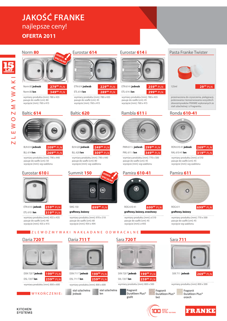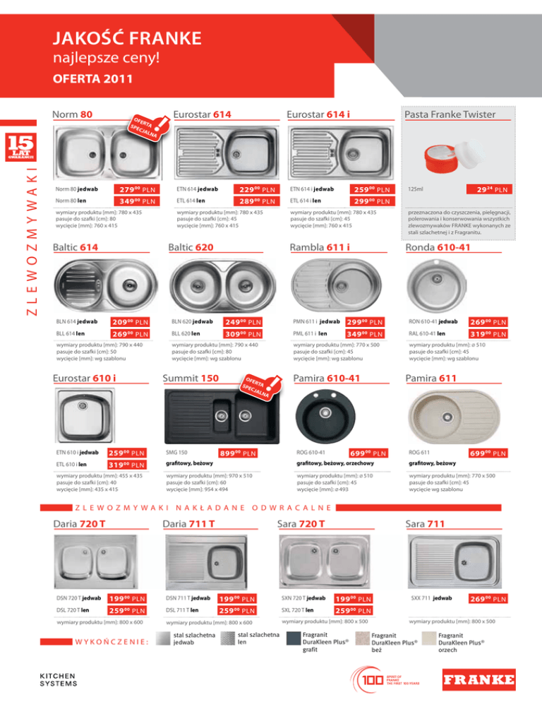 JAKOŚĆ FRANKE najlepsze ceny! OFERTA 2011 ! Z L E W O Z M YW A KI Norm 80 OF ER SPE TA CJA LNA Eurostar 614 Eurostar 614 i Pasta Franke Twister Norm 80 jedwab 279 00 PLN ETN 614 jedwab 229 00 PLN ETN 614 i jedwab 259 00 PLN Norm 80 len 349 00 PLN ETL 614 len 289 00 PLN ETL 614 i len 299 00 PLN wymiary produktu [mm]: 780 x 435 pasuje do szafki [cm]: 80 wycięcie [mm]: 760 x 415 Baltic 614 wymiary produktu [mm]: 780 x 435 pasuje do szafki [cm]: 45 wycięcie [mm]: 760 x 415 wymiary produktu [mm]: 780 x 435 pasuje do szafki [cm]: 45 wycięcie [mm]: 760 x 415 Baltic 620 Rambla 611 i 29 24 PLN 125ml przeznaczona do czyszczenia, pielęgnacji, polerowania i konserwowania wszystkich zlewozmywaków FRANKE wykonanych ze stali szlachetnej i z Fragranitu. Ronda 610-41 BLN 614 jedwab 209 00 PLN BLN 620 jedwab 249 00 PLN PMN 611 i jedwab 299 00 PLN RON 610-41 jedwab 269 00 PLN BLL 614 len 269 00 PLN BLL 620 len 309 00 PLN PML 611 i len 349 00 PLN RAL 610-41 len 319 00 PLN wymiary produktu [mm]: 790 x 440 pasuje do szafki [cm]: 50 wycięcie [mm]: wg szablonu Eurostar 610 i wymiary produktu [mm]: 790 x 440 pasuje do szafki [cm]: 80 wycięcie [mm]: wg szablonu Summit 150 wymiary produktu [mm]: 770 x 500 pasuje do szafki [cm]: 45 wycięcie [mm]: wg szablonu ! Pamira 610-41 OF ER SPE TA CJA LNA wymiary produktu [mm]: Ø 510 pasuje do szafki [cm]: 45 wycięcie [mm]: wg szablonu Pamira 611 ETN 610 i jedwab 259 00 PLN SMG 150 ETL 610 i len 319 00 PLN grafitowy, beżowy grafitowy, beżowy, orzechowy grafitowy, beżowy wymiary produktu [mm]: 970 x 510 pasuje do szafki [cm]: 60 wycięcie [mm]: 954 x 494 wymiary produktu [mm]: Ø 510 pasuje do szafki [cm]: 45 wycięcie [mm]: Ø 493 wymiary produktu [mm]: 770 x 500 pasuje do szafki [cm]: 45 wycięcie wg szablonu wymiary produktu [mm]: 455 x 435 pasuje do szafki [cm]: 40 wycięcie [mm]: 435 x 415 899 00 PLN 699 00 PLN ROG 610-41 699 00 PLN ROG 611 Z L E W O Z M YW A KI na k ł adane O D W R A C A L N E Daria 720 T Daria 711 T Sara 720 T Sara 711 DSN 720 T jedwab 199 00 PLN DSN 711 T jedwab 199 00 PLN SXN 720 T jedwab 199 00 PLN DSL 720 T len 259 00 PLN DSL 711 T len 259 00 PLN SXL 720 T len 259 00 PLN wymiary produktu [mm]: 800 x 600 w y k o ń c z en i e : wymiary produktu [mm]: 800 x 600 stal szlachetna jedwab stal szlachetna len wymiary produktu [mm]: 800 x 500 Fragranit DuraKleen Plus® grafit SXX 711 jedwab 269 00 PLN wymiary produktu [mm]: 800 x 500 Fragranit DuraKleen Plus® beż Fragranit DuraKleen Plus® orzech BATERIE Lula Dixi 291 37 PLN Lula głowica ceramiczna ruchoma wylewka obrót wylewki 360o wysokość baterii [mm]: 460 452 68 PLN 230 87 PLN Vela głowica ceramiczna obrót wylewki: 360o wysokość baterii [mm]: 162 głowica ceramiczna obrót wylewki: 130o wyciągany natrysk wysokość baterii [mm]: 154 Comfort Gary Vela Telescopic 349 00 PLN Gary głowica ceramiczna wyciągany natrysk obrót wylewki 100o ogranicznik wypływu wody wysokość baterii [mm]: 168 2 lata gwarancji lata gwarancji 130 06 PLN Comfort dozownik do mydła lub płynu pojemność: 250 ml Joy 2 2 799 00 PLN Coxy głowica ceramiczna obrót wylewki: 360o wysokość baterii [mm]: 360 Zeta OKAPY 351 87 PLN Dixi głowica ceramiczna obrót wylewki: 360o wysokość baterii [mm]: 327 Zeta Coxy lata gwarancji 379 00 PLN FTC 6032 szerokość produktu [cm]: 60 liczba biegów: 3 max moc: 280 m3/h głośność na 1 biegu: 49 dB liczba biegów: 3 max moc: 400 m3/h głośność na 1 biegu: 52 dB 449 00 PLN 479 00 PLN FJO 902 W XS szerokość produktu [cm]: 90 399 00 PLN 429 00 PLN FJO 602 W XS Kitchenette 2 M O D U ŁY K U C H E N N E lata gwarancji zestaw z szafką i chłodziarką KKN 411-1000 szerokość produktu [cm]: 60 2199 00 PLN moduł kuchenny: zlewozmywak – stal szlachetna jedwab, 2 pola grzejne, szafka, chłodziarka wymiary [mm]: 1000 x 600 x 950 klasa energetyczna chłodziarki A++ wymiary chłodziarki [mm]: 850 x 560 x 600 pojemność całkowita brutto: 95l kolor szafki: buk 2 lata gwarancji Dotyczy wszystkich modułów Kitchenette 2000W Kitchenette zestaw z szafką KKN 411-1000 999 00 PLN moduł kuchenny: zlewozmywak – stal szlachetna jedwab, 2 pola grzejne, szafka wymiary [mm]: 1000 x 600 x 950 kolor szafki: buk Kitchenette KKN 411 jedwab 699 00 PLN moduł kuchenny: zlewozmywak – stal szlachetna jedwab, 2 pola grzejne wymiary [mm]: 1000 x 600 sposób montażu: nakładany Oferta ważna od 1 czerwca 2011 do wyczerpania zapasów. Nie łączy się z innymi promocjami organizowanymi w tym samym czasie. Wszystkie ceny podane w ulotce są sugerowanymi cenami detalicznymi z uwzględnieniem podatku VAT w stawce podstawowej 23% wg stanu prawnego na dzień 1 stycznia 2011. Z uwagi na wprowadzanie udoskonaleń technologicznych Franke Polska Sp. z o. o. zastrzega sobie możliwość wprowadzenia zmian w asortymencie i/lub danych technicznych. Niniejszy materiał nie stanowi oferty w rozumieniu Kodeksu Cywilnego. Franke Polska Sp. z o.o. nie ponosi odpowiedzialności za ewentualne błędy edytorskie. Kolory produktów w druku mogą nieznacznie odbiegać od oryginału. Franke Polska Sp. z o.o. Al. Krakowska 63, Sękocin Nowy, 05-090 Raszyn www.franke.pl