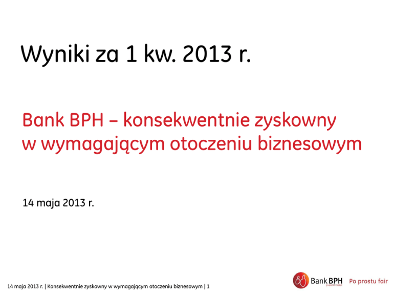 Wyniki za 1 kw. 2013 r. Bank BPH – konsekwentnie zyskowny w wymagającym otoczeniu biznesowym 14 maja 2013 r. 14 maja 2013 r. | Konsekwentnie zyskowny w wymagającym otoczeniu biznesowym | 1 Zastrzeżenie Niniejsza prezentacja nie jest częścią jakiejkolwiek oferty, zaproszenia, zachęty lub formy nakłaniania do sprzedaży lub składania zapisów na papiery wartościowe. Niniejsza prezentacja nie zawiera wszystkich informacji, które mogą być wymagane przez przyszłego inwestora. Niniejsza prezentacja, jej część, jak również okoliczności jej dystrybucji nie stanowią podstawy dla jakiejkolwiek umowy nabycia lub składania zapisów na papiery wartościowe. Prognozy oraz przewidywania zawarte w prezentacji opierają się na szeregu założeń i szacunków, uznanych przez nas za racjonalne, jednakże w sposób oczywisty podlegają wpływowi istotnych przyszłych i niepewnych zdarzeń biznesowych, operacyjnych, gospodarczych i konkurencyjnych, z których wiele pozostaje poza naszą kontrolą. Ponadto opierają się one na założeniach dotyczących przyszłych decyzji biznesowych, które mogą ulec zmianie. Rzeczywiste wyniki mogą znacząco odbiegać od zakładanych. Niektóre dane liczbowe i procentowe przedstawione w niniejszej prezentacji mogą się nie sumować z uwagi na dokonane zaokrąglenia. 14 maja 2013 r. | Konsekwentnie zyskowny w wymagającym otoczeniu biznesowym | 2 Agenda 1 Najważniejsze informacje 2 Wyniki finansowe 3 Podsumowanie 14 maja 2013 r. | Konsekwentnie zyskowny w wymagającym otoczeniu biznesowym | 3 Najważniejsze informacje 14 maja 2013 r. | Konsekwentnie zyskowny w wymagającym otoczeniu biznesowym | 4 Informacje ogólne Zyskowność Wyniki Koszty Odpisy Bezpieczeństwo • Zysk brutto w wysokości 58 mln zł a zysk netto na poziomie 42 mln zł … zgodnie z planami • Nowo udzielone kredyty detaliczne i komercyjne na poziomie 983 mln zł … wymagające otoczenie dla bankowości detalicznej, spadek nowej sprzedaży kredytów komercyjnych o 32%, obniżenie portfela o 6% • Pozytywny wpływ ubiegłorocznych działań kosztowych… spadek kosztów operacyjnych o 13,4% w porównaniu z ubiegłym rokiem lub o 10,8% po wyłączeniu zdarzeń jednorazowych • Odpisy na utratę wartości w wysokości 22 mln zł … 26% poprawa w porównaniu z ubiegłym rokiem, stabilny poziom kredytów z utratą wartości z porównaniu z ubiegłym rokiem • Współczynnik wypłacalności (CAR) na poziomie 14,9%, a Tier 1 na poziomie 12,5% … ryzyko płynności i rynkowe na bezpiecznym poziomie 14 maja 2013 r. | Konsekwentnie zyskowny w wymagającym otoczeniu biznesowym | 5 Kontynuacja strategii Fair Play Podstawowe wskaźniki marki Certyfikacja Fair Play w 1 kw. 13 Bank, który gra fair Bank, któremu ufam No. 1 No. 1 CELE #1 #1 #4 #5 1kw.12 1kw.13 1kw.12 1kw.13 Uczciwy bank Świadomość wspomagana Top 5 Top 5 CELE #7 #3 1kw.12 #5 #2 1kw.13 1kw.12 • Specjalna strona internetowa poświęcona Zasadom Fair Play • • Jasne zobowiązanie dotyczące Zasad Fair Play Niezależny audyt naszych postępów Przykłady zobowiązań: • Uczciwe produkty (wydłużony czas na odstąpienie lub rezygnację z wybranych produktów) • Przejrzysta i jasna dokumentacja (jednostronicowe podsumowanie) • Identyfikacja biometryczna zapewniająca bezpieczeństwo (Finger Vein we wszystkich oddziałach) • • Dialog i informacja zwrotna (Rady Klientów) 1kw.13 Źródło: badanie Brand Tracker (Ipsos), własne wywiady indywidualne, CAPI 14 maja 2013 r. | Konsekwentnie zyskowny w wymagającym otoczeniu biznesowym | 6 Powiadomienia SMS dla posiadaczy produktów oszczędnościowo-depozytowych Wymagające otoczenie biznesowe w 1 kw. Bankowość Detaliczna Wyzwanie: spadek popytu rynkowego i intensywna konkurencja…. Nasza odpowiedź: • Ulepszona oferta: Nowa sprzedaż kredytów detalicznych (w mln zł) • Obniżenie oprocentowania kredytów gotówkowych dla klientów posiadających rachunek bieżący -9% • Specjalna oferta kredytów gotówkowych i kart kredytowych dla segmentu klientów zamożnych • Uproszczona oferta kredytów hipotecznych (wzrost liczby wniosków o 123% a nowo udzielonych kredytów o 10% w porównaniu z ubiegłym rokiem 546 497 1kw.12 1kw.13 • Kredyty gotówkowe bez prowizji w Internecie oraz od 15 maja w oddziałach ... Gotówka Online (7% bieżącej nowej sprzedaży) • Wzrost liczby oddziałów (8 nowych placówek partnerskich) i zmodernizowanych placówek (6 oddziałów własnych) • Inwestycje w sprzedaż telefoniczną (35% nowych kredytów gotówkowych) Bankowość Komercyjna Wyzwanie: Wymagające otoczenie biznesowe dla przedsiębiorstw powodujące Nowa sprzedaż kredytów komercyjnych (w mln zł)) ograniczanie inwestycji i zwiększanie płynności firm. Nasza odpowiedź: • Nowe karty scoringowe do wniosków kredytowych dla mikroprzedsiębiorstw 711 -32% • Zwiększenie efektywności sprzedaży 486 • Nowe podejście do faktoringu 1kw.12 14 maja 2013 r. | Konsekwentnie zyskowny w wymagającym otoczeniu biznesowym | 7 1kw.13 Wyniki finansowe 14 maja 2013 r. | Konsekwentnie zyskowny w wymagającym otoczeniu biznesowym | 8 Wyniki finansowe 1 kw. 13 Zmiana/ kw. Zmiana/ rok Wynik odsetkowy 261 (12%) (18%) Wynik z tytułu opłat i prowizji 119 (10%) (15%) Wynik na działalności bankowej* 390 (12%) (17%) Odpisy na utratę ważności (22) (53%) K (26%) K Przychód netto po odpisach** 368 (7%) (16%) Koszty Z wyłączeniem restrukturyzacji i pozycji jednorazowych (305) 3% N (13%) K (300) (4%) K (11%) K Zysk brutto 58 (39%) (29%) Zysk netto 42 (42%) (31%) W mln zł K/ Korzystne; N/ Niekorzystne; */ wynik na działalności bankowej = wynik odsetkowy + wynik z tytułu opłat i prowizji + wynik handlowy **/ przychody netto po odpisach = wynik na działalności bankowej + odpisy na utratę wartości Zmniejszenie kosztów i odpisów rekompensuje mniejsze przychody 14 maja 2013 r. | Konsekwentnie zyskowny w wymagającym otoczeniu biznesowym | 9 Kluczowe wskaźniki b