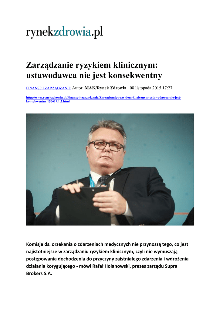 Zarządzanie ryzykiem klinicznym: ustawodawca nie jest konsekwentny FINANSE I ZARZĄDZANIE Autor: MAK/Rynek Zdrowia 08 listopada 2015 17:27 http://www.rynekzdrowia.pl/Finanse-i-zarzadzanie/Zarzadzanie-ryzykiem-klinicznym-ustawodawca-nie-jestkonsekwentny,156619,1,2.html Komisje ds. orzekania o zdarzeniach medycznych nie przynoszą tego, co jest najistotniejsze w zarządzaniu ryzykiem klinicznym, czyli nie wymuszają postępowania dochodzenia do przyczyny zaistniałego zdarzenia i wdrożenia działania korygującego - mówi Rafał Holanowski, prezes zarządu Supra Brokers S.A. Rynek Zdrowia: - Dyrektorzy szpitali chwalą przesunięcie o kolejny rok obowiązku posiadania przez szpitale ubezpieczenia od zdarzeń medycznych. Nie brakuje też opinii, że tego typu ubezpieczenie powinno być dobrowolne, gdyż szpitale i tak płacą wysokie składki OC. Czy zgadza się pan z takim poglądem? Rafał Holanowski: - Decyzja jest jak najbardziej zasadna. Filozofia podejścia do bezpieczeństwa w kontekście komisji wojewódzkich jest w dalszym ciągu niespójna. Ustawodawca powinien tak zmieniać przepisy, by podnosić jakość świadczonych usług oraz poprawiać bezpieczeństwo pacjentów. Natomiast w tym przypadku mówimy o tym, że zachęcamy pacjentów do zgłaszania skarg w urzędowej formie, często bardzo niezasadnej, a nawet jeśli zasadnej to bez orzekania o winie. Zatem sposób rozstrzygania i wyciągania wniosków z popełnionych błędnych decyzji w tym przypadku nie funkcjonuje i jest zaprzeczeniem podstawowych zasad zarządzania ryzykiem. Trzeba przypomnieć, że ustawodawca nie jest konsekwentny, ponieważ z jednej strony wprowadza - w treści ustawy o finansach publicznych, a także rozporządzeń Ministra Finansów - wytyczne i obowiązek wprowadzenia przez jednostki sektora finansów publicznych zarządzania ryzykiem. Z drugiej strony, wprowadza instytucję komisji wojewódzkich i demotywuje szpitale do aktywnego wdrażaniu procesu zarządzania ryzykiem. Proces ten bowiem polega na dokładnej identyfikacji przyczyn powstawania zdarzeń niepożądanych, miejsc i zależności - dlaczego dane zdarzenia powstają i jak je eliminować dzięki czemu organizacja może się samodoskonalić. W obecnie funkcjonującym prawodawstwie to Kodeks Cywilny i postępowanie cywilne reguluje kwestie prawa pacjenta do odszkodowania i zadośćuczynienia; to rozwiązanie uważamy za w pełni wystarczające. Oczywiście w tym aspekcie ustawodawca powinien reformować system sądownictwa, który jest niewydolny, a nie wprowadzać kosztochłonne komisje wojewódzkie oraz obarczać szpitale dodatkowymi kosztami ubezpieczeń, które w żaden sposób nie kończą się sukcesem. Przede wszystkim komisje nie przynoszą tego, co jest najistotniejsze w zarządzaniu ryzykiem, czyli nie wymuszają postępowania dochodzenia do przyczyny zaistniałego zdarzenia, wyeliminowania jego powtórzenia w przyszłości, wdrożenia działania korygującego, które poprawi bezpieczeństwo pacjenta i wyeliminuje osoby czy procedury, które doprowadziły do takiego, a nie innego zdarzenia. W związku z powyższym stoimy na stanowisku, że ubezpieczenia w stylu tzw. no fault, czyli bez winy, nie sprzyjają rozwojowi procesu zarządzania ryzykiem klinicznym, który dopiero kiełkuje w polskich szpitalach. - Jednak postępowania przed wojewódzkimi komisjami ds. orzekania o zdarzeniach medycznych są prowadzone. Dla stron -pacjentów i szpitali - bywają ćwiczebnym poligonem, na którym zbiera się doświadczenia (dokumentację i ekspertyzy) przed decydującą rozgrywką w sądzie. Czy zatem komisje, w pana opinii, spełniają rolę, do której zostały powołane? Miały m.in. odciążyć sądy. - W żadnej mierze nie odciążają sadów, dlatego że te nie mogą opierać się na dokumentacji czy orzeczeniach komisji wojewódzkich. Sądy mają swoją procedurę i opierają swoje decyzje na zebranym przez siebie materiale. Ten poligon ćwiczebny, o którym mówimy, jest zdublowany, ponieważ te same dokumenty będą jeszcze raz przedkładane w procesie cywilnym w trakcie dochodzenia odszkodowania przed sądem. Zatem działanie jest kosztochłonne, nieefektywne i jedynie upowszechnia populistyczną informację o dobru pacjenta. Patrząc na to z dalszej perspektywy w istocie działa to przeciwko pacjentom, gdyż nie zwiększa jego bezpieczeństw, nie stymuluje szpitali do podniesienia jakości świadczonych usług poprzez wprowadzenie zasad zarządzania ryzykiem. Dzieje się wręcz odwrotnie: system daje złudne poczucie bezpieczeństwa poprzez transfer ryzyka na ubezpieczyciela. Na szczęście tych ubezpieczycieli jeszcze nie ma. Myślę, że środki - zamiast na ubezpieczenie z tytułu zdarzeń medycznych - powinny być przeznaczone na wprowadzenie metod zarządzania ryzykiem klinicznym, reorganizację szpitali oraz poprawę jakości świadczeń. - Sądy orzekają coraz wyższe kwoty odszkodowań i zadośćuczynień, a to wymusza konieczność podnoszenia składek OC. Czy ubezpieczyciele powinni stosować preferencyjne stawki dla najbardziej bezpiecznych placówek medycznych, w których „szkodowość” jest niska? - Oczywiście, że tak. Wynika to z samej zasady underwritingu - nie ma jednej równej składki dla wszystkich, ponieważ te czasy mamy już za sobą, a każdy szpital, każda organizacja szpitalna, to inny sposób zarządzania, inna struktura, inne ryzyko. Analiza ryzyka musi być przeprowadzona indywidualnie i jest oczywistym, że szpitale, które dbają o bezpieczeństwo pacjentów i jakość świadczonych usług, korygują błędy w procesie zarządzania ryzykiem klinicznym, potrafią je diagnozować, rozpoznawać, nazywać, wreszcie eliminować, powinny być nagradzane i lepiej taryfikowane przez ubezpieczycieli. Natomiast szpitale, które bez względu na to, ile zdarzeń niepożądanych by nie było, nadal tego problemu nie dostrzegają, będą wypłacać odszkodowania i płacić więcej za ubezpieczenia. Zło wyp