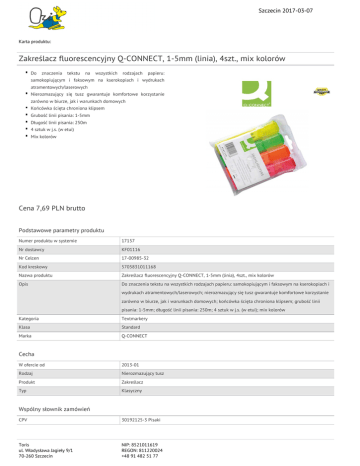 Szczecin 2017-03-07 Karta produktu: Zakreślacz fluorescencyjny Q-CONNECT, 1-5mm (linia), 4szt., mix kolorów Do znaczenia tekstu na wszystkich rodzajach papieru: samokopiującym i faksowym na kserokopiach i wydrukach atramentowych/laserowych Nierozmazujący się tusz gwarantuje komfortowe korzystanie zarówno w biurze, jak i warunkach domowych Końcówka ścięta chroniona klipsem Grubość linii pisania: 1-5mm Długość linii pisania: 250m 4 sztuk w j.s. (w etui) Mix kolorów Cena 7,69 PLN brutto Podstawowe parametry produktu Numer produktu w systemie 17157 Nr dostawcy KF01116 Nr Celcen 17-00985-32 Kod kreskowy 5705831011168 Nazwa produktu Zakreślacz fluorescencyjny Q-CONNECT, 1-5mm (linia), 4szt., mix kolorów Opis Do znaczenia tekstu na wszystkich rodzajach papieru: samokopiującym i faksowym na kserokopiach i wydrukach atramentowych/laserowych; nierozmazujący się tusz gwarantuje komfortowe korzystanie zarówno w biurze, jak i warunkach domowych; końcówka ścięta chroniona klipsem; grubość linii pisania: 1-5mm; długość linii pisania: 250m; 4 sztuk w j.s. (w etui); mix kolorów Kategoria Textmarkery Klasa Standard Marka Q-CONNECT Cecha W ofercie od 2013-01 Rodzaj Nierozmazujący tusz Produkt Zakreślacz Typ Klasyczny Wspólny słownik zamówień CPV 30192125-3 Pisaki Toris ul. Władysława Jagieły 9/1 70-260 Szczecin NIP: 8521011619 REGON: 811220024 +48 91 482 51 77 Szczecin 2017-03-07 Karta katalogowa produktu cd. Zakreślacz fluorescencyjny Q-CONNECT, 1-5mm (linia), 4szt., mix kolorów Certyfikaty Nowy produkt w ofercie Standard Hit Standard Wymiary Dł. linii (m) 250 Grubość linii (mm) 1-5 Kolor Kolor Mix kolorów Pozostałe zdjęcia produktu Serdecznie zapraszamy do współpracy Toris zespół. Toris ul. Władysława Jagieły 9/1 70-260 Szczecin NIP: 8521011619 REGON: 811220024 +48 91 482 51 77