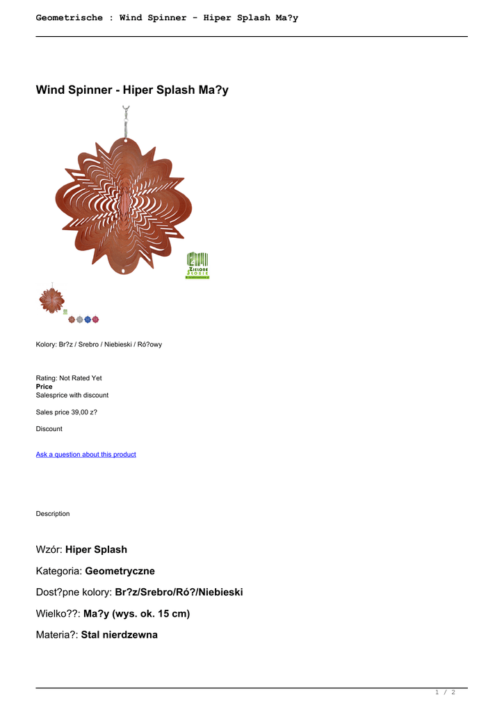Geometrische : Wind Spinner - Hiper Splash Ma?y Wind Spinner - Hiper Splash Ma?y Kolory: Br?z / Srebro / Niebieski / Ró?owy Rating: Not Rated Yet Price Salesprice with discount Sales price 39,00 z? Discount Ask a question about this product Description Wzór: Hiper Splash Kategoria: Geometryczne Dost?pne kolory: Br?z/Srebro/Ró?/Niebieski Wielko??: Ma?y (wys. ok. 15 cm) Materia?: Stal nierdzewna 1 / 2 Geometrische : Wind Spinner - Hiper Splash Ma?y Do ka?dego Wind Spinnera, jeden metalowy haczyk gratis! Wind Spinnery czyli ozdoby ze stali nierdzewnej, które poruszaj?c si? na wietrze lub przy pomocy silniczka, tworz? pi?kn? iluzj? trójwymiarowo?ci. Je?eli chcesz dowiedzie? si? wi?cej na ich temat, kliknij tutaj. Sprawd? jak wygl?daj? wybrane modele Wind Spinnerów w ruchu! Reviews There are yet no reviews for this product. 2 / 2 Powered by TCPDF (www.tcpdf.org)