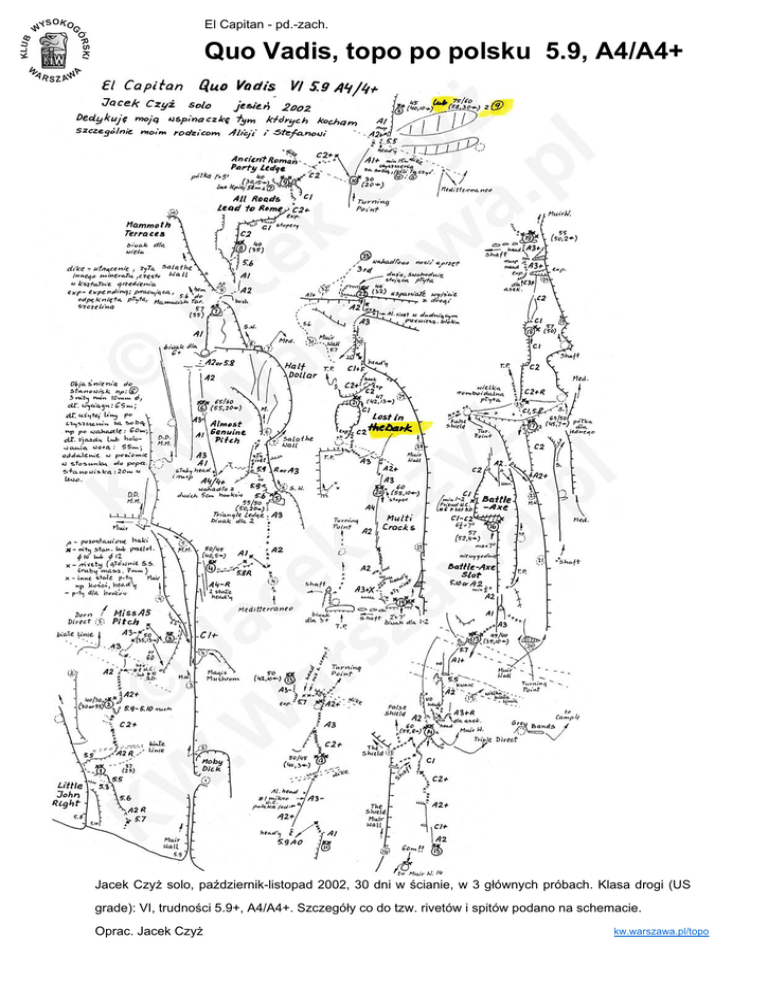 El Capitan - pd.-zach. Quo Vadis, topo po polsku 5.9, A4/A4+ Jacek Czyż solo, październik-listopad 2002, 30 dni w ścianie, w 3 głównych próbach. Klasa drogi (US grade): VI, trudności 5.9+, A4/A4+. Szczegóły co do tzw. rivetów i spitów podano na schemacie. Oprac. Jacek Czyż kw.warszawa.pl/topo