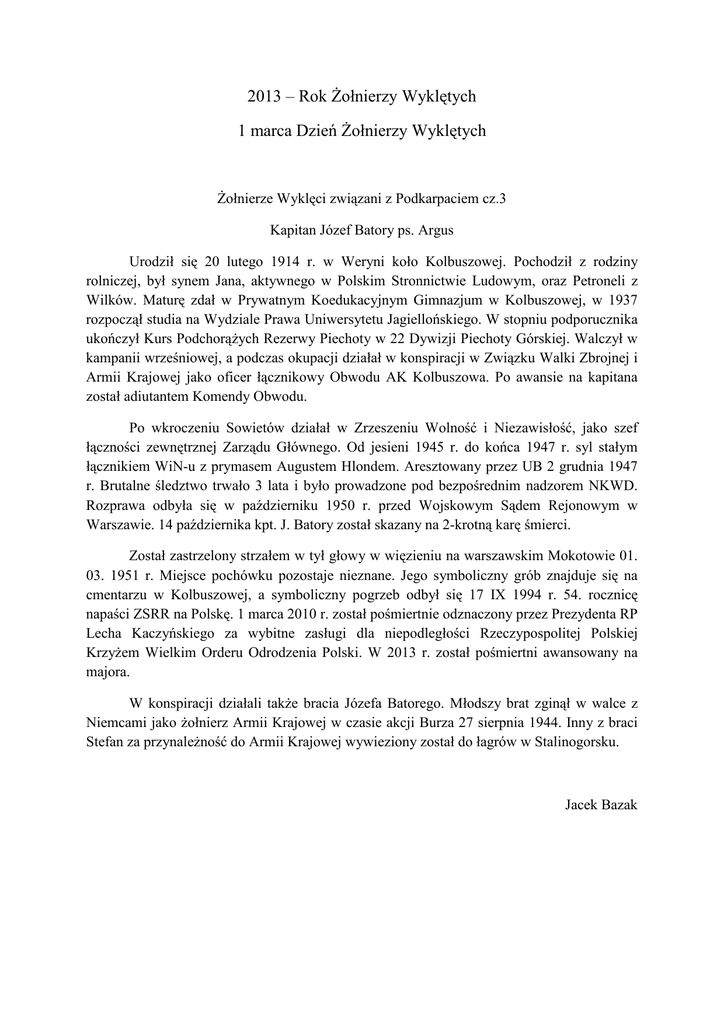 2013 – Rok Żołnierzy Wyklętych 1 marca Dzień Żołnierzy Wyklętych Żołnierze Wyklęci związani z Podkarpaciem cz.3 Kapitan Józef Batory ps. Argus Urodził się 20 lutego 1914 r. w Weryni koło Kolbuszowej. Pochodził z rodziny rolniczej, był synem Jana, aktywnego w Polskim Stronnictwie Ludowym, oraz Petroneli z Wilków. Maturę zdał w Prywatnym Koedukacyjnym Gimnazjum w Kolbuszowej, w 1937 rozpoczął studia na Wydziale Prawa Uniwersytetu Jagiellońskiego. W stopniu podporucznika ukończył Kurs Podchorążych Rezerwy Piechoty w 22 Dywizji Piechoty Górskiej. Walczył w kampanii wrześniowej, a podczas okupacji działał w konspiracji w Związku Walki Zbrojnej i Armii Krajowej jako oficer łącznikowy Obwodu AK Kolbuszowa. Po awansie na kapitana został adiutantem Komendy Obwodu. Po wkroczeniu Sowietów działał w Zrzeszeniu Wolność i Niezawisłość, jako szef łączności zewnętrznej Zarządu Głównego. Od jesieni 1945 r. do końca 1947 r. syl stałym łącznikiem WiN-u z prymasem Augustem Hlondem. Aresztowany przez UB 2 grudnia 1947 r. Brutalne śledztwo trwało 3 lata i było prowadzone pod bezpośrednim nadzorem NKWD. Rozprawa odbyła się w październiku 1950 r. przed Wojskowym Sądem Rejonowym w Warszawie. 14 października kpt. J. Batory został skazany na 2-krotną karę śmierci. Został zastrzelony strzałem w tył głowy w więzieniu na warszawskim Mokotowie 01. 03. 1951 r. Miejsce pochówku pozostaje nieznane. Jego symboliczny grób znajduje się na cmentarzu w Kolbuszowej, a symboliczny pogrzeb odbył się 17 IX 1994 r. 54. rocznicę napaści ZSRR na Polskę. 1 marca 2010 r. został pośmiertnie odznaczony przez Prezydenta RP Lecha Kaczyńskiego za wybitne zasługi dla niepodległości Rzeczypospolitej Polskiej Krzyżem Wielkim Orderu Odrodzenia Polski. W 2013 r. został pośmiertni awansowany na majora. W konspiracji działali także bracia Józefa Batorego. Młodszy brat zginął w walce z Niemcami jako żołnierz Armii Krajowej w czasie akcji Burza 27 sierpnia 1944. Inny z braci Stefan za przynależność do Armii Krajowej wywieziony został do łagrów w Stalinogorsku. Jacek Bazak