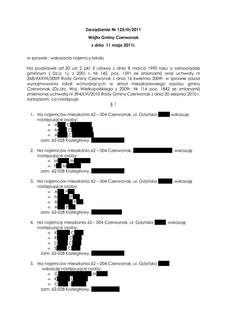Zarządzenie Nr 125/III/2011 Wójta Gminy Czerwonak z dnia 11 maja 2011r. w sprawie : wskazania najemcy lokalu Na podstawie art.30 ust 2 pkt 3 ustawy z dnia 8 marca 1990 roku o samorządzie gminnym ( Dz.U. t.j. z 2001 r. Nr 142, poz. 1591 ze zmianami) oraz uchwały nr 268/XXXVII/2009 Rady Gminy Czerwonak z dnia 16 kwietnia 2009r. w sprawie zasad wynajmowania lokali wchodzących w skład mieszkaniowego zasobu gminy Czerwonak (Dz.Urz. Woj. Wielkopolskiego z 2009r. Nr 114 poz. 1842 ze zmianami) zmienionej uchwałą nr 394/LVI/2010 Rady Gminy Czerwonak z dnia 20 sierpnia 2010 r. zarządzam, co następuje: §1 1. Na najemców mieszkania 62 – 004 Czerwonak, ul. Gdyńska 84b/7 wskazuję następujące osoby: • Anna Chełkowska, • Marta Chełkowska, • Agata Chełkowska, zam. 62-028 Koziegłowy, os. Leśne 16/110 2. Na najemców mieszkania 62 – 004 Czerwonak, ul. Gdyńska 84b/11 wskazuję następujące osoby • Monika Michalska • Filip Michalski zam. 62-028 Koziegłowy, os. Leśne 13B/39 3. Na najemców mieszkania 62 – 004 Czerwonak, ul. Gdyńska 124/7a wskazuję następujące osoby: • Artur Pera • Natalia Pera • Amanda Pera • Aleks Pera zam. 62-028 Koziegłowy, os. Leśne 13/40 4. Na najemcę mieszkania 62 – 004 Czerwonak, ul. Gdyńska 124/7 wskazuję następujące osoby: • Klaudia Cieślik • Robert Cieślik • Dawid Cieślik • Sylwia Cieślik zam. 62-028 Koziegłowy, os. Leśne 12B/13 5. Na najemców mieszkania 62 – 004 Czerwonak, ul. Gdyńska 124/2 wskazuję następujące osoby: • Gerwazik-Lembicz Monika • Klaudia Lembicz • Oliwier Lembicz zam. 62-028 Koziegłowy, os. Leśne 9/74 6. Na najemców mieszkania 62 – 004 Czerwonak, ul. Gdyńska 126/4 wskazuję następujące osoby: • Małgorzata Rogowska • Ryszard Rogowski • Tomasz Rogowski • Katarzyna Rogowska • Krzysztof Rogowski zam. 62-004 Czerwonak, os. 40-Lecia PRL 4/19 7. Na najemców mieszkania 62 – 005 Owińska, ul. Bydgoska 8/1 wskazuję następujące osoby: • Roman Grajewski • Anna Grajewska • Karolina Grajewska zam. 62-028 Koziegłowy, ul. Piłsudskiego 7/18 8. Na najemców mieszkania 62 – 028 Koziegłowy, ul. Gdyńska 17/4 wskazuję następujące osoby: • Jerzy Pecold • Marlena Pecold • Maciej Pecold • Michał Pecold Zam. 62-028 Koziegłowy, ul. Poznańska 14/43 9. Na najemców mieszkania 62- 005 Owińska ul. Poznańska 4/5 wskazuję następujące osoby • Robert Fabisz • Wiesława Fabisz • Mirella Fabisz • Adrian Fabisz • Daria Fabisz zam. 62-028 Koziegłowy, ul. Podgórna 18 10. Na najemcę mieszkania 62-004 Czerwonak, ul. Gdyńska 84b/19 wskazuję: Panią Joannę Oleszyńską, zamieszkałą w Owińskach, ul. Bydgoska 19/2. 11. Na najemcę mieszkania 62 – 004 Czerwonak, Plac Zielony 3/10 wskazuję: Panią Marzenę Grawendę, zamieszkałą w Kicinie, przy ul. Poznańskiej 61/6 12. Na najemcę mieszkania 62-005 Bolechowo Osiedle, ul. Obornicka 18a/9 wskazuję: Panią Alicję Taderę, zamieszkałą w Czerwonaku, ul. Gdyńska 99/5. 13. Na najemcę mieszkania 62-005 Bolechowo Osiedle, ul. Obornicka 18a/13 wskazuję: Pana Sławomira Kaczora, zamieszkałego w Czerwonaku, ul. Słoneczna 5/30. §2 Wykonanie Zarządzenia powierzam Kierownikowi Wydziału Gospodarki Komunalnej i Ochrony Środowiska §3 Traci moc Zarządzenie nr 27/III/2011r Wójta Gminy z dnia 5.01.2011r. w sprawie wskazania najemcy lokalu w zakresie: 1. pkt. 7 „Na najemcę mieszkania 62 – 005 Bolechowo, ul. Obornicka 18b/7 wskazuję: Panią Krystynę Mosielską, zamieszkałą w Czerwonaku, przy ul. Gdyńskiej 84b/7.” 2. pkt. 17. „Na najemcę mieszkania 62 – 005 Bolechowo, ul. Obornicka 18b/17 wskazuję: Panią Violettę Matecką, zamieszkałą w Czerwonaku, przy ul. Gdyńskiej 84/2.” 3. pkt. 21. „Na najemcę mieszkania 62 – 005 Bolechowo, ul. Obornicka 18b/23 wskazuję: Panią Marzenę Grawendę, zamieszkałą w Kicinie, przy ul. Poznańskiej 61/6”. §4 W zarządzeniu nr 76/III/2011r Wójta Gminy z dnia 17.03.2011r. w sprawie wskazania najemcy lokalu zmianie ulega punkt 4, punkt 7 oraz punkt 11, które przyjmują brzmienie: 1. pkt. 4 „Na najemców mieszkania 62 – 005 Bolechowo, ul. Obornicka 18a/2 wskazuję następujące osoby: • Kazimierz Dymek • BoŜena Dymek • Marcin Dymek zam. 62-028 Koziegłowy, os. Leśne 14/85.” 2. pkt. 7 „Na najemców mieszkania 62 – 005 Bolechowo, ul. Obornicka 18a/8 wskazuję następujące osoby: • Danuta Michalska • Roman Michalski • Lucyna Michalska • Jakub Michalski zam. 62-028 Koziegłowy, ul. Piłsudskiego 7/4.” 3. pkt. 11 „Na najemcę mieszkania 62 – 005 Owińska, ul. Poznańska 4/5 wskazuję: Pana Tomasza Brzezinskiego, zamieszkałego w Potaszach, przy ul. Sosnowej 16.” §5 Zarządzenie wchodzi w Ŝycie z dniem podpisania.