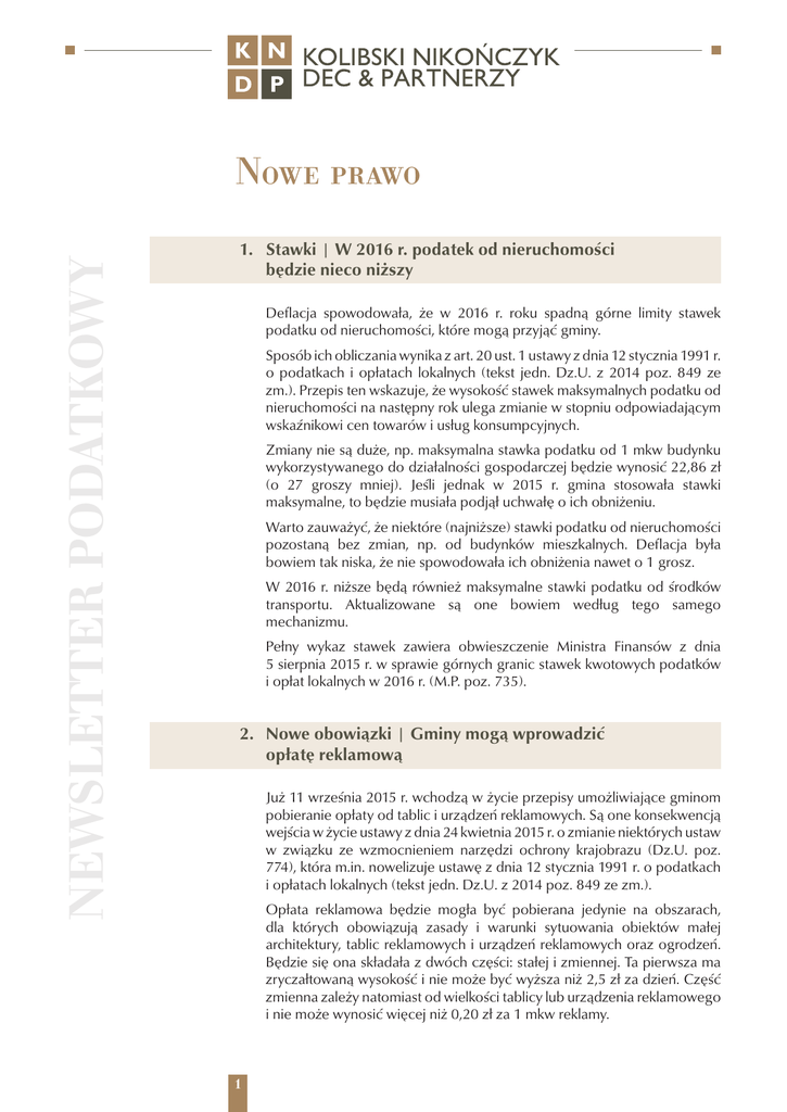 NEWSLETTER PODATKOWY Nowe prawo 1. Stawki|W2016r.podatekodnieruchomości będzienieconiższy Deflacja spowodowała, że w 2016 r. roku spadną górne limity stawek podatku od nieruchomości, które mogą przyjąć gminy. Sposób ich obliczania wynika z art. 20 ust. 1 ustawy z dnia 12 stycznia 1991 r. o podatkach i opłatach lokalnych (tekst jedn. Dz.U. z 2014 poz. 849 ze zm.). Przepis ten wskazuje, że wysokość stawek maksymalnych podatku od nieruchomości na następny rok ulega zmianie w stopniu odpowiadającym wskaźnikowi cen towarów i usług konsumpcyjnych. Zmiany nie są duże, np. maksymalna stawka podatku od 1 mkw budynku wykorzystywanego do działalności gospodarczej będzie wynosić 22,86 zł (o 27 groszy mniej). Jeśli jednak w 2015 r. gmina stosowała stawki maksymalne, to będzie musiała podjął uchwałę o ich obniżeniu. Warto zauważyć, że niektóre (najniższe) stawki podatku od nieruchomości pozostaną bez zmian, np. od budynków mieszkalnych. Deflacja była bowiem tak niska, że nie spowodowała ich obniżenia nawet o 1 grosz. W 2016 r. niższe będą również maksymalne stawki podatku od środków transportu. Aktualizowane są one bowiem według tego samego mechanizmu. Pełny wykaz stawek zawiera obwieszczenie Ministra Finansów z dnia 5 sierpnia 2015 r. w sprawie górnych granic stawek kwotowych podatków i opłat lokalnych w 2016 r. (M.P. poz. 735). 2. Noweobowiązki|Gminymogąwprowadzić opłatęreklamową Już 11 września 2015 r. wchodzą w życie przepisy umożliwiające gminom pobieranie opłaty od tablic i urządzeń reklamowych. Są one konsekwencją wejścia w życie ustawy z dnia 24 kwietnia 2015 r. o zmianie niektórych ustaw w związku ze wzmocnieniem narzędzi ochrony krajobrazu (Dz.U. poz. 774), która m.in. nowelizuje ustawę z dnia 12 stycznia 1991 r. o podatkach i opłatach lokalnych (tekst jedn. Dz.U. z 2014 poz. 849 ze zm.). Opłata reklamowa będzie mogła być pobierana jedynie na obszarach, dla których obowiązują zasady i warunki sytuowania obiektów małej architektury, tablic reklamowych i urządzeń reklamowych oraz ogrodzeń. Będzie się ona składała z dwóch części: stałej i zmiennej. Ta pierwsza ma zryczałtowaną wysokość i nie może być wyższa niż 2,5 zł za dzień. Część zmienna zależy natomiast od wielkości tablicy lub urządzenia reklamowego i nie może wynosić więcej niż 0,20 zł za 1 mkw reklamy. 1 Rada gminy może różnicować wysokość stawek opłaty reklamowej uwzględniając lokalizację oraz wielkość lub rodzaj tablicy reklamowej lub urządzenia reklamowego. Co istotne, kwotę zapłaconego podatku od nieruchomości od tablicy reklamowej lub urządzenia reklamowego, zalicza się na poczet opłaty reklamowej należnej od tej tablicy reklamowej lub urządzenia reklamowego. Opłata nie będzie pobierana od wszystkich tablic, np. nie trzeba będzie jej płacić od szyldów (zgodnych z zasadami i warunkami sytuowania obiektów małej architektury, tablic reklamowych i urządzeń reklamowych oraz ogrodzeń). 3. Ordynacja podatkowa | Wątpliwości będą rozstrzygane na korzyść podatników Od 2016 r. do ordynacji podatkowej zostanie wprost wpisana zasada, że niedające się usunąć wątpliwości co do treści przepisów prawa podatkowego rozstrzyga się na korzyść podatnika. Jest to konsekwencja przyjęcia przez Parlament ustawy z dnia 5 sierpnia 2015 r. o zmianie ustawy - Ordynacja podatkowa oraz niektórych innych ustaw (Dz.U. poz. 1197). To bardzo dobra wiadomość dla podatników. Co prawda już dziś można wywnioskować istnienie klauzuli in dubio pro tributario z Konstytucji, ale wydaje się, że dotychczas w sporach między podatnikami a organami podatkowymi nie odgrywała ona należnej roli. Zapisanie tej zasady w ordynacji podatkowej powinno to zmienić. Podatnicy z pewnością w wielu przypadkach będą się na nią powoływać. Spowoduje to, że znacznie częściej niż dotychczas będzie ona przedmiotem uzasadnień decyzji i wyroków. W ten sposób praktyczne znaczenie zasady rozstrzygania wątpliwości na korzyść podatników powinno wzrastać. Podatnicy muszą jednak pamiętać, że po klauzulę należy sięgnąć dopiero, gdy wątpliwości pozostaną po zastosowaniu wszelkich dopuszczalnych metod wykładni, a nie w każdym przypadku, gdy sposób sformułowania przepisu budzi wątpliwości. Oznacza to, że w praktyce może ona znaleźć zastosowanie w znacznie mniejszej liczbie przypadków, niż liczą na to przedsiębiorcy. 2 Interpretacje i wyroki 1. VAT | Trybunał oceni zwolnienie usług świadczonych przez niezależne grupy osób Tak zdecydował Naczelny Sąd Administracyjny w postanowieniu z dnia 26 sierpnia 2015 r. (I FSK 906/14). Z art. 43 ust. 1 pkt 21 ustawy o VAT wynika, że zwalnia się od podatku usługi świadczone przez niezależne grupy osób, na rzecz swoich członków, których działalność jest zwolniona od podatku lub w zakresie której członkowie ci nie są uznawani za podatników, w celu świadczenia swoim członkom usług bezpośrednio niezbędnych do wykonywania tej działalności zwolnionej lub wyłączonej od podatku. Zwolnienie znajduje zastosowanie, gdy grupy te ograniczają się do żądania od swoich członków zwrotu kosztów do wysokości kwoty indywidualnego udziału przypadającego na każdego z nich w ogólnych wydatkach tych grup, poniesionych we wspólnym interesie. Jest też inny warunek: zwolnienie nie może powodować naruszenia warunków konkurencji. Zasady wykładni powyższego przepisu oraz jego zgodność dyrektywą VAT od dawna budzą wątpliwości. W związku z tym jeden ze składów NSA skierował do Trybunału Sprawiedliwości Unii Europejskiej trzy pytania dotyczące tej regulacji. Zapytał m.in. czy art. 43 ust. 1 pkt 21 ustawy o VAT nie powinien zawierać przesłanek lub procedur stanowiących o spełnieniu warunku zakłócenia konkurencji. 2. VAT | Będzie kolejna uchwała w sprawie rozliczeń gmin Naczelny Sąd Administracyj