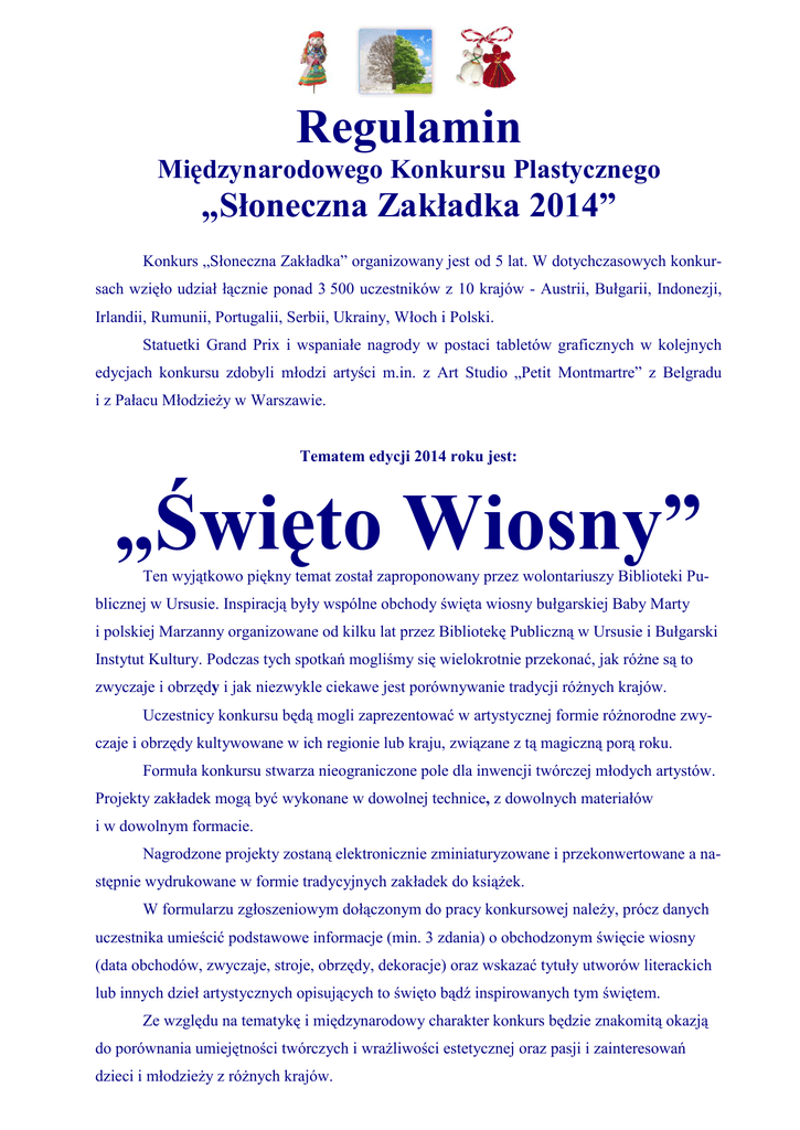 Regulamin Międzynarodowego Konkursu Plastycznego „Słoneczna Zakładka 2014” Konkurs „Słoneczna Zakładka” organizowany jest od 5 lat. W dotychczasowych konkursach wzięło udział łącznie ponad 3 500 uczestników z 10 krajów - Austrii, Bułgarii, Indonezji, Irlandii, Rumunii, Portugalii, Serbii, Ukrainy, Włoch i Polski. Statuetki Grand Prix i wspaniałe nagrody w postaci tabletów graficznych w kolejnych edycjach konkursu zdobyli młodzi artyści m.in. z Art Studio „Petit Montmartre” z Belgradu i z Pałacu Młodzieży w Warszawie. Tematem edycji 2014 roku jest: „Święto Wiosny” Ten wyjątkowo piękny temat został zaproponowany przez wolontariuszy Biblioteki Publicznej w Ursusie. Inspiracją były wspólne obchody święta wiosny bułgarskiej Baby Marty i polskiej Marzanny organizowane od kilku lat przez Bibliotekę Publiczną w Ursusie i Bułgarski Instytut Kultury. Podczas tych spotkań mogliśmy się wielokrotnie przekonać, jak różne są to zwyczaje i obrzędy i jak niezwykle ciekawe jest porównywanie tradycji różnych krajów. Uczestnicy konkursu będą mogli zaprezentować w artystycznej formie różnorodne zwyczaje i obrzędy kultywowane w ich regionie lub kraju, związane z tą magiczną porą roku. Formuła konkursu stwarza nieograniczone pole dla inwencji twórczej młodych artystów. Projekty zakładek mogą być wykonane w dowolnej technice, z dowolnych materiałów i w dowolnym formacie. Nagrodzone projekty zostaną elektronicznie zminiaturyzowane i przekonwertowane a następnie wydrukowane w formie tradycyjnych zakładek do książek. W formularzu zgłoszeniowym dołączonym do pracy konkursowej należy, prócz danych uczestnika umieścić podstawowe informacje (min. 3 zdania) o obchodzonym święcie wiosny (data obchodów, zwyczaje, stroje, obrzędy, dekoracje) oraz wskazać tytuły utworów literackich lub innych dzieł artystycznych opisujących to święto bądź inspirowanych tym świętem. Ze względu na tematykę i międzynarodowy charakter konkurs będzie znakomitą okazją do porównania umiejętności twórczych i wrażliwości estetycznej oraz pasji i zainteresowań dzieci i młodzieży z różnych krajów. §1 CELE KONKURSU 1. Rozwijanie aktywności twórczej dzieci i młodzieży. 2. Kształtowanie wrażliwości estetycznej poprzez popularyzację różnych form plastycznych. 3. Pogłębianie wiedzy o kulturze innych krajów i regionów i porównanie ich z lokalnymi zwyczajami 4. Poznawanie tradycji utrwalonej poprzez słowo mówione, literaturę, muzykę, teatr, film. 5. Popularyzacja książek i ilustracji jako inspiracji artystycznej dla dzieci młodzieży. §2 ZAŁOŻENIA ORGANIZACYJNE 1. Organizatorami konkursu są: Urząd Dzielnicy Ursus m.st. Warszawy, Bułgarski Instytut Kultury w Warszawie oraz Biblioteka Publiczna w Dzielnicy Ursus m.st. Warszawy. 2. Konkurs przeznaczony jest dla dzieci i młodzieży od 5 do 24 lat z instytucji oświatowych o profilu ogólnym jak i szkół i ośrodków artystycznych. Przyjmowane są również zgłoszenia indywidualne. 3. Każdy uczestnik może zgłosić do konkursu jedną, samodzielnie wykonaną pracę wcześniej niepublikowaną i niezgłaszaną do innych konkursów. 4. Projekty zakładek mogą być wykonane z różnych materiałów, w dowolnej technice (np.: ołówek, kredka, pastele, farby plakatowe, wycinanki, wyklejanki, decoupage, masa solna, origami) oraz w dowolnym formacie jednak nie przekraczającym wymiarów 1m x 2m x 1,5m (dł, szer. gł.), 5. Do projektu zakładki powinien być dołączony formularz zgłoszeniowy, starannie wypełniony na komputerze lub odręcznie literami drukowanymi. Formularze dostępne są w placówkach Biblioteki Publicznej w Ursusie lub na stronach internetowych www.bpursus.waw.pl 6. Nagrodzone projekty laureatów zostaną elektronicznie przekonwertowane na tradycyjne zakładki do książek i wydrukowane. 7. Zgłoszenie uczestnika do konkursu przez instytucję oznacza uzyskanie przez tę instytucję zgody rodziców lub opiekunów na udział uczestnika w konkursie. 8. Udział w konkursie oznacza udzielenie organizatorom konkursu prawa do: druku w dowolnej liczbie publikacji i w dowolnym nakładzie, umieszczenia prac w Internecie, a także prezentowania prac na wystawach krajowych i zagranicznych oraz w celach reklamowych (w prasie, w telewizji, w katalogach i na plakatach). 9. Osoby dostarczające prace konkursowe wyrażają zgodę na przetwarzanie przez organizatora konkursu swoich danych osobowych. 10. Prace zgłoszone do konkursu nie będą zwracane autorom. 11. Nadesłanie pracy na konkurs jest jednoznaczne ze złożeniem deklaracji o akceptacji regulaminu konkursu „Słoneczna Zakładka 2014”. §3 ZASADY KONKURSU 1. Konkurs zostanie przeprowadzony w następujących kategoriach: Kategoria narodowa - projekty uczestników z instytucji oświatowych o profilu ogólnym jak i szkół i ośrodków artystycznych danego kraju - grupa wiekowa 5-6 lat - grupa wiekowa 7-8 lat - grupa wiekowa 9-10 lat - grupa wiekowa 11-13 lat - grupa wiekowa 14-16 lat - grupa wiekowa 17-19 lat - grupa wiekowa 19-24 lata 2 Kategoria generalna - wybór najlepszych prac spośród projektów nagrodzonych w kategorii narodowej w danej grupie wiekowej - grupa wiekowa 5-6 lat - grupa wiekowa 7-8 lat - grupa wiekowa 9-10 lat - grupa wiekowa 11-13 lat - grupa wiekowa 14-16 lat - grupa wiekowa 17-19 lat - grupa wiekowa 19-24 lata 2. Jury może wprowadzić zmiany w kategoriach wiekowych w zależności od ilości zgłoszonych prac. 3. Prace konkursowe mogą być zgłaszane indywidualnie jak i przez szkoły i ośrodki artystyczne. 4. Projekty wraz z wypełnionym formularzem należy wysyłać na adres: Biblioteka Publiczna w Ursusie, ul. Plutonu Torpedy 47, 02-495 Warszawa, z dopiskiem na kopercie - konkurs „Słoneczna Zakładka 2014”. 5. Projekty zakładek wraz z wypełnionym formularzem można również składać w Czytelni Naukowej Nr XIX Biblioteki Publicznej w Ursusie przy ul. Plutonu