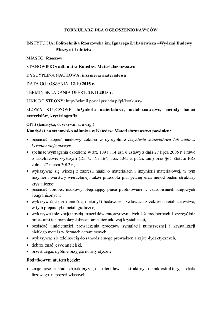 FORMULARZ DLA OGŁOSZENIODAWCÓW INSTYTUCJA: Politechnika Rzeszowska im. Ignacego Łukasiewicza –Wydział Budowy Maszyn i Lotnictwa MIASTO: Rzeszów STANOWISKO: adiunkt w Katedrze Materiałoznawstwa DYSCYPLINA NAUKOWA: inżynieria materiałowa DATA OGŁOSZENIA: 12.10.2015 r. TERMIN SKŁADANIA OFERT: 20.11.2015 r. LINK DO STRONY: http://wbmil.portal.prz.edu.pl/pl/konkursy/ SŁOWA KLUCZOWE: inżynieria materiałowa, metaloznawstwo, metody badań materiałów, krystalografia OPIS (tematyka, oczekiwania, uwagi): Kandydat na stanowisko adiunkta w Katedrze Materiałoznawstwa powinien: posiadać stopień naukowy doktora w dyscyplinie inżynieria materiałowa lub budowa i eksploatacja maszyn spełniać wymagania określone w art. 109 i 114 ust. 6 ustawy z dnia 27 lipca 2005 r. Prawo o szkolnictwie wyższym (Dz. U. Nr 164, poz. 1365 z późn. zm.) oraz §65 Statutu PRz z dnia 27 marca 2012 r., wykazywać się wiedzą z zakresu nauki o materiałach i inżynierii materiałowej, w tym inżynierii warstwy wierzchniej, także przeróbki plastycznej oraz metod badań struktury krystalicznej, posiadać dorobek naukowy obejmujący prace publikowane w czasopismach krajowych i zagranicznych, wykazywać się znajomością metodyki badawczej, zwłaszcza z zakresu metaloznawstwa, w tym preparatyki metalograficznej, wykazywać się znajomością materiałów żarowytrzymałych i żaroodpornych i szczególnie procesami ich monokrystalizacji oraz kierunkowej krystalizacji, posiadać umiejętności prowadzenia procesów symulacji numerycznej i krystalizacji ciekłego metalu w formach ceramicznych, wykazywać się zdolnością do samodzielnego prowadzenia zajęć dydaktycznych, dobrze znać język angielski, przestrzegać ogólnie przyjęte normy etyczne. Dodatkowym atutem będzie: znajomość metod charakteryzacji materiałów – struktury i mikrostruktury, składu fazowego, naprężeń własnych, czynny udział w badaniach naukowych dotyczących charakteryzacji i właściwości materiałów żaroodpornych i żarowytrzymałych oraz struktury i mikrostruktury materiałów krystalicznych, współpraca z przemysłem i instytucjami naukowymi. Wymagane dokumenty: podanie do JM Rektora Politechniki Rzeszowskiej, CV, kwestionariusz osobowy, odpis (kopia) potwierdzenia uzyskania stopnia doktora, informacje o osiągnięciach naukowych, lista publikacji, oświadczenie kandydata, że Politechnika Rzeszowska będzie podstawowym miejscem pracy w przypadku wygrania konkursu, oświadczenie o wyrażeniu zgody na przetwarzanie danych osobowych zawartych w ofercie pracy dla potrzeb niezbędnych do realizacji procesu rekrutacji zgodnie z ustawą z dnia 29.08.1997 r. o ochronie danych osobowych (tj.: Dz. U. z 2002 r. Nr 101, poz. 926 ze zm.). Dokumenty należy złożyć do dnia 20.11.2015 roku, w Dziekanacie Wydziału Budowy Maszyn i Lotnictwa Politechniki Rzeszowskiej, al. Powstańców Warszawy 8, 35-959 Rzeszów. Politechnika Rzeszowska zastrzega sobie prawo do zamknięcia konkursu bez wyłaniania kandydatów. Niepoinformowanie kandydata o wynikach konkursu jest równoznaczne z odrzuceniem jego oferty.