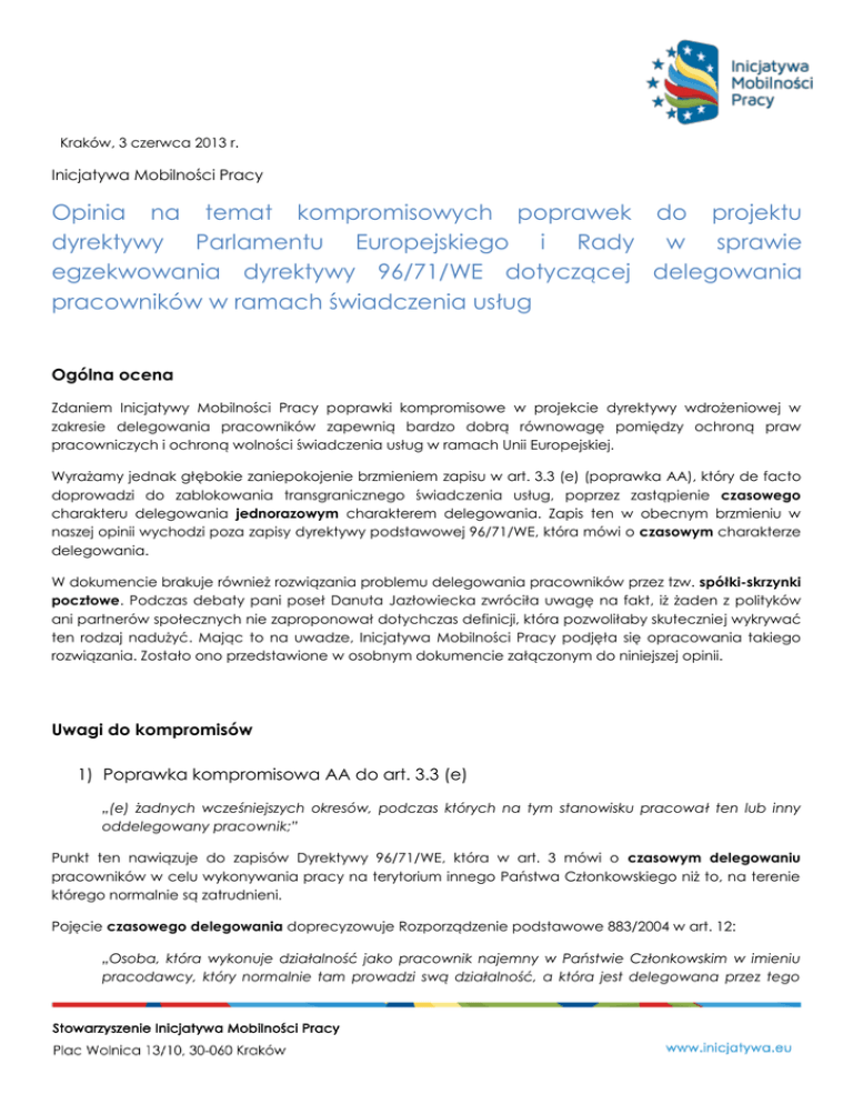 Kraków, 3 czerwca 2013 r. Inicjatywa Mobilności Pracy Opinia na temat kompromisowych poprawek do projektu dyrektywy Parlamentu Europejskiego i Rady w sprawie egzekwowania dyrektywy 96/71/WE dotyczącej delegowania pracowników w ramach świadczenia usług Ogólna ocena Zdaniem Inicjatywy Mobilności Pracy poprawki kompromisowe w projekcie dyrektywy wdrożeniowej w zakresie delegowania pracowników zapewnią bardzo dobrą równowagę pomiędzy ochroną praw pracowniczych i ochroną wolności świadczenia usług w ramach Unii Europejskiej. Wyrażamy jednak głębokie zaniepokojenie brzmieniem zapisu w art. 3.3 (e) (poprawka AA), który de facto doprowadzi do zablokowania transgranicznego świadczenia usług, poprzez zastąpienie czasowego charakteru delegowania jednorazowym charakterem delegowania. Zapis ten w obecnym brzmieniu w naszej opinii wychodzi poza zapisy dyrektywy podstawowej 96/71/WE, która mówi o czasowym charakterze delegowania. W dokumencie brakuje również rozwiązania problemu delegowania pracowników przez tzw. spółki-skrzynki pocztowe. Podczas debaty pani poseł Danuta Jazłowiecka zwróciła uwagę na fakt, iż żaden z polityków ani partnerów społecznych nie zaproponował dotychczas definicji, która pozwoliłaby skuteczniej wykrywać ten rodzaj nadużyć. Mając to na uwadze, Inicjatywa Mobilności Pracy podjęła się opracowania takiego rozwiązania. Zostało ono przedstawione w osobnym dokumencie załączonym do niniejszej opinii. Uwagi do kompromisów 1) Poprawka kompromisowa AA do art. 3.3 (e) „(e) żadnych wcześniejszych okresów, podczas których na tym stanowisku pracował ten lub inny oddelegowany pracownik;” Punkt ten nawiązuje do zapisów Dyrektywy 96/71/WE, która w art. 3 mówi o czasowym delegowaniu pracowników w celu wykonywania pracy na terytorium innego Państwa Członkowskiego niż to, na terenie którego normalnie są zatrudnieni. Pojęcie czasowego delegowania doprecyzowuje Rozporządzenie podstawowe 883/2004 w art. 12: „Osoba, która wykonuje działalność jako pracownik najemny w Państwie Członkowskim w imieniu pracodawcy, który normalnie tam prowadzi swą działalność, a która jest delegowana przez tego pracodawcę do innego Państwa Członkowskiego do wykonywania pracy w imieniu tego pracodawcy, nadal podlega ustawodawstwu pierwszego Państwa Członkowskiego, pod warunkiem że przewidywany czas takiej pracy nie przekracza 24 miesięcy i że osoba ta nie jest wysłana, by zastąpić inną delegowaną osobę.” W rozporządzeniu wykonawczym 987/2009, pojęcie „zastąpić inną delegowaną osobę” nie zostało dodatkowo doprecyzowane, gdyż nie budziło dotąd problemów interpretacyjnych. Służy ono bowiem wzmocnieniu czasowego charakteru delegowania i wyeliminowaniu obejścia przepisów polegających na permanentnym obsadzaniu określonych stanowisk pracownikami delegowanymi, co byłoby sprzeczne pojęciem czasowego wykonywania prac w ramach umowy zawartej między przedsiębiorstwem delegującym i odbiorcą usług w państwie przyjmującym. Celem ustawodawcy było zapobieganie niekończącej się rotacji kolejnych pracowników delegowanych na te same miejsca pracy i do tych samych celów, a tym samym zapobieganie przekształcaniu czasowego charakteru delegowania w permanentny. Tymczasem zapis proponowany w poprawce kompromisowej AA wprowadza radykalną i niestosowaną dotychczas interpretację pojęcia czasowego delegowania, przekształcając je de facto w jednorazowe delegowanie. Wyrzuca tym samym poza ramy delegowania większość usług, w szczególności tych o charakterze sezonowym, cyklicznym oraz takich, których charakter wymaga pracy wahadłowej. Przykłady praktyczne a) usługi o charakterze sezonowym Każdego roku właściciele winnic w Austrii, Francji, Niemczech, Włoszech, Portugalii, Hiszpanii i innych krajach zatrudniają pracowników fizycznych na okres intensywnego zbioru winogron. Gdy lokalna siła robocza okazuje się być niewystarczająca, szukają podwykonawców lub wynajmują pracowników z agencji zatrudnienia, w tym z innych Państw Członkowskich. Czasowy wynajem pracowników fizycznych na stanowisko „zbieracz winogron” na 3-6 tygodni każdego kolejnego roku jest całkowicie dozwolonym – by nie napisać – typowym przykładem czasowego delegowania zgodnego z Dyrektywą 96/71/WE, które nie ma cech permanentności. Zgodnie z zapisem w poprawce kompromisowej AA w art. 3.3. (e) NIE JEST TO DELEGOWANIE, gdyż we wcześniejszych okresach na tym samym stanowisku (zbieracz winogron) pracował już ten lub inny delegowany pracownik. Zapis w poprawce kompromisowej AA w art. 3.3. (e) wyłącza z delegowania wszelkie usługi świadczone sezonowo lub cyklicznie, nawet jeśli cykliczność oznacza, że są one świadczone rzadko, ale w powtarzających się krótkich odcinkach czasu (np. przez miesiąc co roku, przez tydzień co trzy miesiące, etc.). b) usługi, których charakter wymaga pracy wahadłowej Istnieją rodzaje usług, które nie mogą być wykonywane przez tego samego pracownika przez cały okres trwania usługi. Wynika to z charakteru i specyfiki pracy. Jeżeli charakter pracy jest obciążający dla pracownika, niezbędny jest wahadłowy system pracy, w którym pracownicy wymieniają się w określonych odcinkach czasu – na przykład co dwa tygodnie. Przykładem takiej usługi jest opieka nad osobami starszymi w miejscu ich zamieszkania. Z uwagi na duże obciążenie psychiczne towarzyszące tej pracy, opiekunowie osób starszych wymieniają się na stanowisku pracy w systemie: pacjent 1 – urlop – pacjent 2 – urlop – pacjent 1. W ramach świadczenia usług opieki nad osobami starszymi wymiana pracowników stosowana jest, by chronić prawo pracowników do wypoczynku i zapobiegać nadgodzinom. Świadczenie usług opieki nad osobami starszymi (pod warunkiem że nie przekracza ona 24 miesięcy) jest przykładem czasowego delegowania zgodnego z Dyrektywą 96/71/WE, które ni