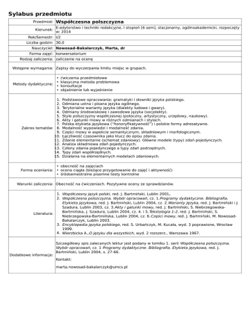 Sylabus przedmiotu Przedmiot: Współczesna polszczyzna E-edytorstwo i techniki redakcyjne, I stopień [6 sem], stacjonarny, ogólnoakademicki, rozpoczęty Kierunek: w: 2014 Rok/Semestr: I/2 Liczba godzin: 30,0 Nauczyciel: Nowosad-Bakalarczyk, Marta, dr Forma zajęć: konwersatorium Rodzaj zaliczenia: zaliczenie na ocenę Wstępne wymagania: Zapisy do wyczerpania limitu miejsc w grupach. • • Metody dydaktyczne: • • 1. 2. 3. 4. 5. 6. 7. Zakres tematów: 8. 9. 10. 11. 12. 13. 14. 15. ćwiczenia przedmiotowe klasyczna metoda problemowa konsultacje objaśnienie lub wyjaśnienie Podstawowe opracowania: gramatyki i słowniki języka polskiego. Odmiana ustna i pisana języka ogólnego. Terytorialne warianty języka (dialekty ludowe i gwary). Odmiany środowiskowe i zawodowe języka (socjolekty). Style polszczyzny współczesnej (potoczny, artystyczny, urzędowy, naukowy). Akty i gatunki mowy w różnych odmianach i stylach. Polska etykieta językowa (“honoryfikatywność”) i polskie formy adresatywne. Modalność wypowiedzi i modalność zdania. Części mowy w aspekcie semantycznym, składniowym i morfologicznym. Łączliwość czasownika jako klucz do opisu zdania. Zdanie elementarne (schemat zdaniowy). Główne modele (typy) zdań pojedynczych. Analiza składniowa zdań pojedynczych. Człony zdania pojedynczego a typy zdań podrzędnych. Typy zdań współrzędnych. Działania na elementarnych modelach zdaniowych. • obecność na zajęciach Forma oceniania: • ocena ciągła (bieżące przygotowanie do zajęć i aktywność) • śródsemestralne pisemne testy kontrolne Warunki zaliczenia: Obecność na ćwiczeniach. Pozytywne oceny ze sprawdzianów. 1. Współczesny język polski, red. J. Bartmiński, Lublin 2001. 2. Współczesna polszczyzna. Wybór opracowań , cz. 1.Programy dydaktyczne. Bibliografia. Etykieta językowa, red. J. Bartmiński, Lublin 2004, cz. 2.Warianty języka, red. J. Bartmiński i J. Szadura, Lublin 2003, cz. 3.Akty i gatunki mowy, red. J. Bartmiński, S. NiebrzegowskaBartmińska, J. Szadura, Lublin 2004, cz. 4. i 5. Tekstologia 1-2, red. J. Bartmiński, S. Literatura: Niebrzegowska-Bartmińska, Lublin 2004, cz. 6.Części mowy, red. J. Bartmiński, M. NowosadBakalarczyk, Lublin 2003. 3. Encyklopedia języka polskiego, red. S. Urbańczyk, M. Kucała, wyd. 3 poprawione, Wrocław 1999. 4. Wierzbicka A.,O języku dla wszystkich, wyd. 2 rozszerz., Warszawa 1967. Dodatkowe informacje: Szczegółowy spis zalecanych lektur jest podany w tomiku 1. serii Współczesna polszczyzna. Wybór opracowań, cz. 1 Programy dydaktyczne. Bibliografia. Etykieta językowa, red. J. Bartmiński, Lublin 2004, s. 27-66. Kontakt: [email protected]
