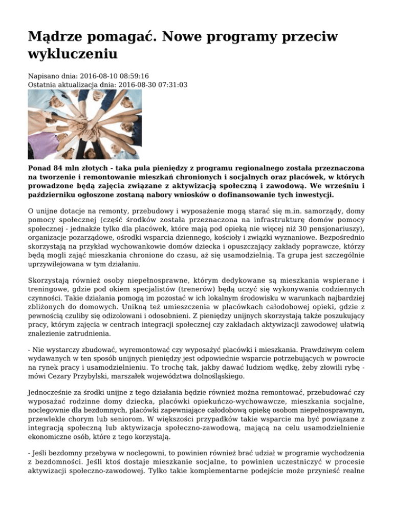 Mądrze pomagać. Nowe programy przeciw wykluczeniu Napisano dnia: 2016-08-10 08:59:16 Ostatnia aktualizacja dnia: 2016-08-30 07:31:03 Ponad 84 mln złotych - taka pula pieniędzy z programu regionalnego została przeznaczona na tworzenie i remontowanie mieszkań chronionych i socjalnych oraz placówek, w których prowadzone będą zajęcia związane z aktywizacją społeczną i zawodową. We wrześniu i październiku ogłoszone zostaną nabory wniosków o dofinansowanie tych inwestycji. O unijne dotacje na remonty, przebudowy i wyposażenie mogą starać się m.in. samorządy, domy pomocy społecznej (część środków została przeznaczona na infrastrukturę domów pomocy społecznej - jednakże tylko dla placówek, które mają pod opieką nie więcej niż 30 pensjonariuszy), organizacje pozarządowe, ośrodki wsparcia dziennego, kościoły i związki wyznaniowe. Bezpośrednio skorzystają na przykład wychowankowie domów dziecka i opuszczający zakłady poprawcze, którzy będą mogli zająć mieszkania chronione do czasu, aż się usamodzielnią. Ta grupa jest szczególnie uprzywilejowana w tym działaniu. Skorzystają również osoby niepełnosprawne, którym dedykowane są mieszkania wspierane i treningowe, gdzie pod okiem specjalistów (trenerów) będą uczyć się wykonywania codziennych czynności. Takie działania pomogą im pozostać w ich lokalnym środowisku w warunkach najbardziej zbliżonych do domowych. Unikną też umieszczenia w placówkach całodobowej opieki, gdzie z pewnością czuliby się odizolowani i odosobnieni. Z pieniędzy unijnych skorzystają także poszukujący pracy, którym zajęcia w centrach integracji społecznej czy zakładach aktywizacji zawodowej ułatwią znalezienie zatrudnienia. - Nie wystarczy zbudować, wyremontować czy wyposażyć placówki i mieszkania. Prawdziwym celem wydawanych w ten sposób unijnych pieniędzy jest odpowiednie wsparcie potrzebujących w powrocie na rynek pracy i usamodzielnieniu. To trochę tak, jakby dawać ludziom wędkę, żeby złowili rybę mówi Cezary Przybylski, marszałek województwa dolnośląskiego. Jednocześnie za środki unijne z tego działania będzie również można remontować, przebudować czy wyposażać rodzinne domy dziecka, placówki opiekuńczo-wychowawcze, mieszkania socjalne, noclegownie dla bezdomnych, placówki zapewniające całodobową opiekę osobom niepełnosprawnym, przewlekle chorym lub seniorom. W większości przypadków takie wsparcie ma być powiązane z integracją społeczną lub aktywizacja społeczno-zawodową, mającą na celu usamodzielnienie ekonomiczne osób, które z tego korzystają. - Jeśli bezdomny przebywa w noclegowni, to powinien również brać udział w programie wychodzenia z bezdomności. Jeśli ktoś dostaje mieszkanie socjalne, to powinien uczestniczyć w procesie aktywizacji społeczno-zawodowej. Tylko takie komplementarne podejście może przynieść realne efekty - wyjaśnia marszałek. www.rpo.dolnyslask.pl