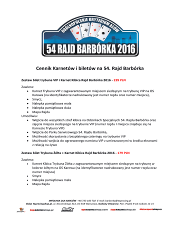 Cennik Karnetów i biletów na 54. Rajd Barbórka Zestaw bilet trybuna VIP i Karnet Kibica Rajd Barbórka 2016 - 239 PLN Zawiera: Karnet Trybuna VIP z zagwarantowanym miejscem siedzącym na trybunę VIP na OS Karowa (na identyfikatorze nadrukowany jest numer rzędu oraz numer miejsca), Smycz, Nalepka pamiątkowa mała Nalepka pamiątkowa duża Mapa Rajdu Umożliwia: Wejście do wszystkich stref kibica na Odcinkach Specjalnych 54. Rajdu Barbórka oraz zajęcia miejsca siedzącego na trybunie VIP (numer rzędu I miejsca znajduje się na Karnecie Trybuna VIP) Wejście do Parku Serwisowego 54. Rajdu Barbórka, Możliwość skorzystania z bezpłatnego cateringu na trybunie VIP Możliwość wejścia do ogrzewanego namiotu VIP z umieszczonymi w środku ekranami z relacją na żywo Zestaw bilet Trybuna Żółta + Karnet Kibica Rajd Barbórka 2016 - 179 PLN Zawiera: Karnet Kibica Trybuna Żółta z zagwarantowanym miejscem siedzącym na trybunę w kolorze żółtym na OS Karowa (na identyfikatorze nadrukowany jest numer rzędu oraz numer miejsca) Smycz Nalepka pamiątkowa mała Mapa Rajdu INFOLINIA DLA KIBICÓW +48 733 100 702 E-mail: [email protected] Sklep Topracingshop.pl, ul. Nocznickiego 31A, 01-918 Warszawa, Godziny Otwarcia: Pon.-Piątek 9-18; Sobota 11-15 Umożliwia: wejście na wszystkie odcinki specjalne Rajdu Barbórka oraz zajęcia miejsca siedzącego na trybunie Żółtej (numer rzędu I miejsca znajduje się na Karnecie Trybuna Żółta) Wejście do Parku Serwisowego 54. Rajdu Barbórka Uprawnia do zajęcia miejsca siedzącego na trybunie żółtej podczas OS Karowa Karnet Kibica – 59 PLN Zawiera: Karnet Kibica smycz pamiątkową Rajdu Barbórka Umożliwia: Wejście na wszystkie odcinki specjalne Rajdu Barbórka (miejsca stojące z wyłączeniem trybun) Bilet Jednorazowy OS Karowa Rajd Barbórka 2016 – 40 PLN Umożliwia: wejście na teren odcinka Karowa podczas 54. Rajdu Barbórka 2016 Bilet Jednorazowy OS Bemowo + Serwis Bemowo Rajd Barbórka 2016 – 30 PLN Umożliwia: wejście na teren odcinka Bemowo podczas 54. Rajdu Barbórka 2016 wejście na teren Parku Serwisowego podczas 54. Rajdu Barbórka 2016 Bilet Jednorazowy OS PTAK Warsaw Expo Rajd Barbórka 2016 – 30 PLN Umożliwia: wejście na teren odcinka PTAK Warsaw Expo podczas 54. Rajdu Barbórka 2016 INFOLINIA DLA KIBICÓW +48 733 100 702 E-mail: [email protected] Sklep Topracingshop.pl, ul. Nocznickiego 31A, 01-918 Warszawa, Godziny Otwarcia: Pon.-Piątek 9-18; Sobota 11-15 Bilet Jednorazowy OS Służewiec Rajd Barbórka 2016 – 30 PLN Umożliwia: wejście na teren odcinka Służewiec podczas 54. Rajdu Barbórka 2016 Bilet Trybuna PTAK Warsaw Expo Rajd Barbórka 2016 – 79 PLN Umożliwia: wstęp z zagwarantowanym miejscem siedzącym na trybunę na OS PTAK Warsaw Expo Bilet Trybuna Zielona Rajd Barbórka 2016 – 89 PLN Umożliwia: wstęp z zagwarantowanym miejscem stojącym na trybunę na OS Karowa Nalepka parkingowa Parking Gold Rajd Barbórka 2016 – 59 PLN Umożliwia: wjazd na specjalnie przygotowane parkingi w pobliżu wejść dla kibiców Nalepka Parking Gold NIE OBOWIĄZUJE na OS Karowa! Nalepka parkingowa Parking Karowa Rajd Barbórka 2016 – 49 PLN Umożliwia: wjazd na specjalnie przygotowany parking w pobliżu wejścia na OS Karowa INFOLINIA DLA KIBICÓW +48 733 100 702 E-mail: [email protected] Sklep Topracingshop.pl, ul. Nocznickiego 31A, 01-918 Warszawa, Godziny Otwarcia: Pon.-Piątek 9-18; Sobota 11-15