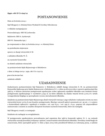 Sygn. akt II Cz 294/14 POSTANOWIENIE Dnia 22 kwietnia 2014 r. Sąd Okręgowy w Jeleniej Górze Wydział II Cywilny Odwoławczy w składzie następującym: Przewodniczący: SSO M.Lechowska Sędziowie: SSO A. Izydorczyk SSO W. Damaszko/spr./ po rozpoznaniu w dniu 22 kwietnia 2014 r. w Jeleniej Górze na posiedzeniu niejawnym sprawy ze skargi wierzyciela S. M. z udziałem dłużnika W. Ż. na czynności komornika na skutek zażalenia wierzyciela na postanowienie Sądu Rejonowego w Bolesławcu z dnia 12 lutego 2014 r. sygn. akt I Co 1141/13 p o s t a n a w i a: zażalenie oddalić. UZASADNIENIE Zaskarżonym postanowieniem Sąd Rejonowy w Bolesławcu oddalił skargę wierzyciela S. M. na postanowienie Komornika Sądowego przy Sądzie Rejonowym w Bolesławcu D. L. z dnia 19.08.2013 roku w sprawie egzekucyjnej Km 358/13, w którym umorzono postępowanie egzekucyjne wobec ogłoszenia upadłości dłużnika oraz ustalono koszty postępowania egzekucyjnego w wysokości 3.235 zł, na które składała się między innymi kwota 3.075 zł z tytułu wynagrodzenia biegłego za sporządzenie wyceny nieruchomości dłużnika. Zażalenie na postanowienie Sądu Rejonowego złożył wierzyciel wnosząc o jego uchylenie i nakazanie zwrotu na rzecz wierzyciela kwoty 3.075 zł oraz kosztów postępowania. Skarżący zarzucił sądowi naruszenie art. 39 ust. 1 i 2 ustawy o komornikach sądowych i egzekucji w związku z art. 942 k.p.c. i art. 945 § 1 k.p.c. poprzez ich nieprawidłowe zastosowanie i uznanie za zasadne obciążenie kosztami czynności komornika, które nie nastąpiły. Sąd Okręgowy zważył, co następuje: Zażalenie nie zasługuje na uwzględnienie. W postępowaniu egzekucyjnym prowadzonym pod sygnaturą Km 358/13 komornik sądowy D. L. na wniosek wierzyciela wszczął procedurę związaną z opisem i oszacowaniem nieruchomości dłużnika. Powołany został biegły do oszacowania, który sporządził operat i w dniu 4 lipca 2013 roku przedstawił fakturę za wykonaną pracę, a należne wynagrodzenie zostało mu wypłacone. Postanowieniem z dnia 18 lipca 2013 roku komornik zawiesił postępowanie egzekucyjne na podstawie art. 146 prawa upadłościowego z uwagi na ogłoszenie upadłości dłużnika. W dniu 2 sierpnia 2013 roku wierzyciel cofnął wniosek o opis i oszacowanie nieruchomości w związku z zawieszeniem postępowania egzekucyjnego . Komornik z mocy art. 942 k.p.c. obowiązany jest po upływie terminu określonego w wezwaniu dłużnika do zapłaty długu, na wniosek wierzyciela dokonać opisu i oszacowania zajętej nieruchomości. W niniejszej sprawie czynność powyższa ostatecznie nie doszła do skutku, ale wyłącznie z uwagi na ogłoszenie upadłości dłużnika. Natomiast wykonany został operat szacunkowy przez biegłego uprawnionego na podstawie art. 948. § 1 k.p.c. Cofnięcie przez wierzyciela wniosku o opis i oszacowanie nastąpiło już po sporządzeniu tego operatu i wypłaceniu wynagrodzenia biegłemu. Stosownie do art. 39 ust 1 ustawy z dnia z dnia 29 sierpnia 1997 roku o komornikach sądowych i egzekucji komornikowi należy się zwrot wydatków gotówkowych poniesionych w toku egzekucji między innymi związanych z należnościami biegłych. Nie było zatem uzasadnione żądanie przez wierzyciela zwrotu zaliczki na biegłego skoro czynność związana z wydatkami została dokonana zgodnie z powołanymi wyżej przepisami w zakresie opisu i oszacowania nieruchomości. Z tych względów zażalenie jako bezzasadne na podstawie przepisów art.385 k.p.c. w zw. z art.397 § 2 k.p.c. w zw. z art.13 § 2 k.p.c. podlegało oddaleniu.