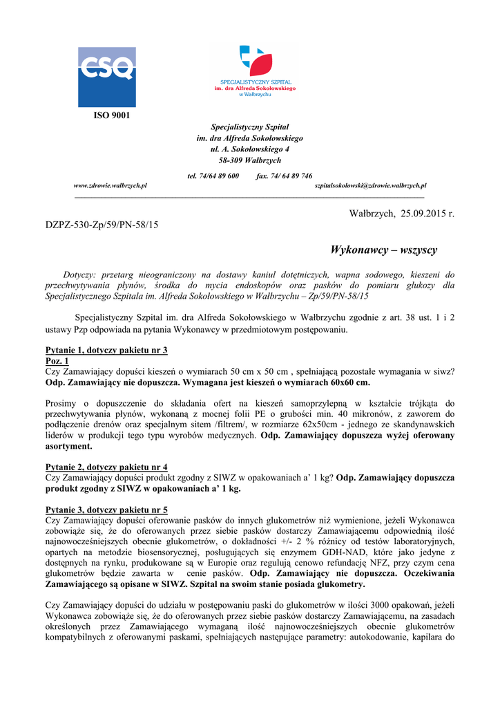 ISO 9001 Specjalistyczny Szpital im. dra Alfreda Sokołowskiego ul. A. Sokołowskiego 4 58-309 Wałbrzych tel. 74/64 89 600 fax. 74/ 64 89 746 www.zdrowie.walbrzych.pl [email protected] ________________________________________________________________________________________________________ Wałbrzych, 25.09.2015 r. DZPZ-530-Zp/59/PN-58/15 Wykonawcy – wszyscy Dotyczy: przetarg nieograniczony na dostawy kaniul dotętniczych, wapna sodowego, kieszeni do przechwytywania płynów, środka do mycia endoskopów oraz pasków do pomiaru glukozy dla Specjalistycznego Szpitala im. Alfreda Sokołowskiego w Wałbrzychu – Zp/59/PN-58/15 Specjalistyczny Szpital im. dra Alfreda Sokołowskiego w Wałbrzychu zgodnie z art. 38 ust. 1 i 2 ustawy Pzp odpowiada na pytania Wykonawcy w przedmiotowym postępowaniu. Pytanie 1, dotyczy pakietu nr 3 Poz. 1 Czy Zamawiający dopuści kieszeń o wymiarach 50 cm x 50 cm , spełniającą pozostałe wymagania w siwz? Odp. Zamawiający nie dopuszcza. Wymagana jest kieszeń o wymiarach 60x60 cm. Prosimy o dopuszczenie do składania ofert na kieszeń samoprzylepną w kształcie trójkąta do przechwytywania płynów, wykonaną z mocnej folii PE o grubości min. 40 mikronów, z zaworem do podłączenie drenów oraz specjalnym sitem /filtrem/, w rozmiarze 62x50cm - jednego ze skandynawskich liderów w produkcji tego typu wyrobów medycznych. Odp. Zamawiający dopuszcza wyŜej oferowany asortyment. Pytanie 2, dotyczy pakietu nr 4 Czy Zamawiający dopuści produkt zgodny z SIWZ w opakowaniach a’ 1 kg? Odp. Zamawiający dopuszcza produkt zgodny z SIWZ w opakowaniach a’ 1 kg. Pytanie 3, dotyczy pakietu nr 5 Czy Zamawiający dopuści oferowanie pasków do innych glukometrów niŜ wymienione, jeŜeli Wykonawca zobowiąŜe się, Ŝe do oferowanych przez siebie pasków dostarczy Zamawiającemu odpowiednią ilość najnowocześniejszych obecnie glukometrów, o dokładności +/- 2 % róŜnicy od testów laboratoryjnych, opartych na metodzie biosensorycznej, posługujących się enzymem GDH-NAD, które jako jedyne z dostępnych na rynku, produkowane są w Europie oraz regulują cenowo refundację NFZ, przy czym cena glukometrów będzie zawarta w cenie pasków. Odp. Zamawiający nie dopuszcza. Oczekiwania Zamawiającego są opisane w SIWZ. Szpital na swoim stanie posiada glukometry. Czy Zamawiający dopuści do udziału w postępowaniu paski do glukometrów w ilości 3000 opakowań, jeŜeli Wykonawca zobowiąŜe się, Ŝe do oferowanych przez siebie pasków dostarczy Zamawiającemu, na zasadach określonych przez Zamawiającego wymaganą ilość najnowocześniejszych obecnie glukometrów kompatybilnych z oferowanymi paskami, spełniających następujące parametry: autokodowanie, kapilara do automatycznego zasysania próbki krwi, metoda pomiaru biosensoryczna, zastosowany enzym GOD, moŜliwość alternatywnych miejsc nakłucia – dłoń, przedramię, standard ISO 15197:2013, o dokładności 95% indywidualnych wyników glukozy w zakresie ± 15 mg/dl przy stęŜeniu glukozy ˂ 100 mg/dl i ± 15% przy stęŜeniu glukozy ≥ 100 mg/dl, temperatura przechowywania pasków 4-30oC, temperatura wykonania pomiaru 10-40oC, ostrzeŜenie ketonowe pow. 240 mg/dl, zakres wyników 20-600 mg/dl, zakres hematokrytu 20-60%, kalibracja do osocza krwi, pomiar z krwi kapilarnej, próbka krwi 0,5 mikrolitra, czas pomiaru 5 sekund, brak kontaktu krwi z glukometrem, pobieranie krwi przez zasysanie, pamięć 500 pomiarów, bezkontaktowy i automatyczny wyrzut paska, zasilanie z ogólnodostępnych baterii typu AAA. Opakowania pasków po 50 szt., stabilne 3 miesiące po otwarciu opakowania. Zestaw do pomiaru poziomu zawartości glukozy we krwi jest przeznaczony do uŜytkowania zarówno w domu, przez osoby niebędące profesjonalnymi uŜytkownikami, jak i warunkach szpitalnych, przez personel medyczny. Odp. Zamawiający nie dopuści. Oczekiwania Zamawiającego są opisane w SIWZ (przedmiotem zamówienia są paski do glukometrów). Szpital na swoim stanie posiada glukometry. Czy w przypadku dopuszczenia produktu równowaŜnego Zamawiający wymaga, aby zaoferowane glukometry i paski testowe miały moŜliwość kontroli na 3 zakresach płynów kontrolnych – (prawidłowy, niski i wysoki) ? Odp. Oczekiwania Zamawiającego są opisane w SIWZ (przedmiotem zamówienia są paski do glukometrów). Szpital na swoim stanie posiada glukometry. Czy w przypadku dopuszczenia produktu równowaŜnego Zamawiający wymaga funkcji autokodowania, co w praktyce oznacza wyeliminowanie konieczności kodowania - po wprowadzeniu paska do glukometru nie są konieczne Ŝadne czynności potwierdzające ani sprawdzające uŜytkownika. Takie rozwiązanie ułatwia i przyspiesz pracę personelu. Odp. Oczekiwania Zamawiającego są opisane w SIWZ (przedmiotem zamówienia są paski do glukometrów). Szpital na swoim stanie posiada glukometry. Czy w przypadku dopuszczenia produktu równowaŜnego Zamawiający dopuści glukometry i paski testowe, gdzie konieczne jest sprawdzenie zgodności kodu na opakowaniu pasków i kodu na wyświetlaczu glukometru? Odp. Oczekiwania Zamawiającego są opisane w SIWZ (przedmiotem zamówienia są paski do glukometrów). Szpital na swoim stanie posiada glukometry. Czy w przypadku dopuszczenia produktu równowaŜnego Zamawiający wymaga funkcji „automatyczny wyrzut paska” ? Funkcja daje dodatkowe podniesienia bezpieczeństwa i higieny pracy- po badaniu personel nie ma styczności z materiałem biologicznym pacjenta. Odp. Oczekiwania Zamawiającego są opisane w SIWZ (przedmiotem zamówienia są paski do glukometrów). Szpital na swoim stanie posiada glukometry. Czy w przypadku dopuszczenia produktu równowaŜnego Zamawiający dopuści do udziału w postępowania paski i glukometry, które w instrukcjach uŜycia nie zawierają ostrzeŜeń o niedokładnych wynikach pomiarów u pacjentów z obniŜonym ciśnieniem, odwodnionych i znajdujących się w stanie powaŜnego wstrząsu oraz bardzo niskie lub niedokładn