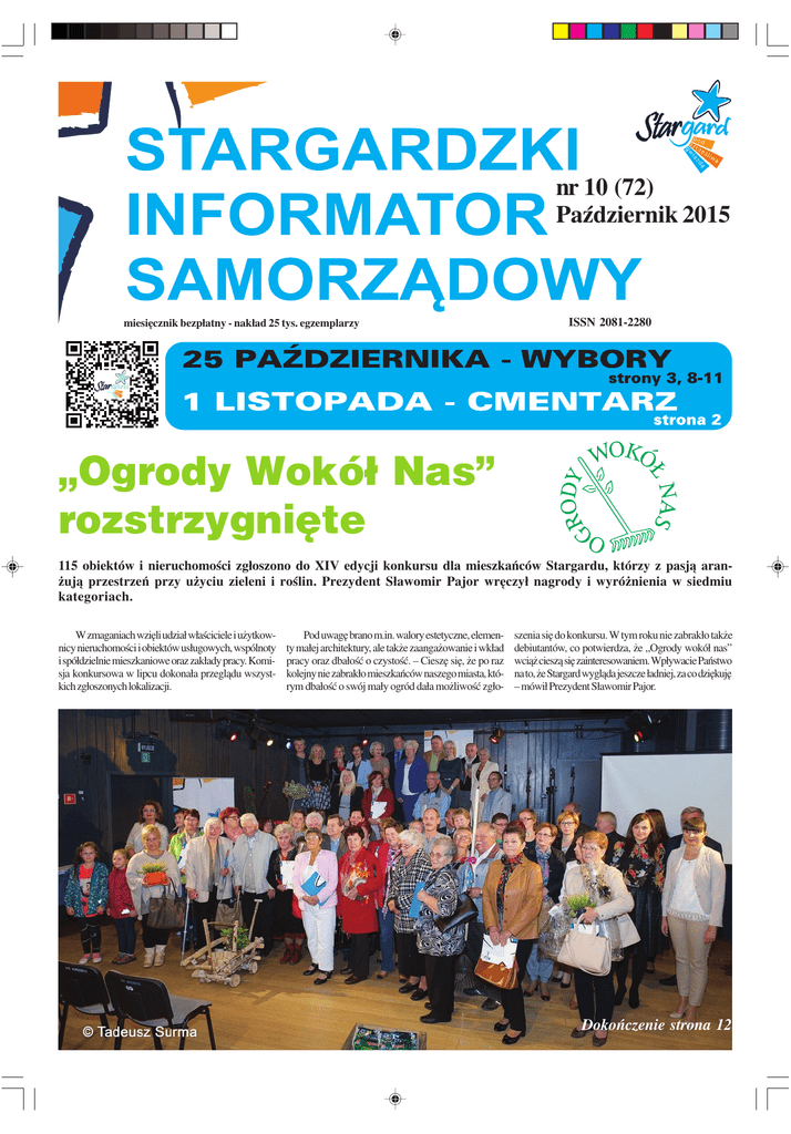 nr 10 (72) PaŸdziernik 2015 miesiêcznik bezp³atny - nak³ad 25 tys. egzemplarzy ISSN 2081-2280 „Ogrody Wokó³ Nas” rozstrzygniête 115 obiektów i nieruchomoœci zg³oszono do XIV edycji konkursu dla mieszkañców Stargardu, którzy z pasj¹ aran¿uj¹ przestrzeñ przy u¿yciu zieleni i roœlin. Prezydent S³awomir Pajor wrêczy³ nagrody i wyró¿nienia w siedmiu kategoriach. W zmaganiach wziêli udzia³ w³aœciciele i u¿ytkownicy nieruchomoœci i obiektów us³ugowych, wspólnoty i spó³dzielnie mieszkaniowe oraz zak³ady pracy. Komisja konkursowa w lipcu dokona³a przegl¹du wszystkich zg³oszonych lokalizacji. Pod uwagê brano m.in. walory estetyczne, elementy ma³ej architektury, ale tak¿e zaanga¿owanie i wk³ad pracy oraz dba³oœæ o czystoœæ. – Cieszê siê, ¿e po raz kolejny nie zabrak³o mieszkañców naszego miasta, którym dba³oœæ o swój ma³y ogród da³a mo¿liwoœæ zg³o- szenia siê do konkursu. W tym roku nie zabrak³o tak¿e debiutantów, co potwierdza, ¿e „Ogrody wokó³ nas” wci¹¿ ciesz¹ siê zainteresowaniem. Wp³ywacie Pañstwo na to, ¿e Stargard wygl¹da jeszcze ³adniej, za co dziêkujê – mówi³ Prezydent S³awomir Pajor. Dokoñczenie strona 12 2 DZIEÑ WSZYSTKICH ŒWIETYCH MZK na cmentarze za darmo 1 listopada dojazd do Cmentarzy Komunalnych komunikacj¹ miejsk¹ bêdzie bezp³atny. W Dniu Wszystkich Œwiêtych nie bêdzie trzeba kasowaæ biletów na liniach numer 1 i 18 oraz A i B. Jednoczeœnie zwiêkszona zostanie czêstotliwoœæ kursowania autobusów MZK do nowego Cmentarza Komunalnego (co 20 min). Rozk³ady jazdy linii obs³uguj¹cych trasy na Cmentarze Komunalne bêd¹ opublikowane na stronie www.stargard.pl. (RuM) Zmiany w organizacji ruchu W celu zapewnienia w³aœciwych warunków bezpieczeñstwa w rejonie Cmentarzy Komunalnych zostan¹ wy³¹czone z ruchu odcinki ulic. W dniu 31 paŸdziernika oraz 1 listopada w godzinach od 08.00 do 18.00: - odcinek ulicy Koœciuszki od wjazdu na parking sklepu Kaufland do skrzy¿owania z ulic¹ Spokojn¹, - odcinek ulicy Przedwioœnie wzd³u¿ starego Cmentarza Komunalnego. Z zamkniêtych odcinków ulic bêd¹ mog³y korzystaæ jedynie pojazdy MZK, TAXI oraz pojazdy zaopatrzenia za okazaniem zezwolenia. Zalecany dojazd do nowego Cmentarza Komunalnego (Gi¿ynek) ulic¹ Spokojn¹ i Przedwioœnie oraz od strony Golczewa. Dla przyjezdnych wyznaczono dodatkowe miejsca postojowe: - wzd³u¿ parku Batorego na poboczu po stronie parku - wzd³u¿ drogi ³¹cz¹cej ulicê Przedwioœnie z ulic¹ Spokojn¹ na poboczu wzd³u¿ ogrodzenia cmentarza. - na terenach zielonych przylegaj¹cych do ogrodzenia nowego Cmentarza Komunalnego. (JOn) KOMUNIKAT MIEJSKIEGO ZAK£ADU KOMUNIKACJI 31 paŸdziernika 2015r. (sobota) przewozy do cmentarzy bêd¹ realizowane autobusami linii komunikacyjnych nr 1 i 18 ze zwiêkszon¹ czêstotliwoœci¹ wg specjalnego rozk³adu jazdy. W rejon Cmentarza Komunalnego od strony Al. Gryfa mo¿na dojechaæ tak¿e autobusami linii nr 8 i 13. W dniu 1 listopada 2015r. Wszystkich Œwiêtych (niedziela) zamkniêta bêdzie ulica Koœciuszki na odcinku od wjazdu na parking przy Kauflandzie do skrzy¿owania z ulic¹ Spokojn¹. Dojazd do g³ównych bram cmentarzy autobusami MZK linii nr 1, 18, A i B jest bezp³atny. W dniu 1 listopada 2015r. bêdzie obowi¹zywa³ specjalny rozk³ad jazdy. Od godziny 9:00 do 17:00 autobusy linii nr 1,18, A i B bêd¹ doje¿d¿aæ do cmentarzy przy ulicach Koœciuszki i Spokojnej (Gi¿ynek) z czêstotliwoœci¹ co 10 do 15 minut. Czêœæ kursów linii 1 i 18 bêdzie rozpoczynaæ siê i koñczyæ na ul. Sienkiewicza. Autobusy linii 10, 12, 20 i Nocna bêd¹ rozpoczynaæ i koñczyæ kursowanie na przystanku „Pêtla Moniuszki”. Linia A – obs³uguje os. Pyrzyckie i os. Lotnisko autobus bêdzie kursowaæ w godz. 8:22 do 16:30 z czêstotliwoœci¹ co 20-30 minut. TRASA LINII A : Od Gi¿ynek przez: Spokojna, Bogus³awa IV, Staszica, Warszawska, Niepodleg³oœci, Powstañców Warszawy, Armii Krajowej, Broniewskiego, Lelewela, Lotników, do Tañskiego – POWRÓT T¥ SAM¥ TRAS¥. Linia B – obs³uguje os. Chopina i os. Zachód autobus bêdzie kursowaæ w godz. 9:19 do 16:36 z czêstotliwoœci¹ co 40 minut. TRASA LINII B : Od Gi¿ynek przez: Spokojna, Koœciuszki, S³oneczna, Szczeciñska, “do Wieniawskiego – POWRÓT T¥ SAM¥ TRAS¥. W rejon Cmentarza Komunalnego od strony Al. Gryfa mo¿na dojechaæ tak¿e autobusami linii nr 8 i 13. O godz. 11.00 z Koszewa odjedzie autobus przez Koszewko, Wierzchl¹d, Skalin, Kunowo, Lipnik przez ul.Koœciuszki (brama g³ówna Cmentarza Komunalnego) do Pêtli Gi¿ynek (nowy cmentarz). Powrót o godz.16:00 z Pêtli Gi¿ynek przez ul. Spokojn¹ (przystanek przed rondem), Koœciuszki, Szczeciñsk¹, Kunowo, Skalin, Koszewko, Koszew. 2 listopada (poniedzia³ek) przewozy do cmentarzy bêd¹ realizowane autobusami linii komunikacyjnych nr 1 i 18 ze zwiêkszon¹ czêstotliwoœci¹, oraz lini¹ 28 zgodnie z rozk³adem jazdy. Dodatkowe informacje mo¿na uzyskaæ pod numerami telefonów 91-573-24-46, 91-577-24-49, 91-573-13-82 SCHEMAT TYMCZASOWEJ ORGANIZACJI RUCHU w dniach 31.10 - 1.11.2015r. w rejonie cmentarzy komunalnych obowi¹zuj¹ca od godz. 8.00 do godz.18.00 s.2 ZMIENIAMY STARGARD - Stargardzki Informator Samorz¹dowy - nr 10/2015 3 WYBORY PARLAMENTARNE G³osowanie poza miejscem zameldowania Wyborca zamierzaj¹cy g³osowaæ w obwodzie g³osowania poza miejscem sta³ego zamieszkania mo¿e otrzymaæ zaœwiadczenie o prawie do g³osowania. Z zaœwiadczeniem mo¿na g³osowaæ w dowolnym obwodzie g³osowania w kraju, za granic¹ oraz na polskich statkach morskich. Do odbioru zaœwiadczenia wyborca mo¿e upo- wie do g³osowania zostanie z urzêdu skreœlony ze Wniosek o wydanie zaœwiadczenia o prawie do g³osowania sk³adamy w urzêdzie gminy, w której wa¿niæ inn¹ osobê. Wówczas wyborca sporz¹dza spisu wyborców, w którym dotychczas by³ ujêty. Nale¿y zwróciæ szczególn¹ uwagê, aby nie utrawyborca jest ujêty