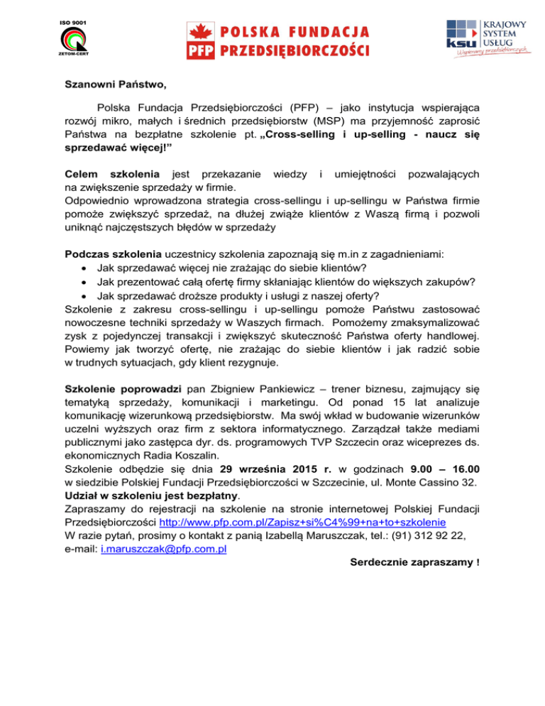 ISO 9001 ZETOM-CERT Szanowni Państwo, Polska Fundacja Przedsiębiorczości (PFP) – jako instytucja wspierająca rozwój mikro, małych i średnich przedsiębiorstw (MSP) ma przyjemność zaprosić Państwa na bezpłatne szkolenie pt. „Cross-selling i up-selling - naucz się sprzedawać więcej!” Celem szkolenia jest przekazanie wiedzy i umiejętności pozwalających na zwiększenie sprzedaży w firmie. Odpowiednio wprowadzona strategia cross-sellingu i up-sellingu w Państwa firmie pomoże zwiększyć sprzedaż, na dłużej zwiąże klientów z Waszą firmą i pozwoli uniknąć najczęstszych błędów w sprzedaży Podczas szkolenia uczestnicy szkolenia zapoznają się m.in z zagadnieniami: Jak sprzedawać więcej nie zrażając do siebie klientów? Jak prezentować całą ofertę firmy skłaniając klientów do większych zakupów? Jak sprzedawać droższe produkty i usługi z naszej oferty? Szkolenie z zakresu cross-sellingu i up-sellingu pomoże Państwu zastosować nowoczesne techniki sprzedaży w Waszych firmach. Pomożemy zmaksymalizować zysk z pojedynczej transakcji i zwiększyć skuteczność Państwa oferty handlowej. Powiemy jak tworzyć ofertę, nie zrażając do siebie klientów i jak radzić sobie w trudnych sytuacjach, gdy klient rezygnuje. Szkolenie poprowadzi pan Zbigniew Pankiewicz – trener biznesu, zajmujący się tematyką sprzedaży, komunikacji i marketingu. Od ponad 15 lat analizuje komunikację wizerunkową przedsiębiorstw. Ma swój wkład w budowanie wizerunków uczelni wyższych oraz firm z sektora informatycznego. Zarządzał także mediami publicznymi jako zastępca dyr. ds. programowych TVP Szczecin oraz wiceprezes ds. ekonomicznych Radia Koszalin. Szkolenie odbędzie się dnia 29 września 2015 r. w godzinach 9.00 – 16.00 w siedzibie Polskiej Fundacji Przedsiębiorczości w Szczecinie, ul. Monte Cassino 32. Udział w szkoleniu jest bezpłatny. Zapraszamy do rejestracji na szkolenie na stronie internetowej Polskiej Fundacji Przedsiębiorczości http://www.pfp.com.pl/Zapisz+si%C4%99+na+to+szkolenie W razie pytań, prosimy o kontakt z panią Izabellą Maruszczak, tel.: (91) 312 92 22, e-mail: [email protected] Serdecznie zapraszamy ! ISO 9001 ZETOM-CERT Program szkolenia Temat zajęć Godzina 9.00 – 09.15 Powitanie uczestników i wprowadzenie 9.15 – 10.30 Idea cross-sellingu i up-selingu (C/A) Sprzedaż krzyżowa jako sposób na zwiększenie obrotów Sprzedaż dodatkowa - podnoszenie wartości oferowanych usług i produktów Analiza studium przypadku firm, które stosują metody C/A 10.30 – 10.45 Przerwa 10.45 – 12.15 Analiza własnej oferty pod kątem możiwości wprowadzenia zasad cross-sellingu i up-sellingu Wykorzystanie wiedzy marketingowej w budowaniu własnej oferty C/A Wybór produktów/usług do kampanii C/A Wybór klientów do których zostanie skierowana oferta C/A Opracowanie strategii działania 12.15 – 12.30 Przerwa 12.30 – 14.15 Rozmowa sprzedażowa z wykorzystaniem technik crosssellingu/up-sellingu Narzędzia cross i up - sellingu Trening tworzenia struktury rozmowy sprzedażowej Stosowanie formuły - cechy - zalety - korzyści 14.15 – 14.30 Przerwa 14.30 – 16.00 Sposoby radzenia sobie w momentach trudnych i kluczowych dla procesu sprzedaży Usuwanie obiekcji klienta Odpowiedzi na trudne pytania Reagowanie na odmowę klienta Jak NIE manipulować klientem 16.00 Zakończenie szkolenia