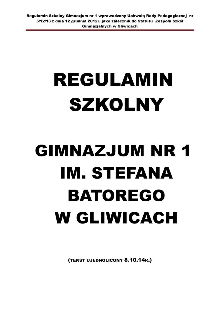 Regulamin Szkolny Gimnazjum nr 1 wprowadzony Uchwałą Rady Pedagogicznej nr 5/12/13 z dnia 12 grudnia 2012r. jako załącznik do Statutu Zespołu Szkół Gimnazjalnych w Gliwicach REGULAMIN SZKOLNY GIMNAZJUM NR 1 IM. STEFANA BATOREGO W GLIWICACH (TEKST UJEDNOLICONY 8.10.14R.) Regulamin Szkolny Gimnazjum nr 1 wprowadzony Uchwałą Rady Pedagogicznej nr 5/12/13 z dnia 12 grudnia 2012r. jako załącznik do Statutu Zespołu Szkół Gimnazjalnych w Gliwicach WSTĘP Niniejszy Regulamin Szkolny Gimnazjum nr 1 im. Stefana Batorego w Zespole Szkół Gimnazjalnych w Gliwicach został ustalony na podstawie Ustawy z dnia 7 września 1991 roku o systemie oświaty (Dz. U. z 2004 r. Nr 256, poz. 2572 z późniejszymi zmianami) i stanowi integralną część Statutu Szkoły. Rozdział I Organizacja dnia szkolnego 1. Uczniowie przychodzą do szkoły punktualnie, zgodnie z planem lekcji, zostawiają wierzchnie okrycie w szatni i przechodzą pod wyznaczoną salę lekcyjną. 2. Po zakończeniu ostatniej w danym dniu lekcji uczniowie schodzą do szatni. 3. Bezwzględnie zabronione jest samowolne opuszczanie terenu szkoły w czasie trwania zajęć – podczas lekcji i przerw. Każdorazowe wykroczenie ucznia odnotowane będzie przez wychowawcę klasy i przekazane do wiadomości rodzicom (prawnym opiekunom) na zebraniu lub konsultacjach. 4. Uczniowie dojeżdżający korzystają z autokarów zgodnie z ustalonym harmonogramem oraz regulaminem dojazdów: - uczniowie bezpośrednio z autobusu wchodzą do budynku szkolnego, - uczniowie oczekujący na autobus są pod opieką pracownika szkoły wyznaczonego przez organ prowadzący. Regulamin Szkolny Gimnazjum nr 1 wprowadzony Uchwałą Rady Pedagogicznej nr 5/12/13 z dnia 12 grudnia 2012r. jako załącznik do Statutu Zespołu Szkół Gimnazjalnych w Gliwicach - udział w zajęciach opiekuńczych jest obowiązkowy. 5. Uczniowie nie uczęszczający na lekcję religii przebywają w czasie trwania zajęć w świetlicy w godzinach jej pracy pod opieką wychowawcy świetlicy lub w bibliotece szkolnej pod opieką nauczyciela bibliotekarza. W przypadku zastępstwa (z wyjątkiem lekcji pierwszej i ostatniej) biorą udział w innych zajęciach lekcyjnych zorganizowanych za lekcję religii. 6. Uczniowie zwolnieni z lekcji wychowania fizycznego przebywają w czasie trwania zajęć pod opieką nauczyciela. Jeśli zajęcia wychowania fizycznego są odwołane, na pierwszej lub ostatniej lekcji, nauczyciel może zwolnić ucznia na pisemny wniosek rodzica (prawnego opiekuna). Rozdział II Zasady korzystania z pomieszczeń i urządzeń szkolnych 1. Uczniowie mogą korzystać ze wszystkich pomieszczeń i urządzeń szkolnych w czasie lekcji, zajęć pozalekcyjnych i przerw tylko pod opieką nauczyciela lub innego pracownika szkoły. 2. Każdy uczeń zobowiązany jest dbać o mienie szkoły. 3. Klasy zamykane są na czas trwania przerw międzylekcyjnych. Uczeń może wejść do sal szkolnych tylko pod opieką pracownika szkoły. 4. Uczniowie mają obowiązek przestrzegać regulaminu poszczególnych pracowni, z którym zostają zapoznani na początku roku szkolnego. 5. Każdy uczeń zobowiązany jest do przestrzegania przepisów Regulamin Szkolny Gimnazjum nr 1 wprowadzony Uchwałą Rady Pedagogicznej nr 5/12/13 z dnia 12 grudnia 2012r. jako załącznik do Statutu Zespołu Szkół Gimnazjalnych w Gliwicach BHP. Uczeń powinien dbać o zdrowie i bezpieczeństwo własne i innych osób. Każdy najmniejszy wypadek należy natychmiast zgłaszać nauczycielowi. 6. W czasie przerwy uczeń powinien przebywać w pobliżu sali lekcyjnej, w której będzie miał następne zajęcia. Wyjątkiem od tej reguły jest sytuacja, w której nauczyciel dyżurujący zaleci uczniowi inne miejsce spędzania przerwy. 1) nie wolno przebywać na schodach i półpiętrach; poruszając się po klatce schodowej obowiązuje ruch prawostronny, 2) uczniowie są zobowiązani do przychodzenia na lekcję wychowania fizycznego pięć minut przed dzwonkiem. Zakazuje się oczekiwania/przebywania w czasie przerwy na półpiętrze przed łącznikiem i na schodach, 3) za czystość pod daną salą lekcyjną odpowiedzialna jest klasa, która oczekiwała na rozpoczęcie lekcji. 7. Uczniowie mogą korzystać ze sklepiku szkolnego wyłącznie podczas przerw. Nie wolno wynosić poza teren sklepiku gorących napojów i ciepłego jedzenia (np. zapiekanek, pizzy itp.). 8. Z boiska szkolnego uczniowie korzystają w czasie zajęć lekcyjnych pod opieką nauczyciela przedmiotu. 9. Szkolny radiowęzeł służy przekazywaniu informacji i aktualnych audycji. Z radiowęzła mogą korzystać uczniowie tylko pod opieką nauczyciela. 10. Rodzice lub prawni opiekunowie ucznia ponoszą Regulamin Szkolny Gimnazjum nr 1 wprowadzony Uchwałą Rady Pedagogicznej nr 5/12/13 z dnia 12 grudnia 2012r. jako załącznik do Statutu Zespołu Szkół Gimnazjalnych w Gliwicach odpowiedzialność materialną za zniszczenia dokonane przez ich dziecko na terenie szkoły. 11. Uczniowie zobowiązani są do korzystania z szatni szkolnej zgodnie regulaminem szatni. Rozdział III Wygląd ucznia 1. W szkole obowiązuje skromny ubiór i fryzura. Strój ucznia musi być estetyczny, czysty, kolory stonowane. 2. Uczeń powinien dbać o higienę osobistą, schludny wygląd, estetyczną fryzurę, czystą odzież i obuwie. Wskazane jest obuwie umożliwiające bezpieczne poruszanie się. 3. W szkole zabronione jest: 1) noszenie niestosownych ubrań (np. przedstawiających treści wulgarne lub agresywne, obcisłych, odkrywających nadmiernie ciało, głębokich dekoltów, itp.) oraz stroju lub pojedynczych jego elementów wskazujących na przynależność do nieformalnych grup subkultury (np. szalików, bluz, t - shirtów z logo drużyn piłkarskich), 2) noszenie ekstrawaganckich fryzur (np. dredów, irokezów), biżuterii i ozdób, makijażu, farbowanie włosów, stosowanie ekstrawaganckiej stylizacji paznokci, 3) noszenie kolczyków w nosie, brodzie, łuku brwiowym, policzku, wa
