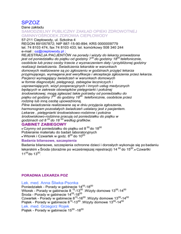 SPZOZ Dane zakładu SAMODZIELNY PUBLICZNY ZAKŁAD OPIEKI ZDROWOTNEJ GMINNYOŚRODEK ZDROWIA CIEPŁOWODY 57-211 Ciepłowody, ul. Szkolna 4 REGON 891057872; NIP 887-15-90-894; KRS 0000009779 tel. 74 8103 474, fax 74 8103 433; tel. komórkowy 508 340 244 e-mail : [email protected] ; REJESTRACJA PACJENTÓW na porady i wizyty do lekarzy prowadzona jest od poniedziałku do piątku od godziny 730 do godziny 1800 telefonicznie, osobiście lub przez osoby trzecie z wyznaczeniem daty i przybliżonej godziny realizacji świadczenia. Świadczenia lekarskie w warunkach domowych realizowane są po zgłoszeniu w godzinach przyjęć lekarza przyjmującego, wymagana jest weryfikacja i akceptacja zgłoszenia przez lekarza. Pacjenci wymagający świadczeń w warunkach domowych w formie diagnostyki, pielęgnacji, zabiegów leczniczych i usprawniających, wizyt pooperacyjnych i innych usług medycznych będących w zakresie obowiązków pielęgniarki i położnej środowiskowej, mogą zgłaszać takie potrzeby od poniedziałku do piątku od godziny 730 do godziny 1800 telefonicznie, osobiście przez rodzinę lub inną osobę upoważnioną. Pilne świadczenia realizowane są w dniu przyjęcia zgłoszenia, harmonogram pozostałych świadczeń ustalany jest z pacjentem. Lekarze , pielęgniarki środowiskowo-rodzinne i położna środowiskowo-rodzinna pracują od poniedziałku do piątku w godzinach od 8 00 do 18 00 według grafików. GABINET ZABIEGOWY Czynny od poniedziałku do piątku od 8 00 do 1800 Pobieranie materiału do badań laboratoryjnych Wtorek i Czwartek w godz. 800 do 1000 Badania bilansowe, szczepienia Badania bilansowe, szczepienia ochronne dzieci i dorosłych wykonuje się po badaniu lekarskim Środa (doraźnie po wcześniejszej rejestracji) 14 00 do 1500, Czwartki 1100do 1300. PORADNIA LEKARZA POZ Lek. med. Anna Śliwka-Psonka Poniedziałek - Porady w gabinecie 1400-1800 Wtorek - Porady w gabinecie 8 15-1300 .Wizyty domowe 1300-1400 Środa - Porady w gabinecie 1400-1800 Czwartek - Porady w gabinecie 815-1600 .Wizyty domowe 1300-1400 Piątek - Porady w gabinecie 815-1300 .Wizyty domowe 1300-1400 Lek. med. Grzegorz Rojek Piątek - Porady w gabinecie 1500 -1800 Lek. med. Andrzej Kornafel Wtorek - porady w gabinecie 1600 – 1800 Lek. medycyny rodzinnej Sławomir Wójciak Poniedziałek - Porady w gabinecie 800 -1200. Wizyty domowe 1200-1300 Środa - Porady w gabinecie 800 -1200 Czwartek – od 1400-1800 REHABILITACJA (zab.odpłatne) Rehabilitant: Ewelina Jaźwińska poniedziałek, wtorek, środa, czwartek, piątek- 800 do 1500 ( w tym zabiegi w domu pacjenta lub wg ustaleń z pacjentem) Rejestracja z wyprzedzeniem – na zabiegi obowiązuje skierowanie od lekarza. RADA SPOŁECZNA Przy Samodzielnym Publicznym Zakładzie Opieki Zdrowotnej Gminnym Ośrodku Zdrowia w Ciepłowodach działa Rada Społeczna, powołana Uchwałą nr 23/III/15 Rady Gminy w Ciepłowodach z dnia 28 stycznia 2015 r. .w sprawie powołania Rady Społecznej przy Samodzielnym Publicznym Zakładzie Opieki Zdrowotnej Gminnym Ośrodku Zdrowia w Ciepłowodach w składzie: Łukasz Białkowski – Wójt Gminy Ciepłowody, przewodniczący Ewa Lepka– przedstawiciel Rady Gminy Ciepłowody, członek Edyta Pięta– przedstawiciel Rady Gminy Ciepłowody, członek •Paweł Kopeć- przedstawiciel Rady Gminy Ciepłowody, członek Bogumiła Bajtek– przedstawiciel Wojewody Dolnośląskiego, członek Rada Społeczna jest organem: 1) inicjującym i opiniodawczym podmiotu tworzącego; 2) doradczym kierownika. Do zadań Rady Społecznej należy: 1) przedstawianie podmiotowi tworzącemu wniosków i opinii w sprawach: a) zbycia aktywów trwałych oraz zakupu lub przyjęcia darowizny nowej aparatury i sprzętu medycznego, b) związanych z przekształceniem lub likwidacją, rozszerzeniem lub ograniczeniem działalności, c) przyznawania kierownikowi nagród, d) rozwiązania stosunku pracy lub umowy cywilnoprawnej z kierownikiem, e) regulaminu organizacyjnego; 2) przedstawianie kierownikowi wniosków i opinii w sprawach: a) planu finansowego, w tym planu inwestycyjnego, b) rocznego sprawozdania z planu finansowego, w tym planu inwestycyjnego, c) kredytów bankowych lub dotacji, d) podziału zysku; 3) dokonywanie okresowych analiz skarg i wniosków wnoszonych przez pacjentów, z wyłączeniem spraw podlegających nadzorowi medycznemu; 4) opiniowanie wniosku w sprawie czasowego zaprzestania działalności leczniczej; 5) wykonywanie innych zadań określonych w ustawie i statucie. OD 1 STYCZNIA 2015 roku POMOC NOCNA I ŚWIĄTECZNA na ternie powiatu ząbkowickiego udzielana jest pacjentom w godz. od 18 00 do 800 w soboty niedziele i święta - całą dobę w SZPITALU ul.Chrobrego 5 ; 57-200 Ząbkowice Śl. tel. 74/ 6413400 tel. 74/6413410 Zasady świadczenia pomocy nocnej i świątecznej Porady udzielane są w warunkach ambulatoryjnych a w przypadkach medycznie uzasadnionych – w domu pacjenta. Skorzystanie ze świadczeń POZ w nocy i święta uzasadniają np. zaostrzenie dolegliwości występującej już choroby przewlekłej (kolejny atak astmy z umiarkowana dusznością infekcja dróg oddechowych z wysoką gorączką, szczególnie u małych dzieci i osób starszych. silne bóle brzucha i głowy biegunka i wymioty ,szczególnie u dzieci i osób starszych zatrzymanie moczu zaburzenia psychiczne (w przypadku agresji lub próby samobójczej należy wezwać pogotowie) Pacjentom przysługują także zabiegi pielęgniarskie w ramach porady udzielonej przez lekarza dyżurującego oraz zabiegi wynikające z ciągłości leczenia zlecone przez lekarzy poz do wykonywania w domu pacjenta. W ramach nocnej i świątecznej opieki lekarskiej nie można uzyskać: wizyty kontrolnej w związku z wcześniej rozpoczętym leczeniem, powtórki leków rutynowego zaświadczenia ostanie zdrowia PRZYDATNE INFORMACJE Zgodnie z nowelizacją ustawy z dnia 27 sierpnia 2007 r. o świadczeniach opieki zdrowotnej finansowanych ze środków publicznych. (Dz. U. Nr 210. 2135 z późn. zm.