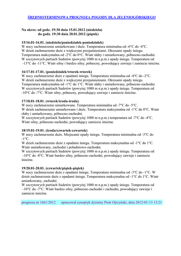 ŚREDNIOTERMINOWA PROGNOZA POGODY DLA JELENIOGÓRSKIEGO Na okres: od godz. 19:30 dnia 15.01.2012 (niedziela) do godz. 19:30 dnia 20.01.2012 (piątek) 15/16.01-16.01. (niedziela/poniedziałek-poniedziałek) W nocy zachmurzenie umiarkowane i duże. Temperatura minimalna od -6°C do -4°C. W dzień zachmurzenie duże z większymi przejaśnieniami. Okresami opady śniegu. Temperatura maksymalna od -2°C do 0°C. Wiatr słaby i umiarkowany, północno-zachodni. W szczytowych partiach Sudetów (powyżej 1000 m n.p.m.) opady śniegu. Temperatura od -13°C do -11°C. Wiatr silny i bardzo silny, północny, powodujący zawieje i zamiecie śnieżne. 16/17.01-17.01. (poniedziałek/wtorek-wtorek) W nocy zachmurzenie duże z opadami śniegu. Temperatura minimalna od -4°C do -2°C. W dzień zachmurzenie duże z większymi przejaśnieniami. Okresami opady śniegu. Temperatura maksymalna od -1°C do 1°C. Wiatr słaby i umiarkowany, północno-zachodni. W szczytowych partiach Sudetów (powyżej 1000 m n.p.m.) opady śniegu. Temperatura od -10°C do -7°C. Wiatr silny, północny, powodujący zawieje i zamiecie śnieżne. 17/18.01-18.01. (wtorek/środa-środa) W nocy zachmurzenie umiarkowane. Temperatura minimalna od -7°C do -5°C. W dzień zachmurzenie umiarkowane i duże. Temperatura maksymalna od -1°C do 0°C. Wiatr słaby i umiarkowany, północno-zachodni. W szczytowych partiach Sudetów (powyżej 1000 m n.p.m.) temperatura od -7°C do -4°C. Wiatr silny, północno-zachodni, powodujący zamiecie śnieżne. 18/19.01-19.01. (środa/czwartek-czwartek) W nocy zachmurzenie duże. Miejscami opady śniegu. Temperatura minimalna od -3°C do -1°C. W dzień zachmurzenie duże z opadami śniegu. Temperatura maksymalna od -1°C do 1°C. Wiatr umiarkowany, zachodni i południowo-zachodni. W szczytowych partiach Sudetów (powyżej 1000 m n.p.m.) opady śniegu. Temperatura od -10°C do -8°C. Wiatr bardzo silny, północno-zachodni, powodujący zawieje i zamiecie śnieżne. 19/20.01-20.01. (czwartek/piątek-piątek) W nocy zachmurzenie duże z opadami śniegu. Temperatura minimalna od -3°C do -1°C. W dzień zachmurzenie duże z opadami śniegu. Temperatura maksymalna od -1°C do 1°C. Wiatr umiarkowany, zachodni. W szczytowych partiach Sudetów (powyżej 1000 m n.p.m.) opady śniegu. Temperatura od -10°C do -7°C. Wiatr bardzo silny, północno-zachodni i zachodni, powodujący zawieje i zamiecie śnieżne. prognoza nr 1661/2012 opracował synoptyk dyżurny Piotr Ojrzyński, dnia 2012-01-13 13:21